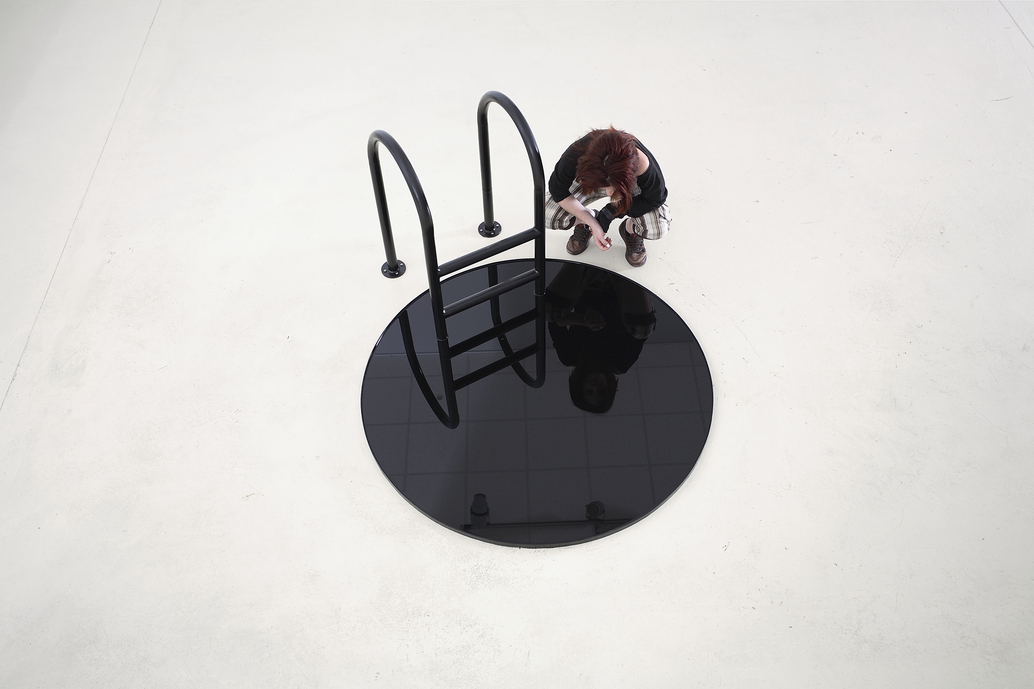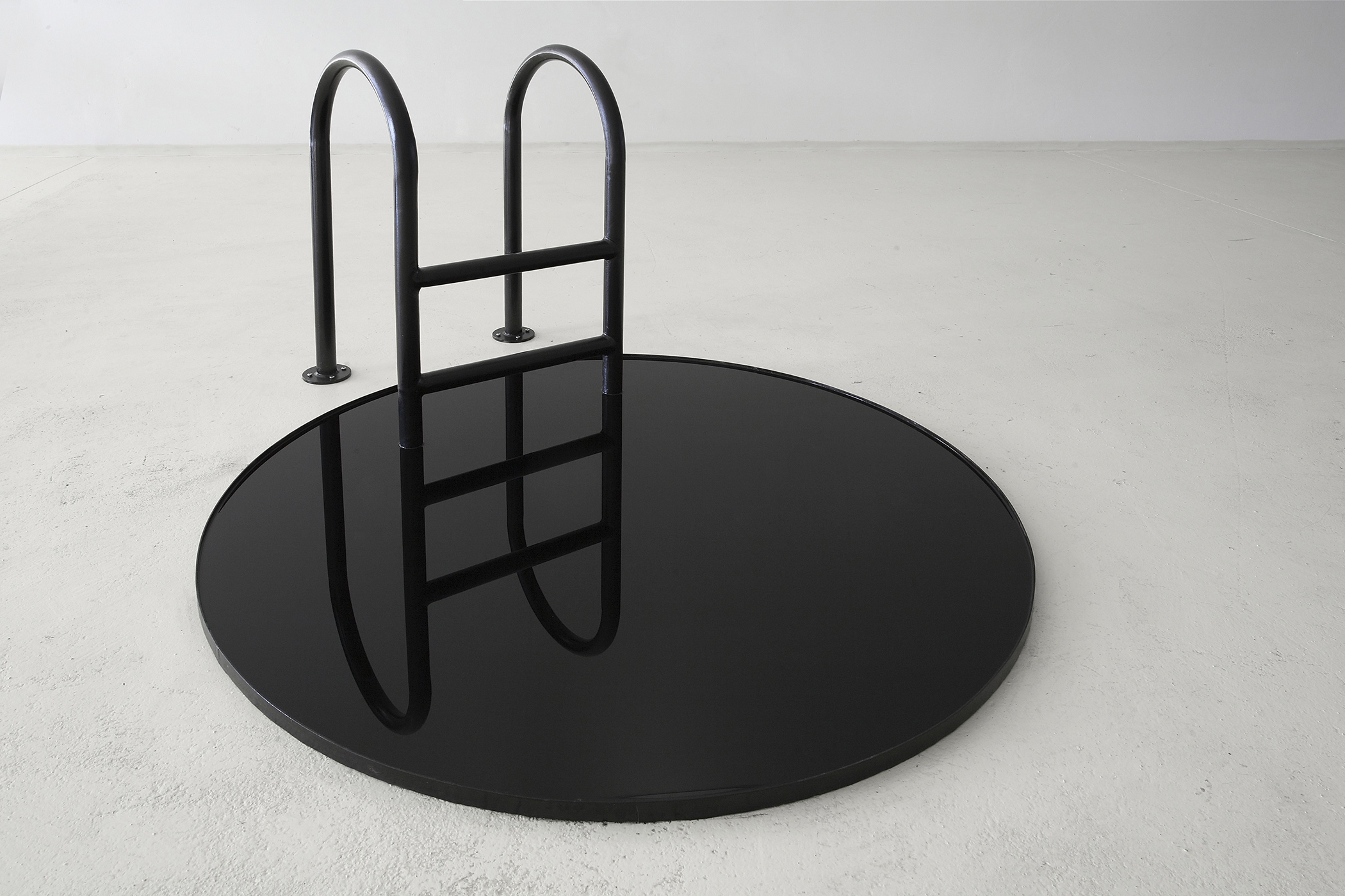 Subtenants to designate a breakthrough into the space of the personal subconscious. This is about an ancient game of self’s shapeshifting, where the transition to that other self is manifested by disguise at a personal level and by uniformity at a social level. The same elements, reflection, and ladder appear in a metaphor of diving into the subconscious that always represents the other, unknown and intimidating, as executed by Viktor Popović in his installation of a ladder that merges with its own reflection within a black opaque circle. Using the mirroring to enlarge the intensity in a perceptive experiment within the painter’s metier, Jadranko Runjić brings us to the non-psychological level of duality. Merging of blue paintings under a right angle and on a longer axis simply draws us into the atmosphere of a cooler that clearly disappears after the paintings are separated. Regarding the painting composition,