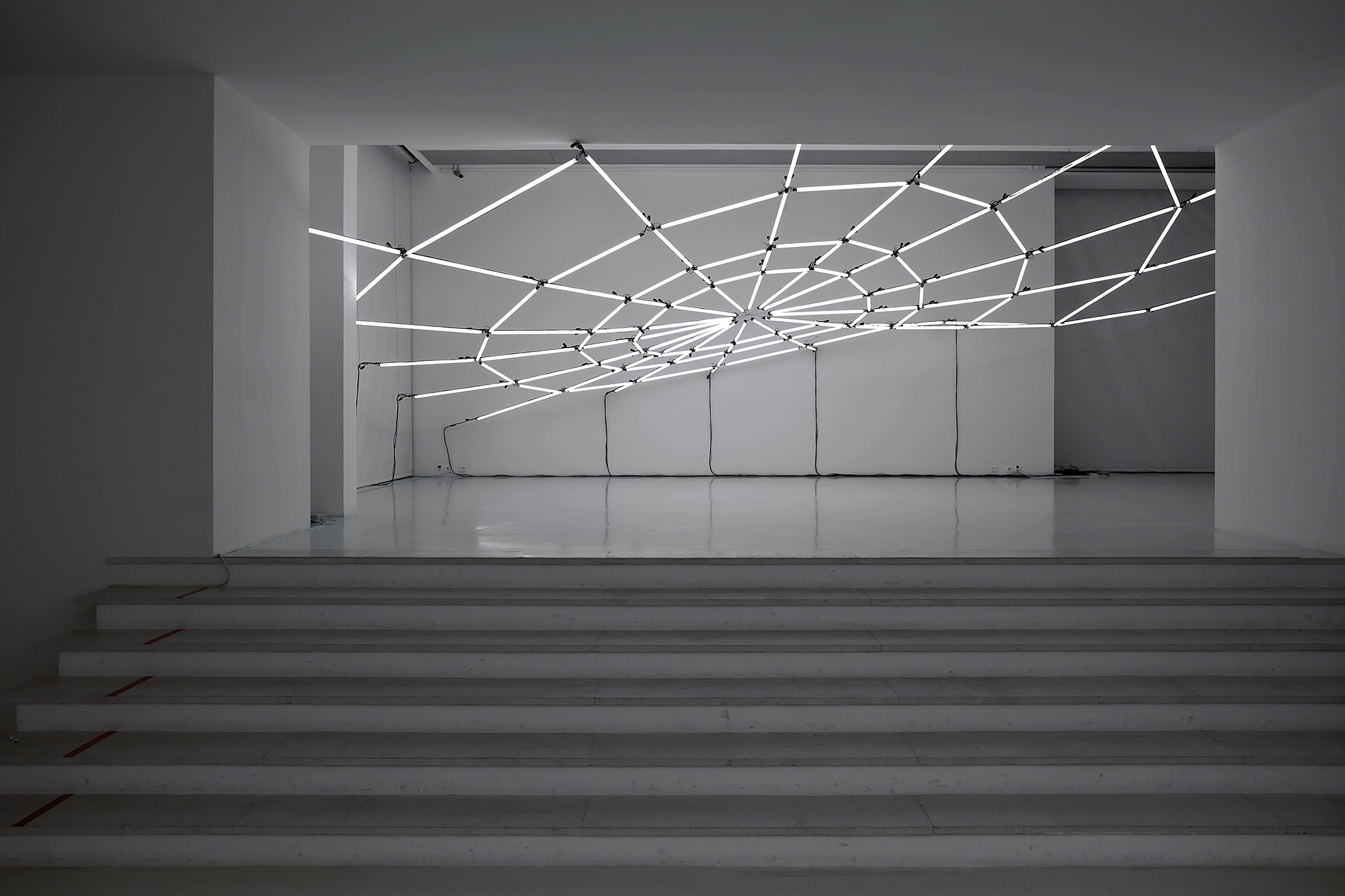 spun out of more than a hundred neon tubes, covering more than 40 m2 of space. By juxtaposing very fine linear elements and cold neon light, the artist has produced an artwork that with its precision and power, again testifies to the clarity of form and concept.