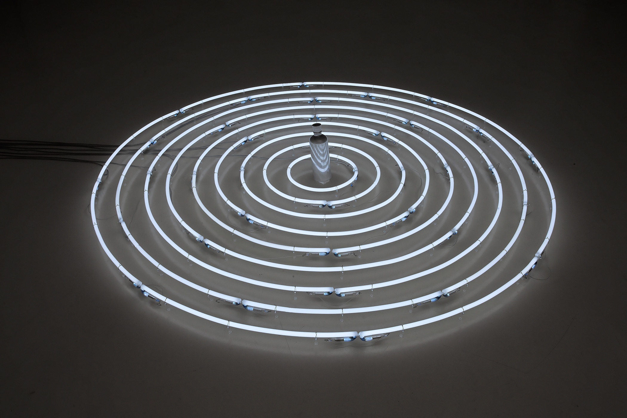 The two remaining artworks, here exhibited for the first time – the installation with an aluminum bottle surrounded by concentric circles of light (