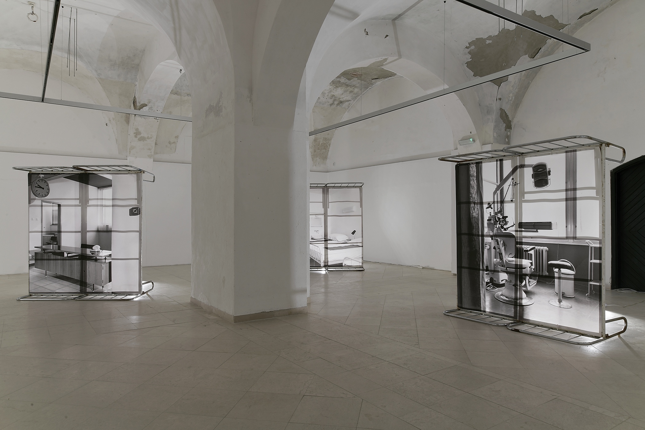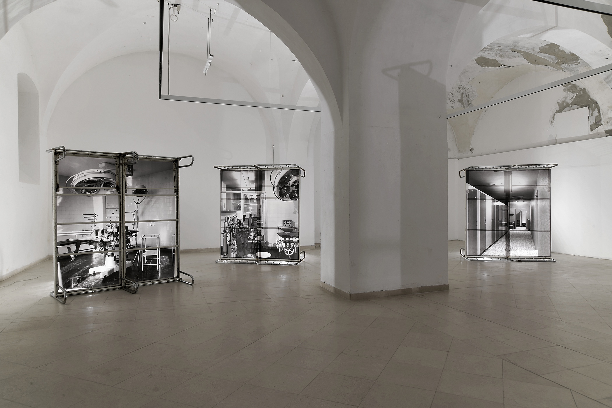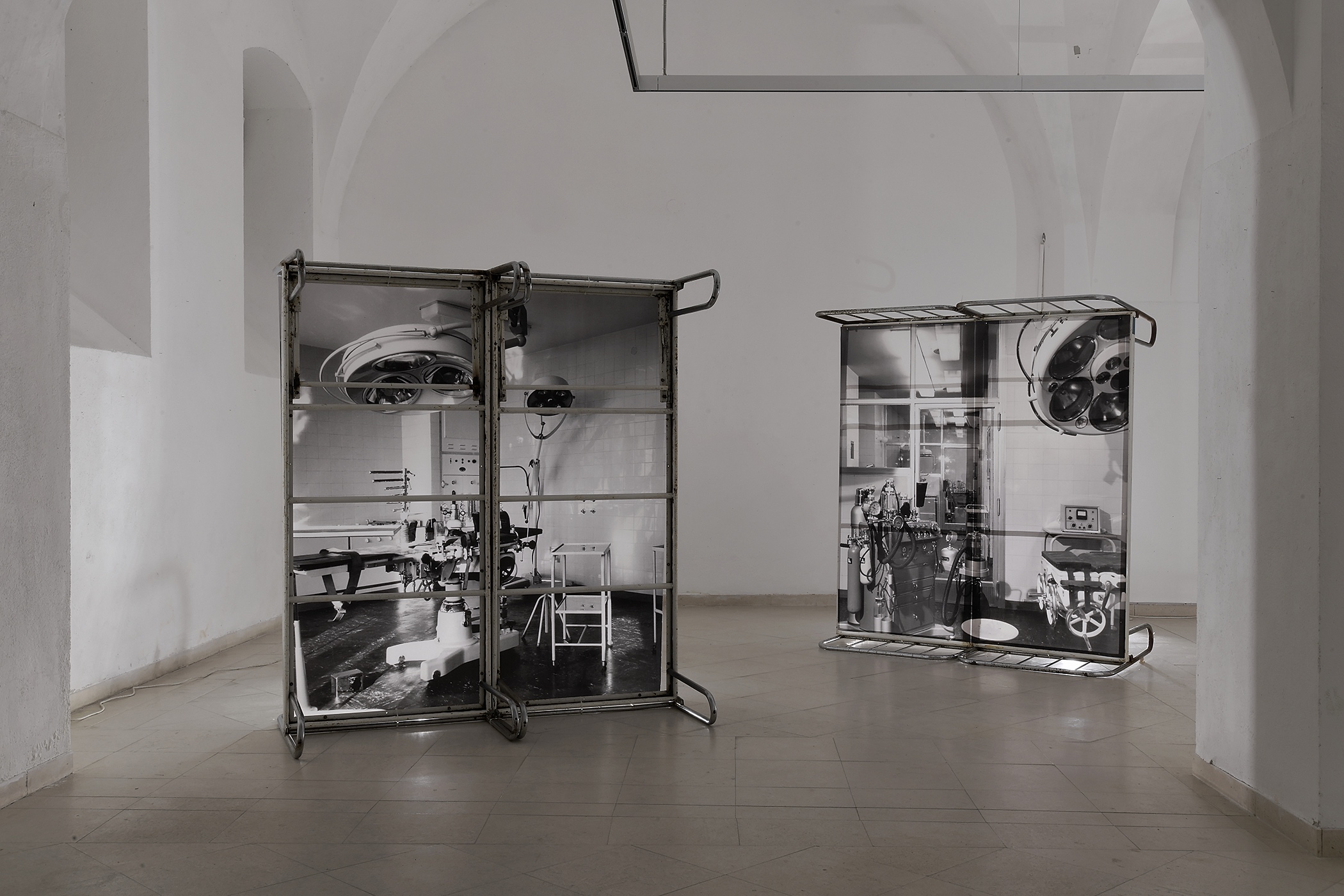 The central point of the exhibition is the construction of several ready-made objects, used hospital beds with which, using a simple intervention and artistic gesture, the artist constructs a complex and multi-layered installation. It is a group of large format objects made up of several pairs of vertically placed old hospital beds, as freestanding objects displayed in space as to create a certain dramaturgy of a staged theatre of objects and direct our view and choreograph our movements through the gallery space. These beds are not only props of the past in the role of artistic installation, but at the same, they represent some kind of constructions, frames for photographs, bearers of a certain memory manifested as large format digital prints of archive black and white photographs from the Collection of Photographs of the City Museum of Split, representing details of the hospital’s interior, inventory and medical equipment. The photographs represent a clinical view, distanced and cold, and include a temporal distance from the represented subjects, pointing out the relationship between place and document.