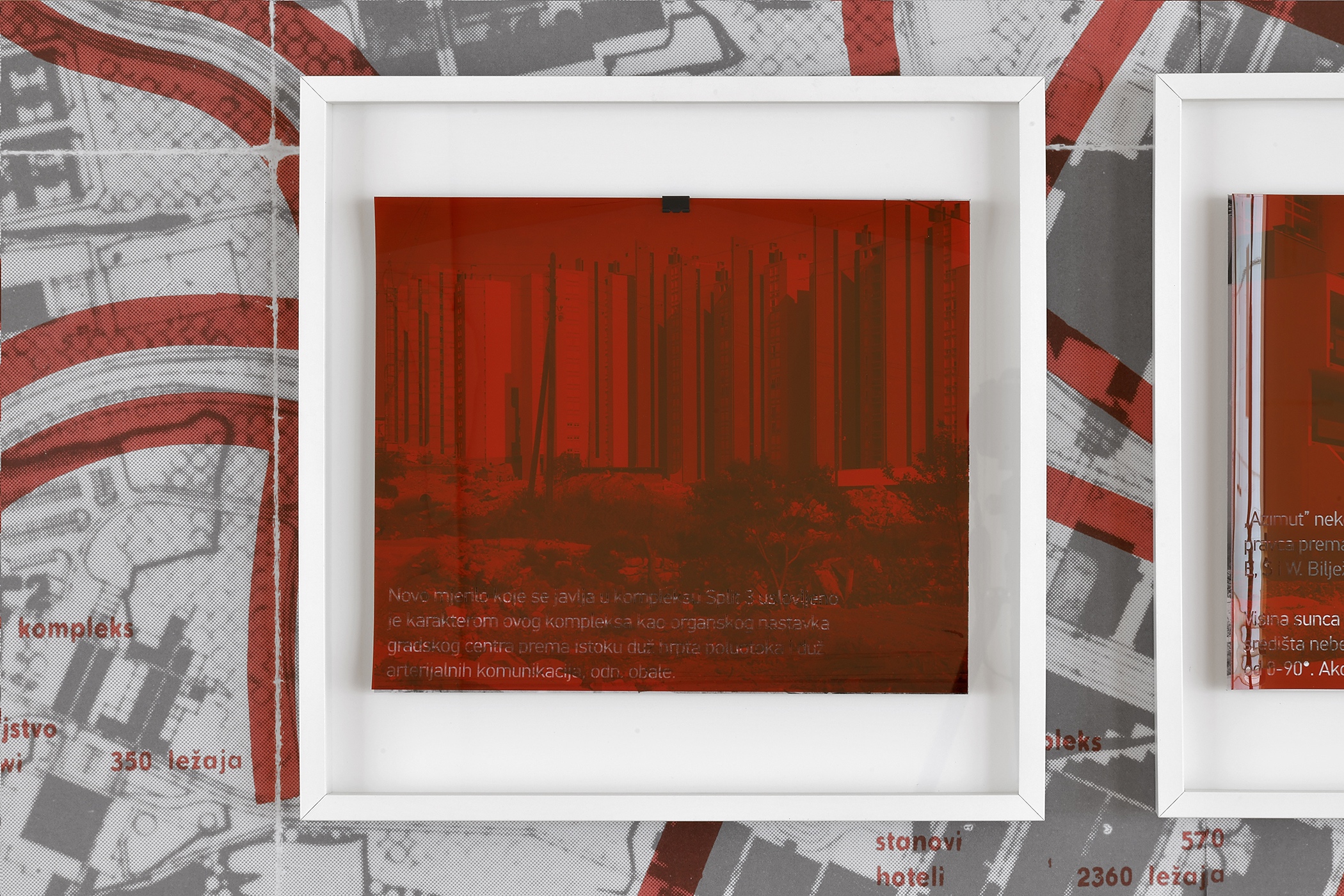 1 vrlo jasno i jezgrovito uočava motivaciju i način umjetnikova bavljenja ovom temom: „Ova tema čini se razložna uslijed trenutnog porasta interesa za navedeno razdoblje zbog međunarodne reevaluacije modernizma s područja tadašnje Jugoslavije, no razlozi Popovićevog interesa za navedeno razdoblje ipak su nešto složeniji. S jedne je strane Split 3 prostor njegova odrastanja te u tom slučaju memorija prostora ima vrlo osoban karakter. S druge je strane arhitektura visoke moderne potpuno u skladu s referentnim poljem njegovog interesa u području umjetnosti. No, dok razvoj umjetničke strategije u autoreferencijalnom prostoru umjetnosti možemo smatrati definiranjem vrlo osobnog umjetničkog identiteta, istraživanje živog urbanističkog prostora neminovno dobiva širi društveni kontekst. Odluka da za rad koristi primarno arhivske materijale u Popovićevom slučaju govori o kritičkom otklonu od sadašnjeg stanja urbanističkog kaosa i podsjećanju na vrijednosti po kojima su ti prostori izvorno mišljeni.” Izloženi Popovićevi radovi temelje se na umjetničkoj aproprijaciji crno-bijelih fotografija splitskog fotografa Zvonimira Buljevića, tehničkog suradnika na projektu Split 3. Njihova dokumentarna vrijednost izbija kroz prikaz izvornog stanja masovne stambene izgradnje na području kvartova Trstenika i Smrdečca, izravno posredujući osnovnu misao arhitektonskog promišljanja. Na tragu prokušane vlastite umjetničke strategije, Popović stvara „hibridne radove na razmeđi fotografije, reljefa i objekta”. Na spomenute fotografije on „intervenira apliciranjem industrijskih filtera za korekciju boje perforiranih segmentima teksta iz dokumenta iz 1969. godine ‘Split 3: Osnovno urbanističko rješenje’ koji je izradio Urbanistički institut SR Slovenije”. Radi se zapravo o dvostruko artikuliranom kritičkom stavu izraženom kroz korištenje kompatibilnih komunikacijskih sustava slike i jezika. Takvo ponavljanje ističe njegovu važnost u obzoru shvaćanja ove umjetničke cjeline. Babić poentira: „Nerijetko uzvišen, idealistički jezik tako nas podsjeća da je ‘grad akt (čin) volje i mora biti sve više predmet svjesnog napora oblikovanja i preokupacija najsvjesnijih i najinteligentnijih snaga u društvenoj zajednici.’”