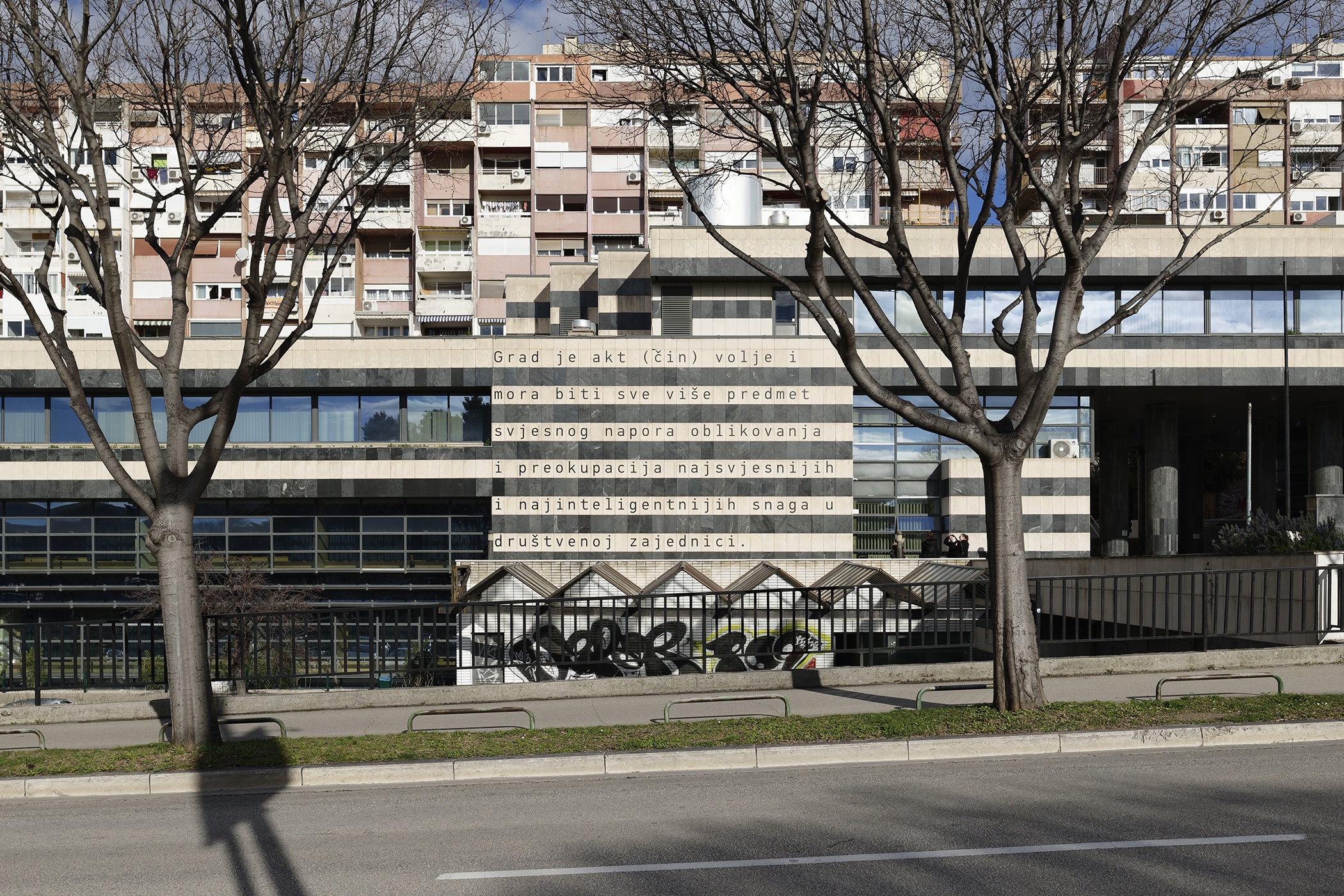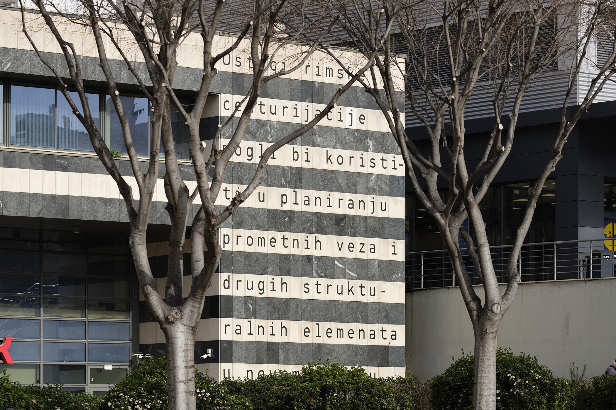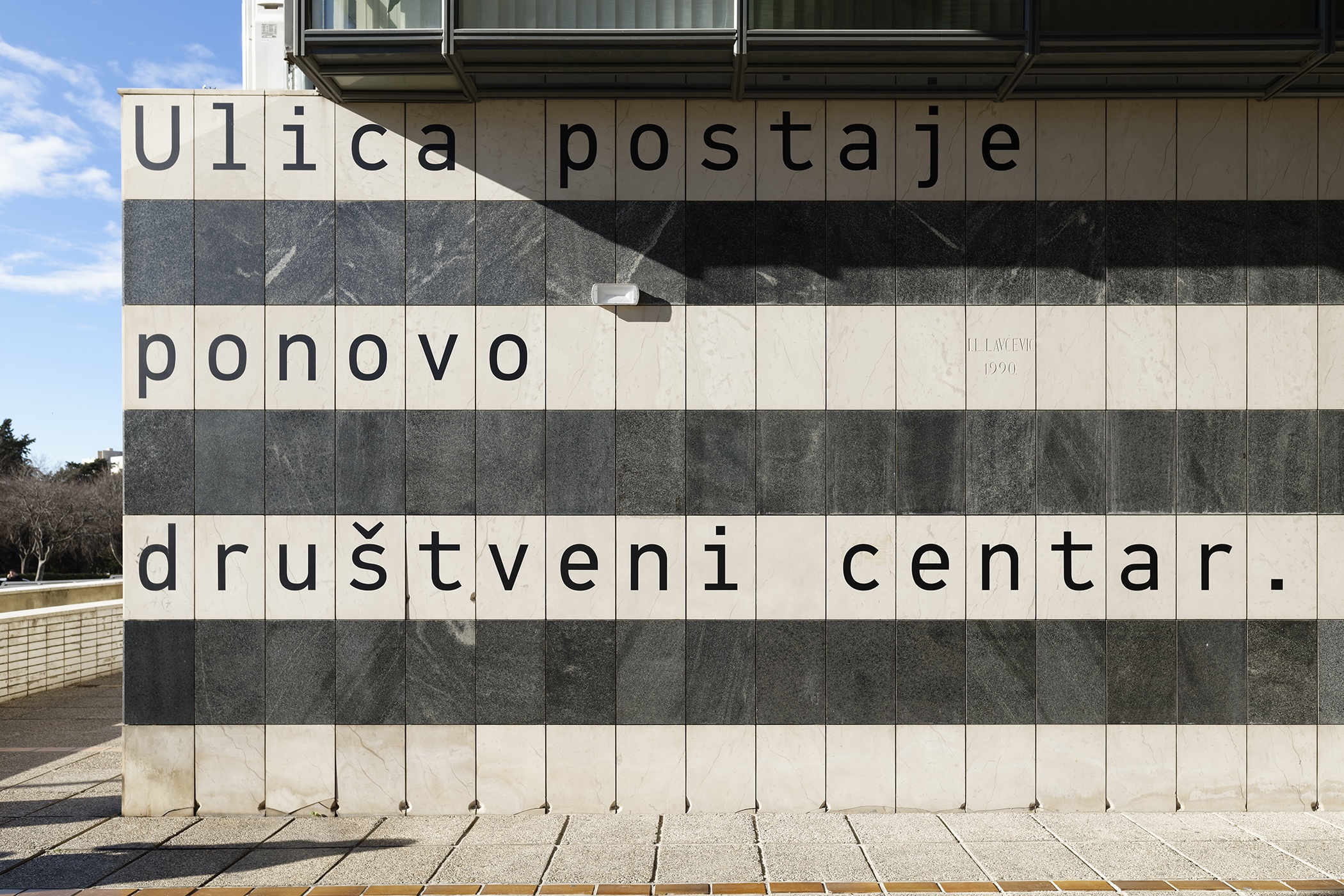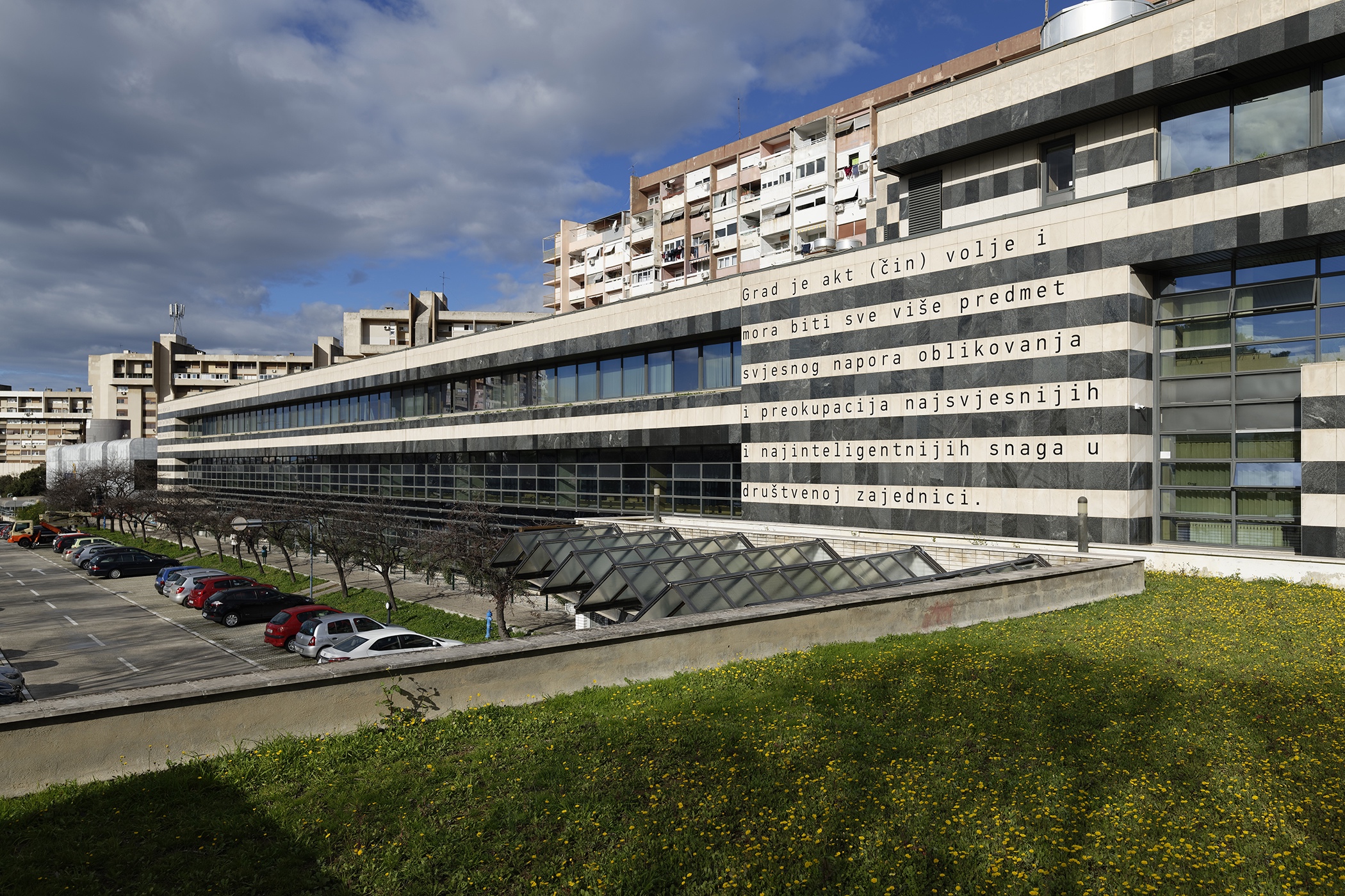The cornerstone of Viktor’s reflections and reaction is the urban and architectural planning of Split’s third city raion (district) from the late 1960s. By writing textual fragments on the façade of the Faculty of Humanities and Social Sciences building in Split, which has been designed at the intersection of two epochs and different socio-political paradigms by architect Dražen Colnago, as the Brodomerkur business and commercial building, the artist problematizes the urban and architectural heritage from the late 1960s and through the 1970s. Specifically, Popović selects a few sentences from the archival document for the Split 3 project – Basic urban design – Textual part: preliminary technical description and report from November 1969, and applies them to the recognizable façade, turning it into an active staff notation, thus questioning the appearance and nature of the present-day city.
