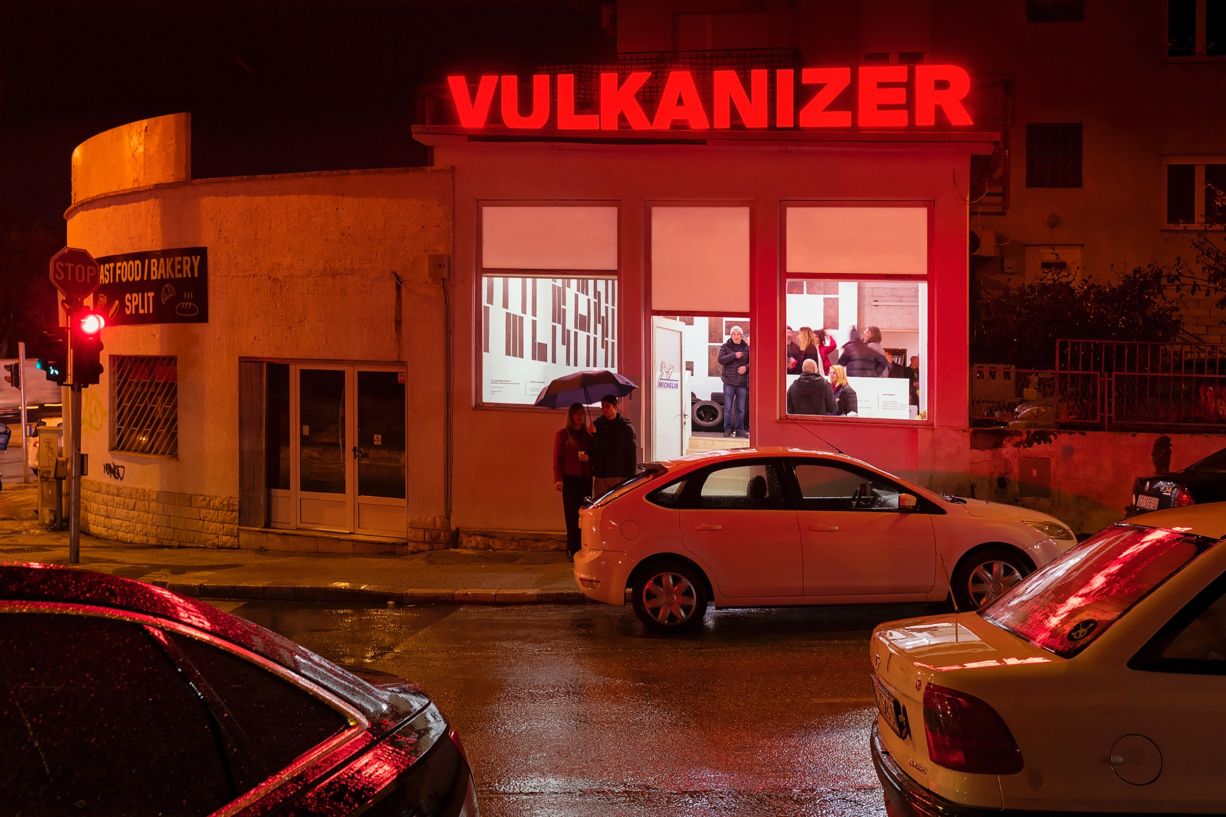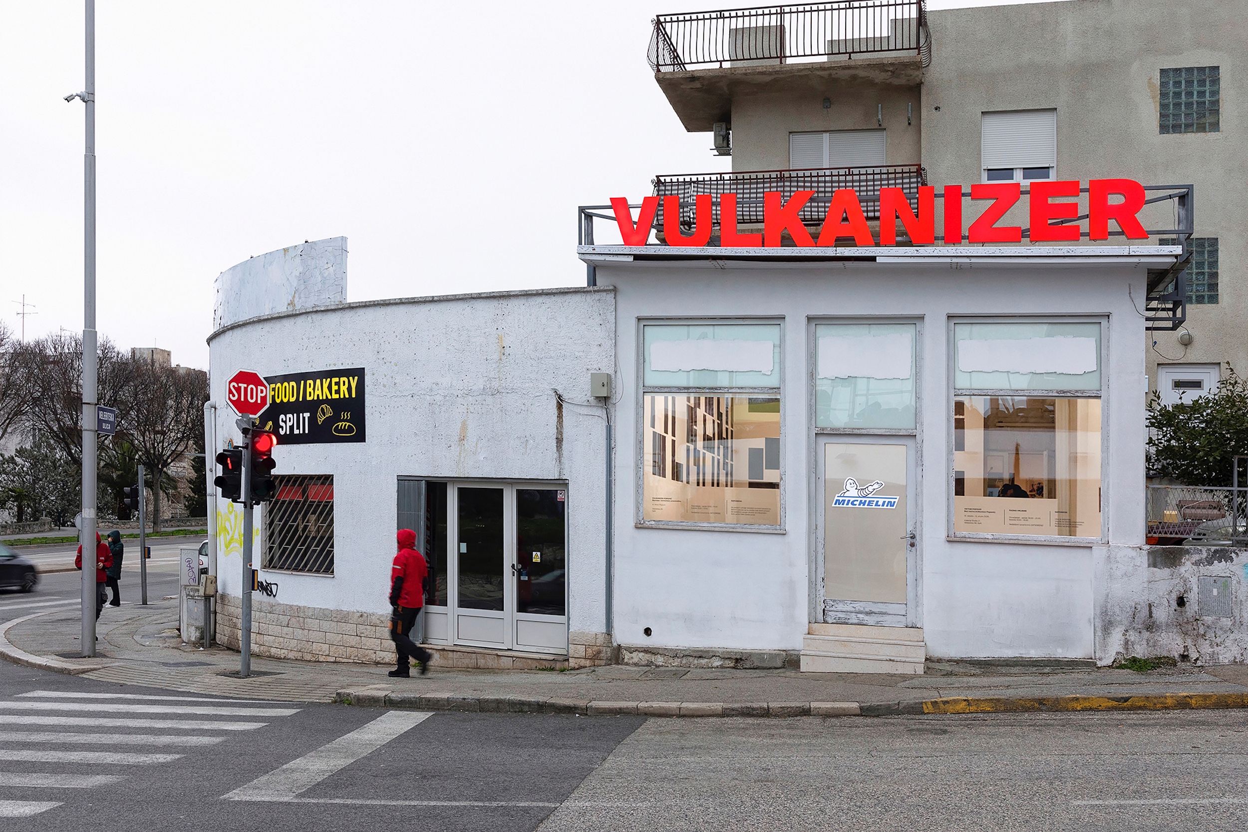 Untitled (Archive ST3: Content), he “recalibrated” the interior of Split’s Kula Gallery by rotating a construction scaffold by 36 degrees, thereby aligning it with the precise orientation of the ancient centuriation that once determined the spatial organisation of the entire Split peninsula. At Studio 21, the transformation begins outside the gallery. Drawing attention to the gallery’s relative invisibility among its surroundings, Popović places a large red neon sign reading VULCANIZER above the entrance. Positioned along one of the city’s busiest roads, the sign is designed to compete with the advertising of nearby cafés, currency exchange offices, and, of course, the neighbouring tyre repair workshop. With this gesture, the artist not only captures the attention of the local community but also “plants” a (deliberately misleading) suggestion of a new commercial presence for the many drivers who pass by each day. Perhaps some of them might even stop.