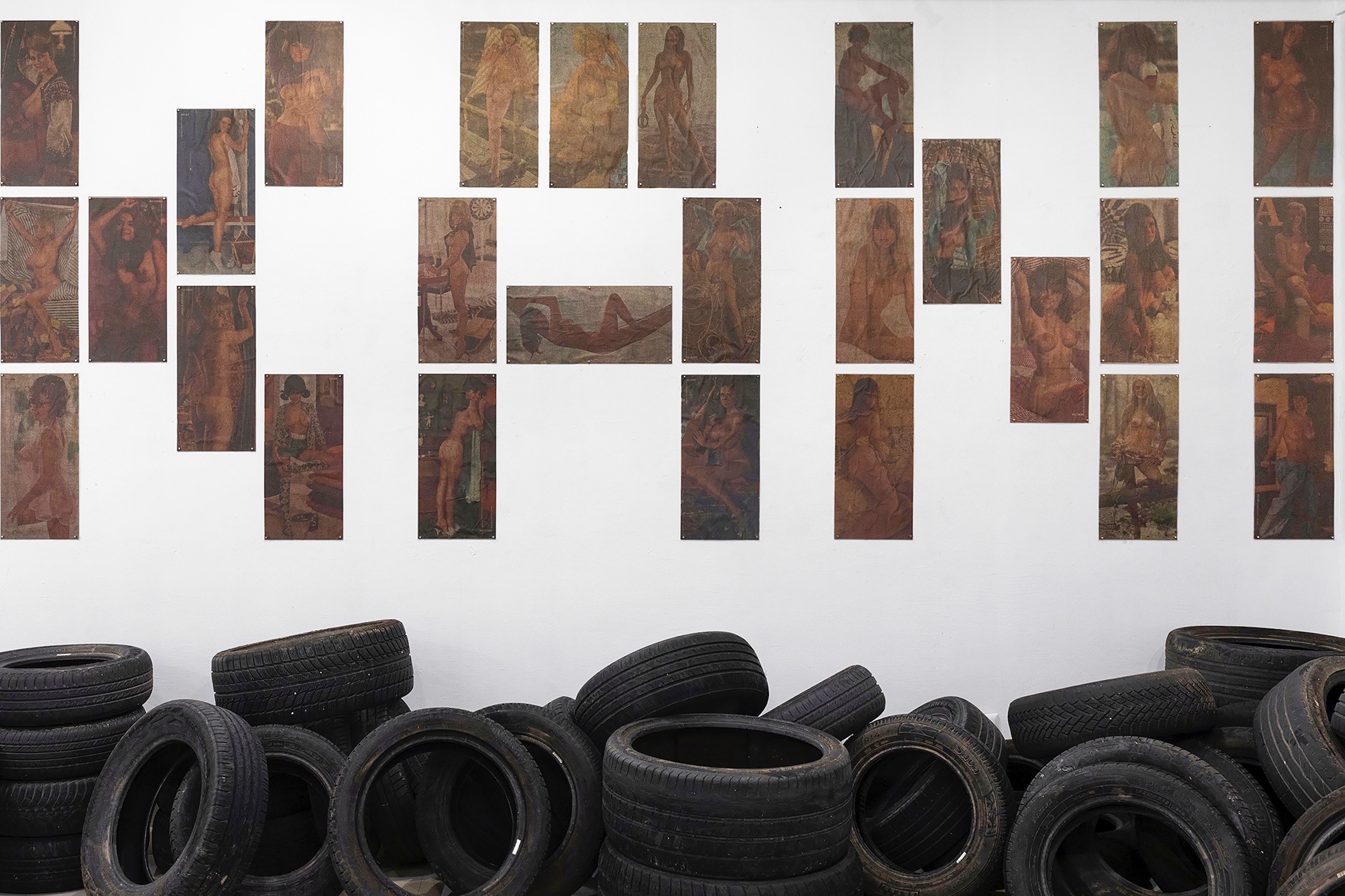 Playboy from the 1960s to the 1980s, in their distinctive formats, have been carefully treated, with the centrefolds overlaid by thin sheets of paper soaked in motor oil. This “filter” both softens the imagery and creates a visually cohesive installation, while also adding an olfactory dimension, making the experience of the work fully immersive. It illustrates the inherent ambiguity of artistic installations, as the observer is positioned at the centre of such works (perception always requires physical presence in the space), yet also experiences a sense of decentring, as their reality becomes fragmented (even though the senses suggest otherwise, we are aware that we are not in a tyre repair workshop but in an exhibition space).