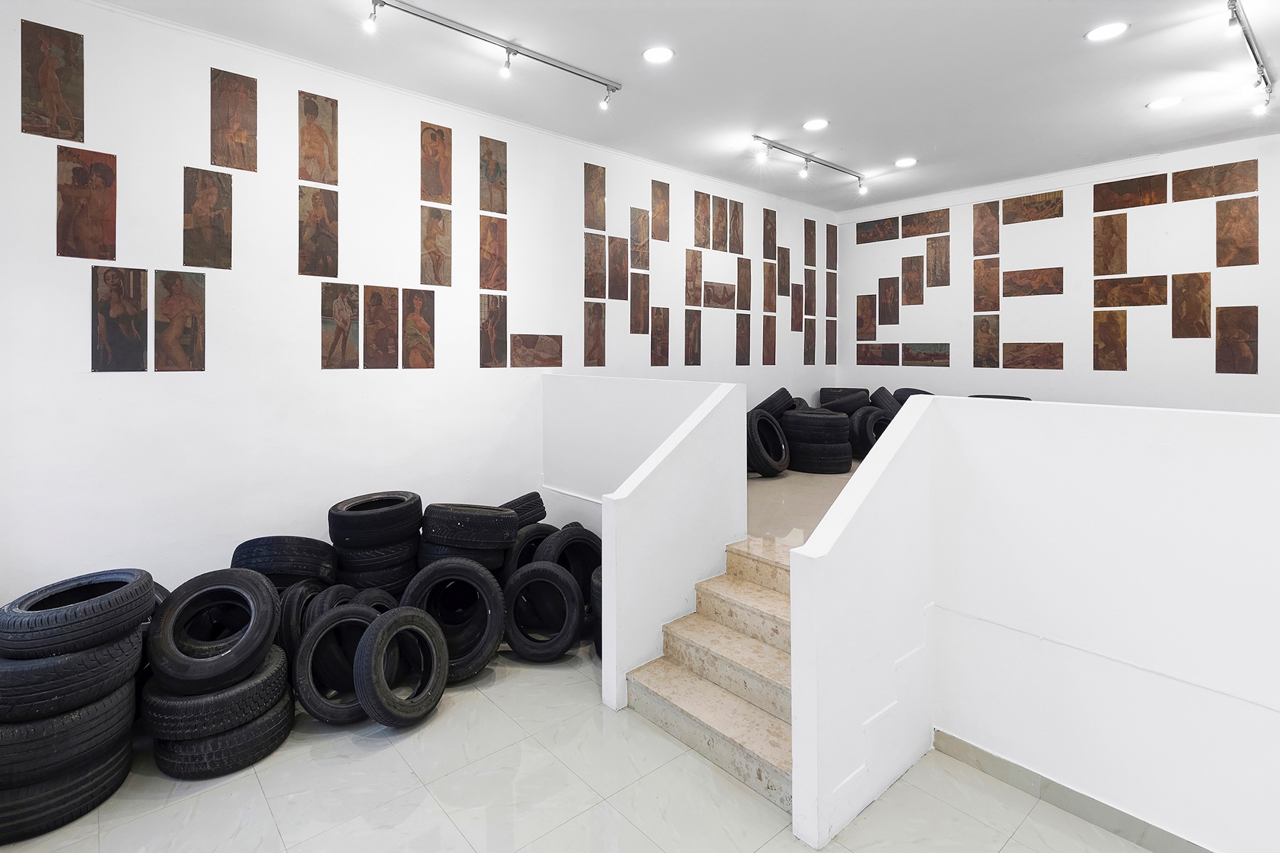 Remaining committed to a complete semantic inversion, Popović transforms the gallery interior itself, effectively creating a simulated tyre repair workshop. This is an example of what the Russian artist Ilya Kabakov describes as a “total installation,” emphasising the immersive quality of the work. Popović fills the space with car tyres (borrowed, naturally, from the gallery’s neighbour) and covers the walls with centrefolds from old issues of