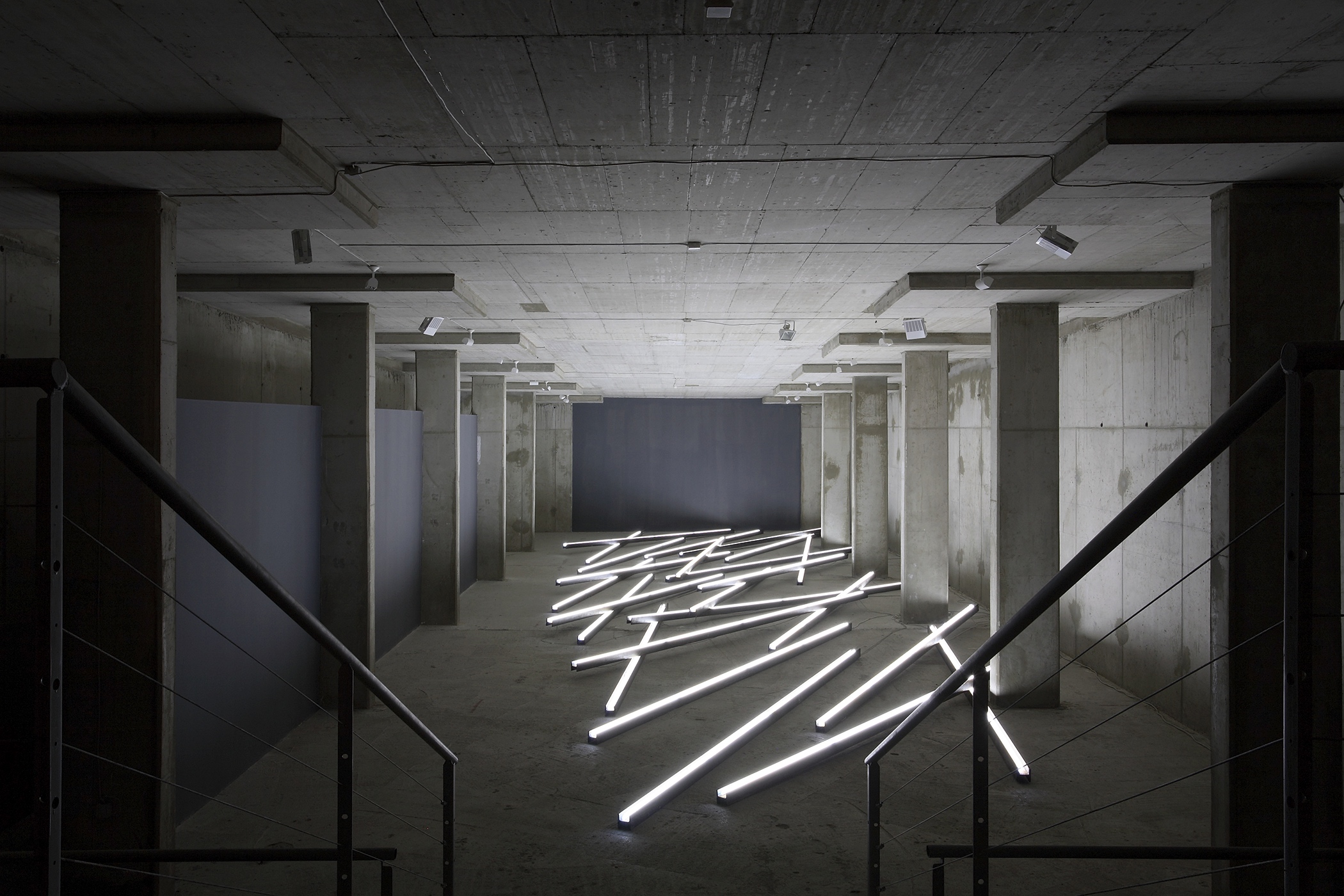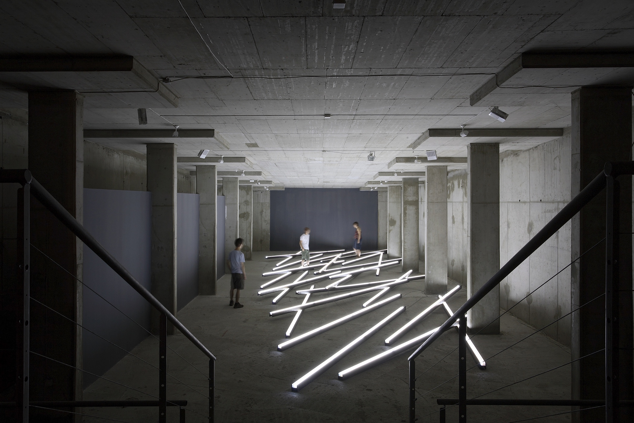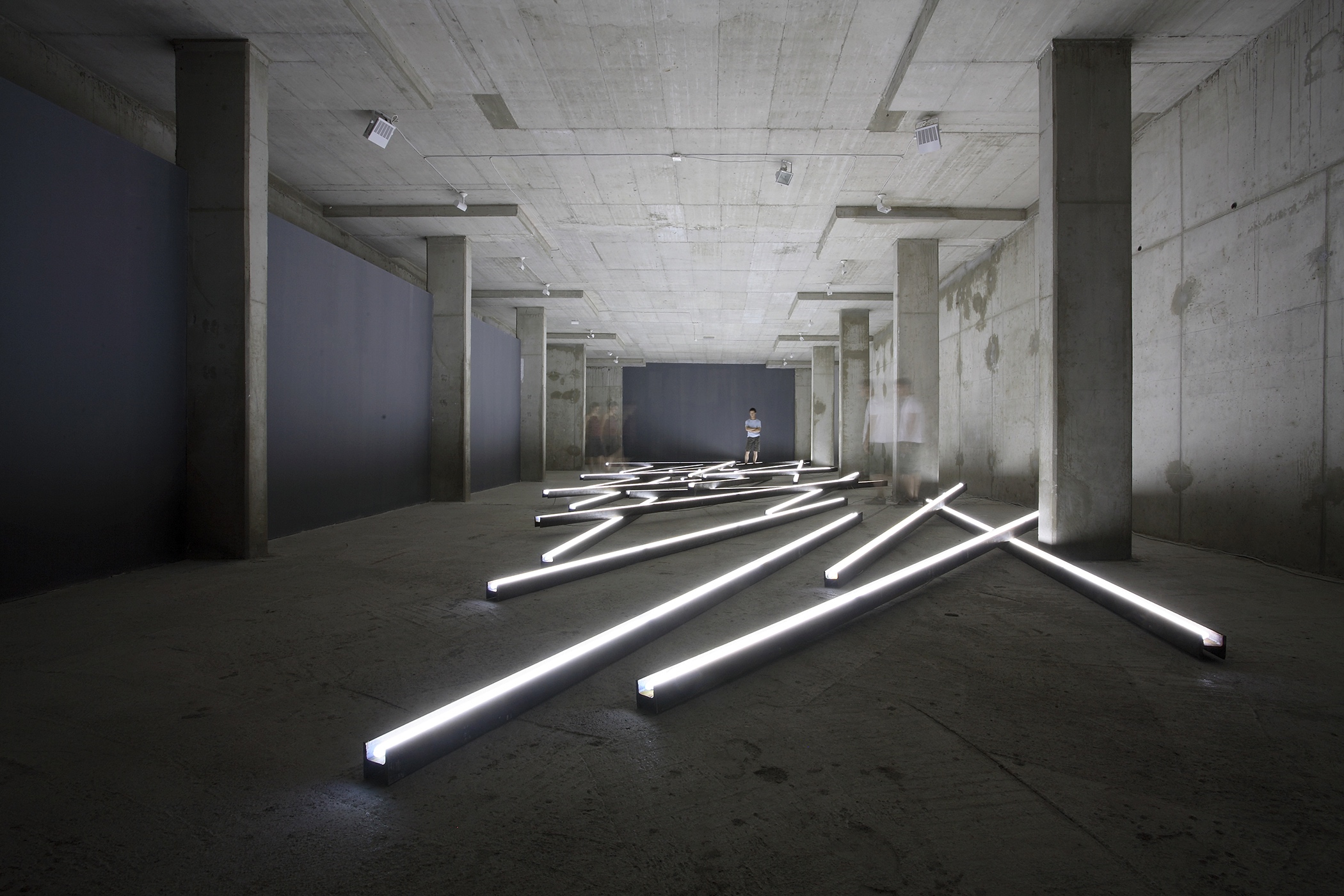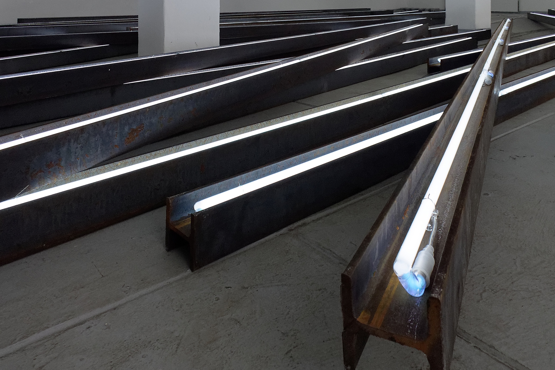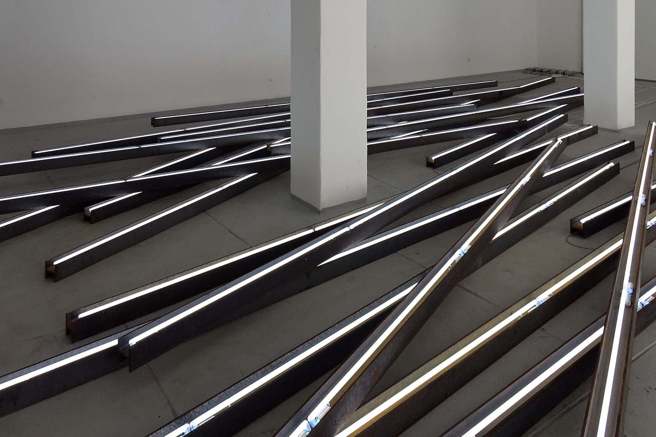 Spatial installation consisting of 24 pieces of 6-meter steel beams with associated argon light tubes. The dynamics of the work is achieved by superimposing and different orientation of linear elements.