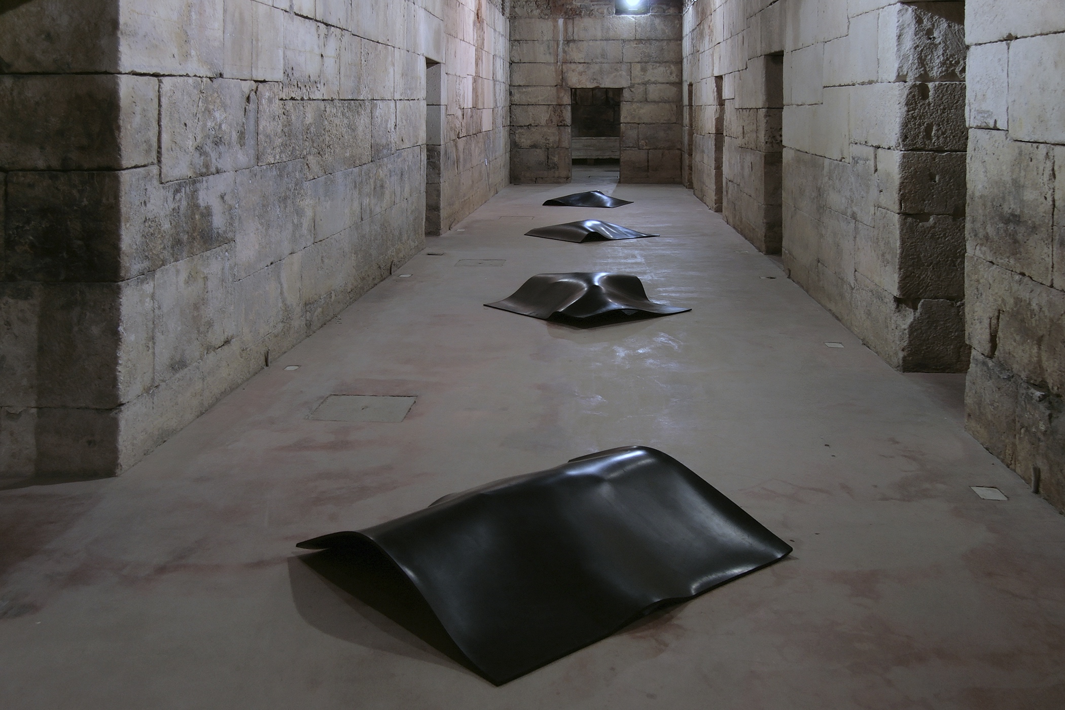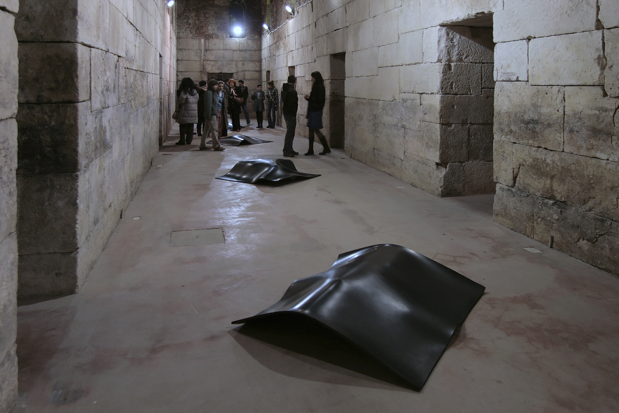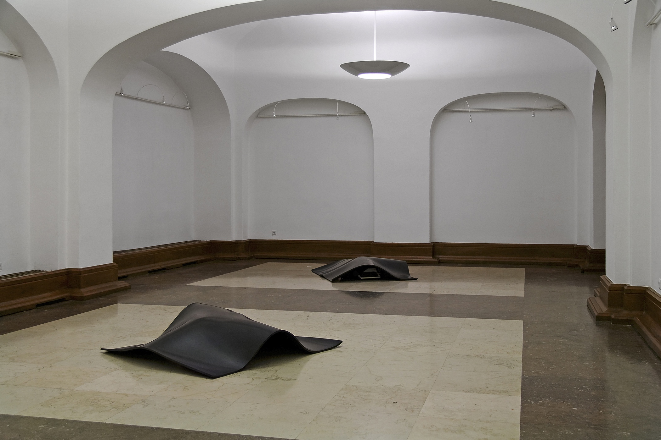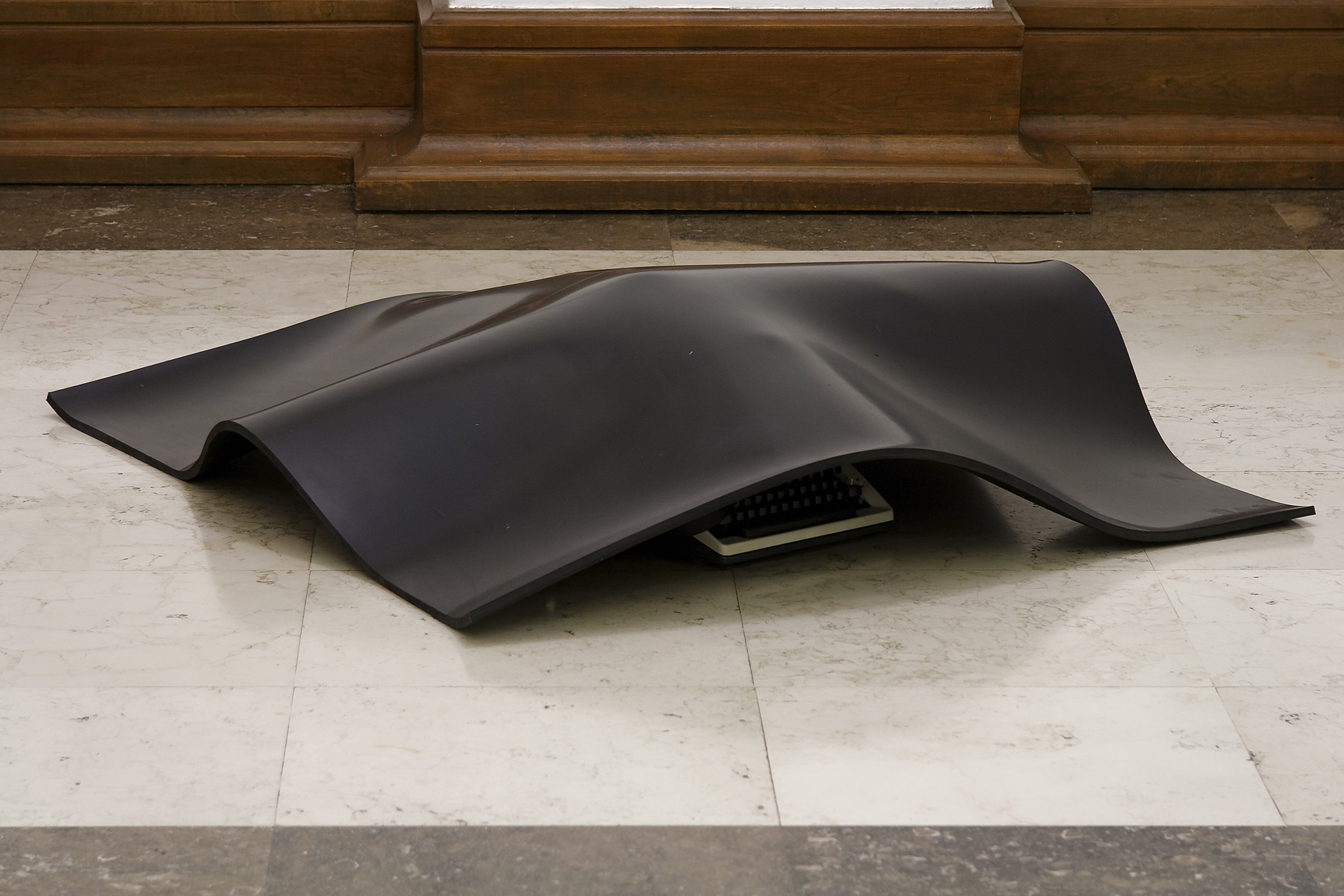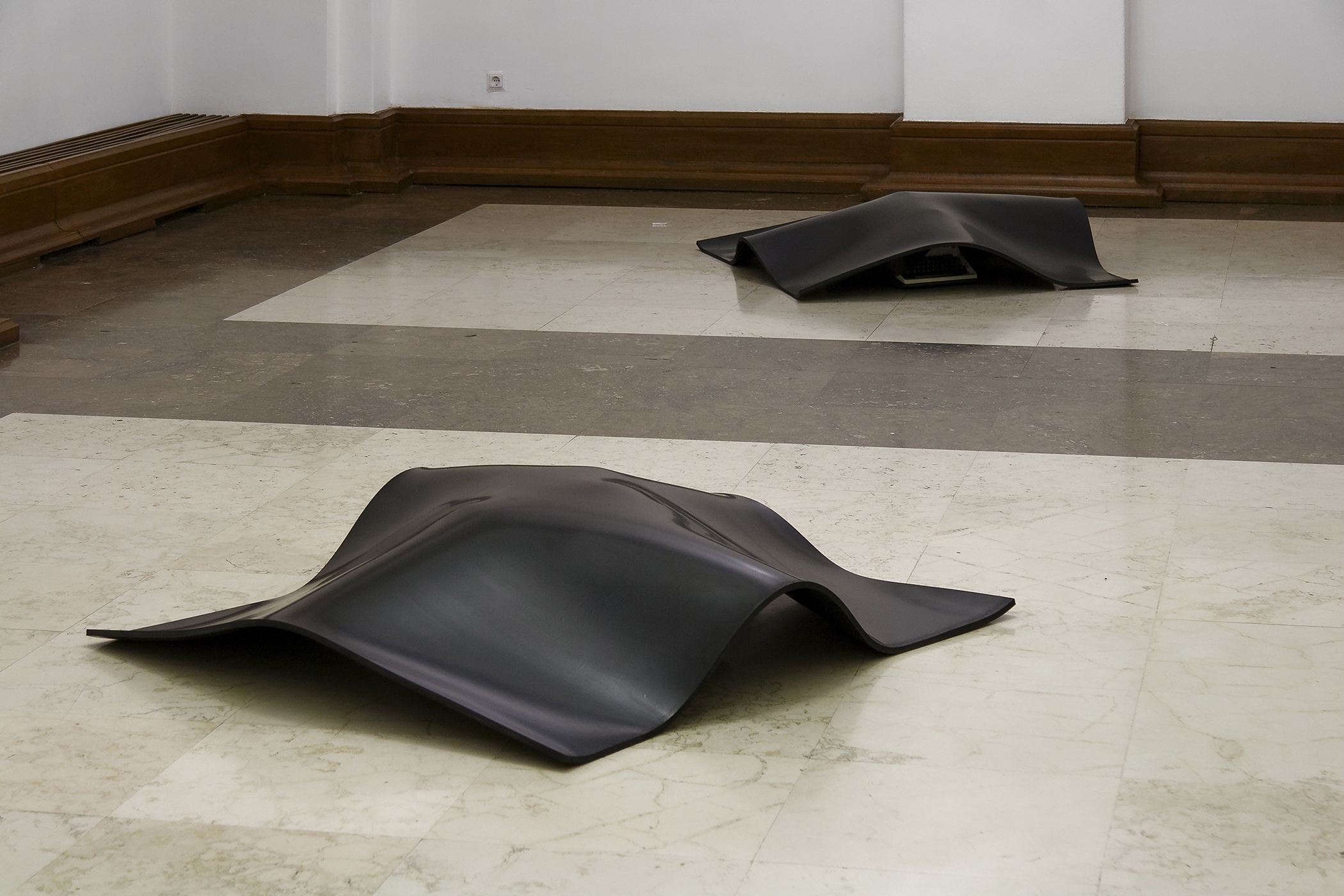 Installations with borrowed everyday objects each covered by a thick layer of rubber were produced in 2007. The focus was on objects, linked both to the spaces as such and to their users. The agent of art was the rubber cover. The selected objects, hidden under identical pieces of rubber, were only vaguely visible, while the observer, aware of the fact that they were exhibited artworks and therefore not to be touched, was left to guess and speculate. The version of the installation, presented on exhibition in Split in 2011, acquires an additional memory code with the choice of borrowed objects. Under the rubber layer, there are objects that were part of the holdings of the former Museum of the People’s Revolution (today owned by the Municipal Museum of Split), which was located in the building of today’s Gallery of Fine Arts in the period between 1980 and 1991. A radio station, an aggregate, and a searchlight covered with rubber constitute an artwork that is both visually and conceptually intriguing. Museum exhibits, laden not only with their primary uses but also with their museum history, with which we are still struggling, give additional meaning to the installation, re-contextualizing it in terms of space and time.