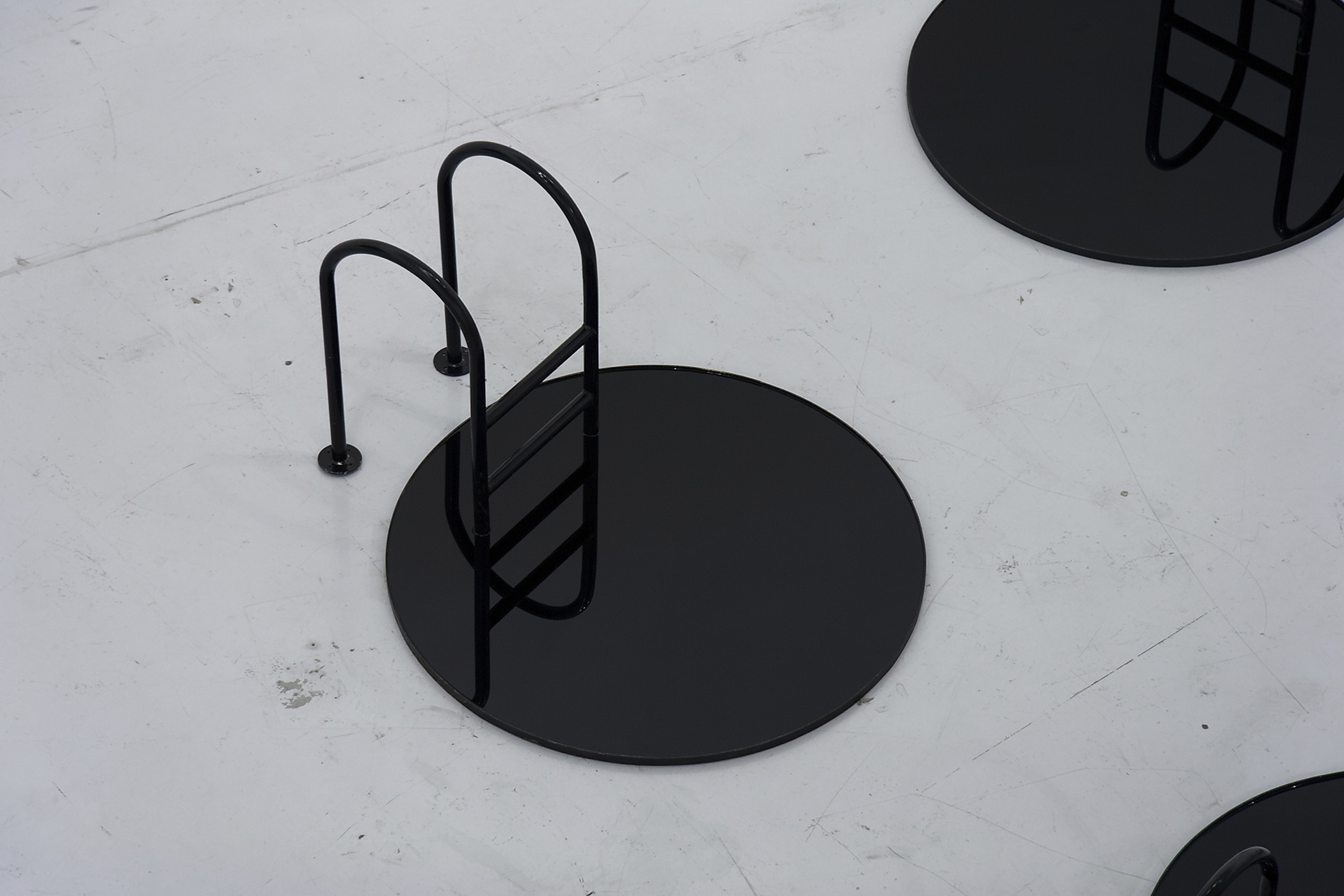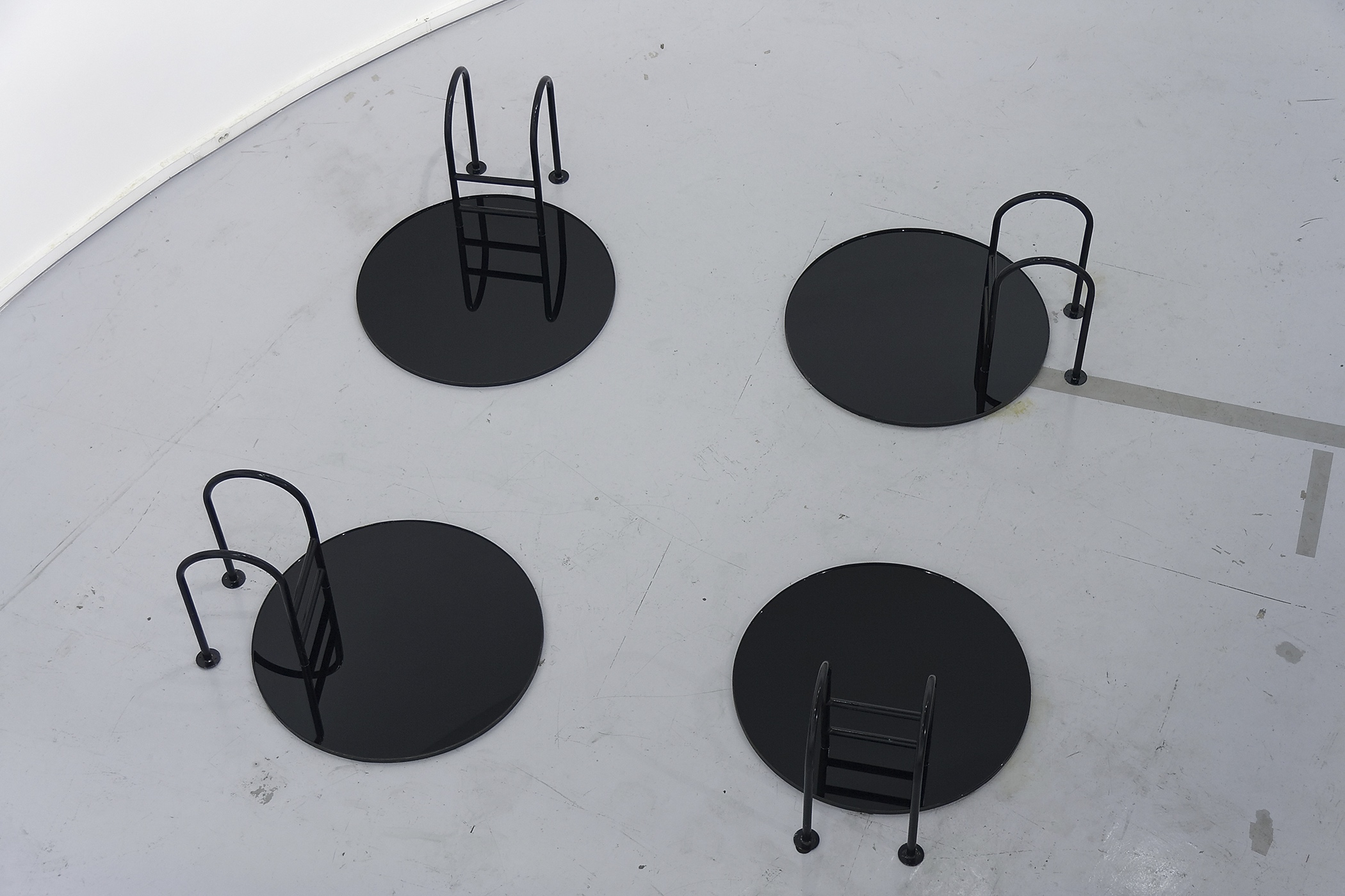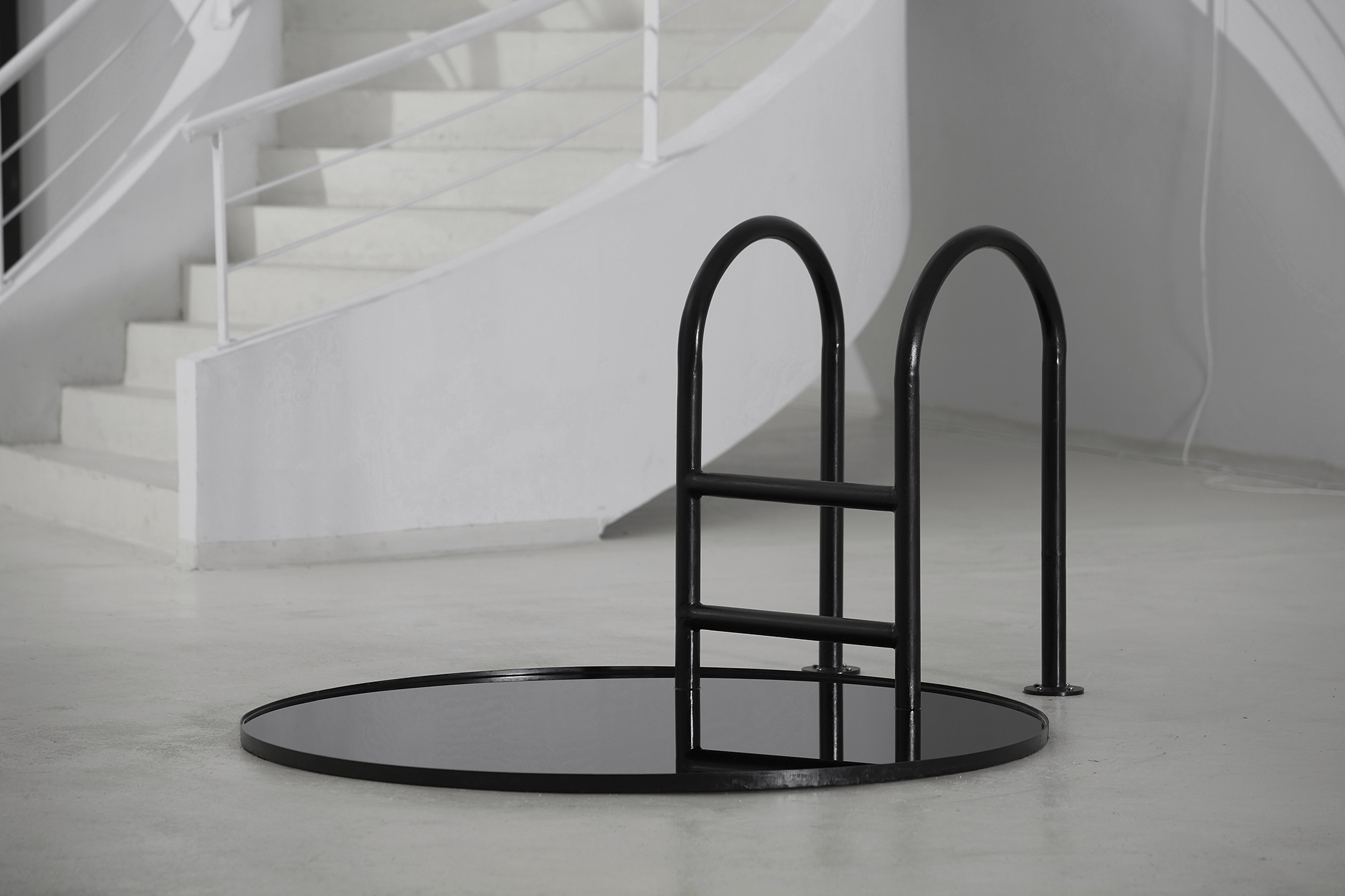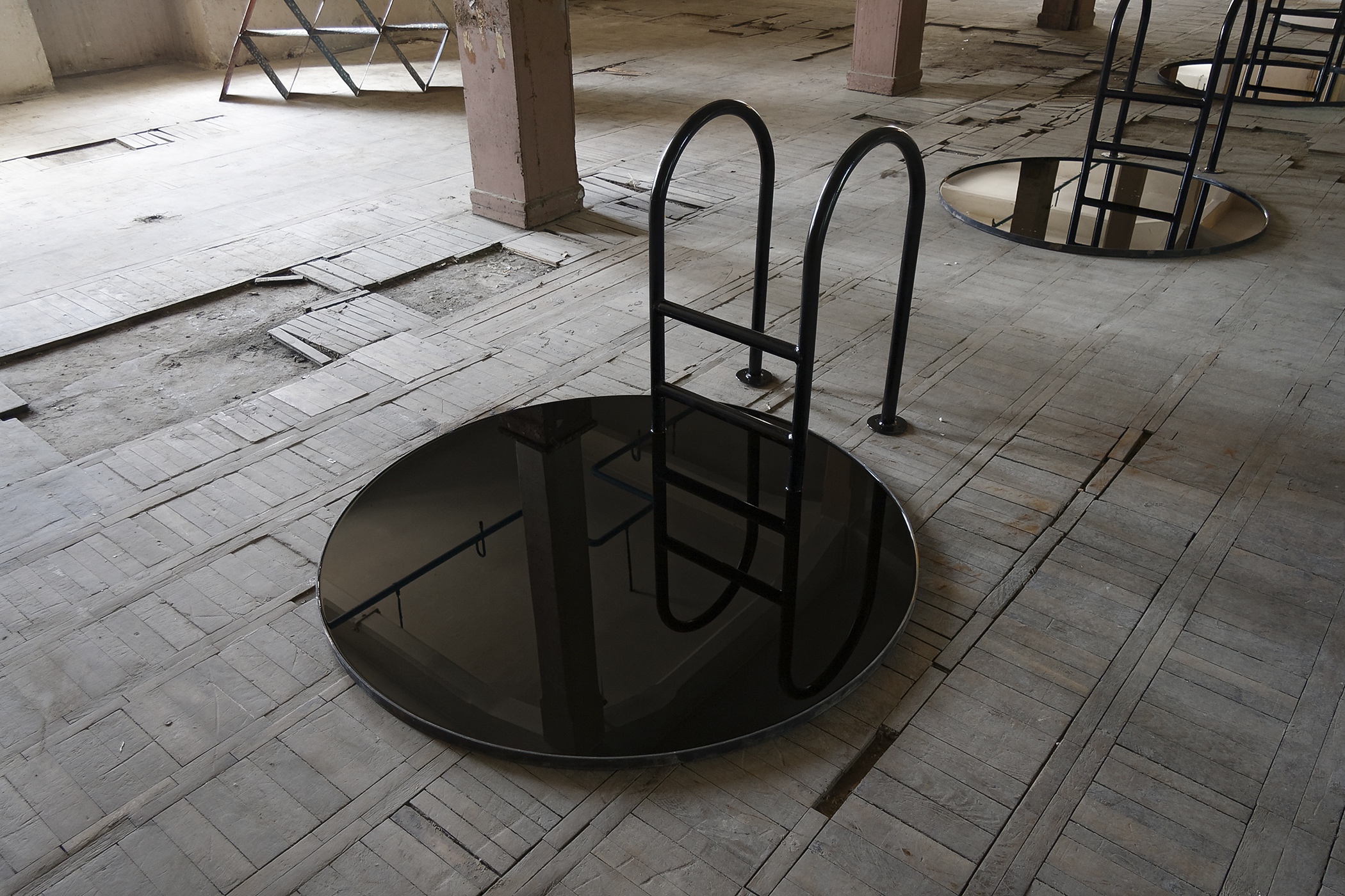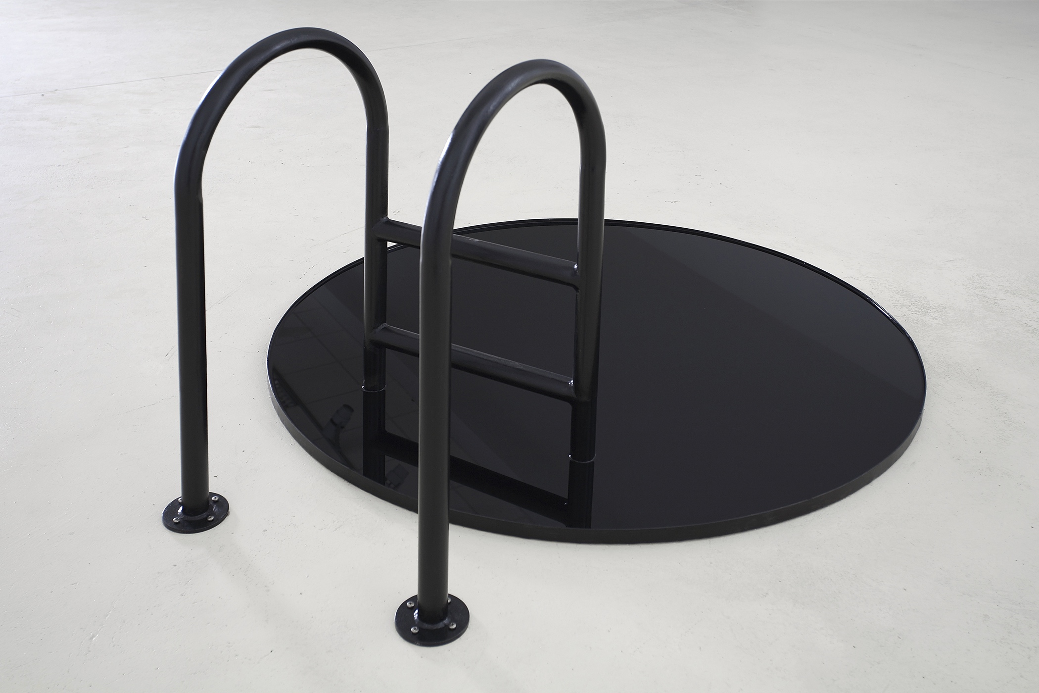 Work consists of metal ladders and a round pool filled with used motor oil. The specific quality of the used liquid – petroleum product, opens up multiple levels of interpretation, as a global vision of a polluted environment and consumer society whose future uncertainly floats dependent on big businesses and available energy resources. Tensions and commotions are continued in the visual registry of the pools. The dark
