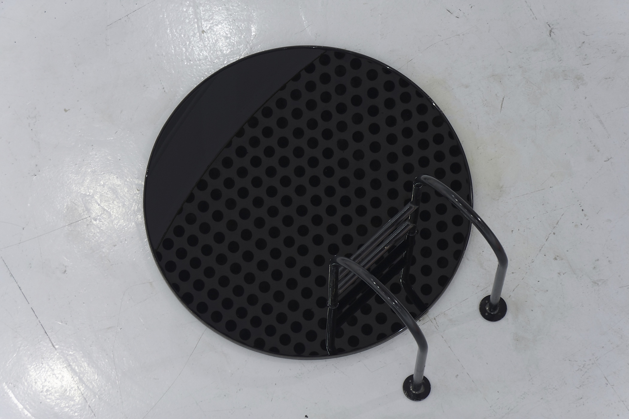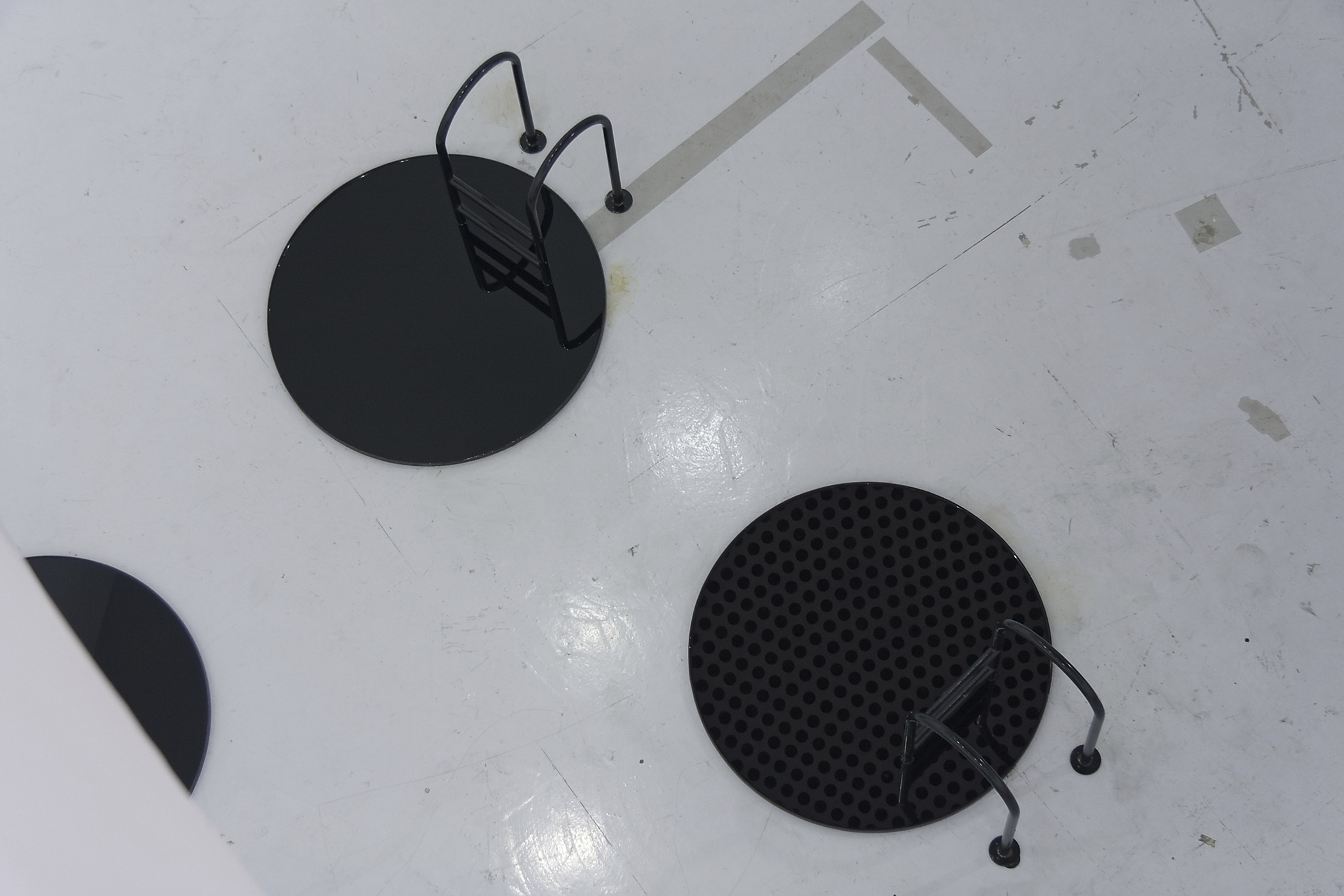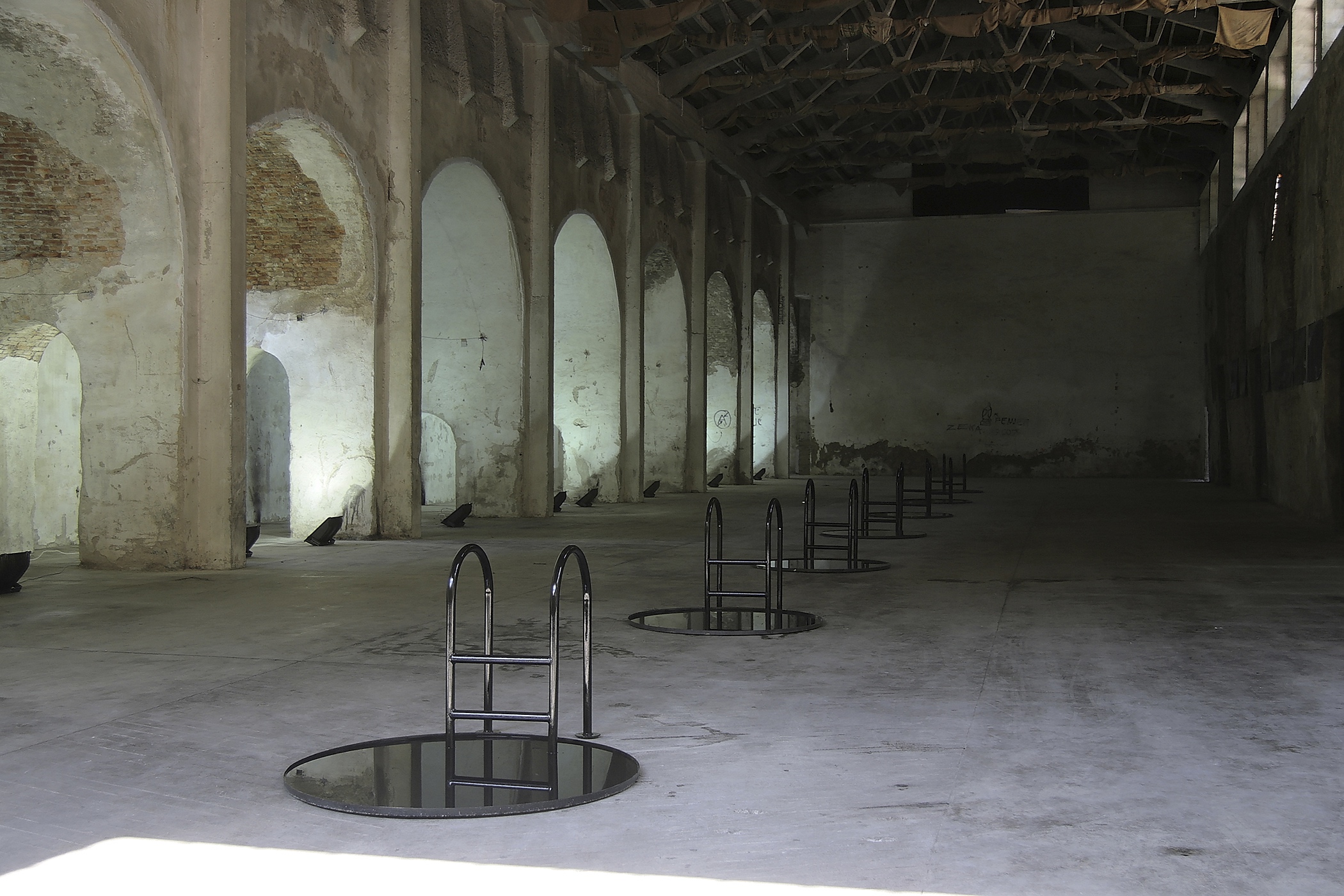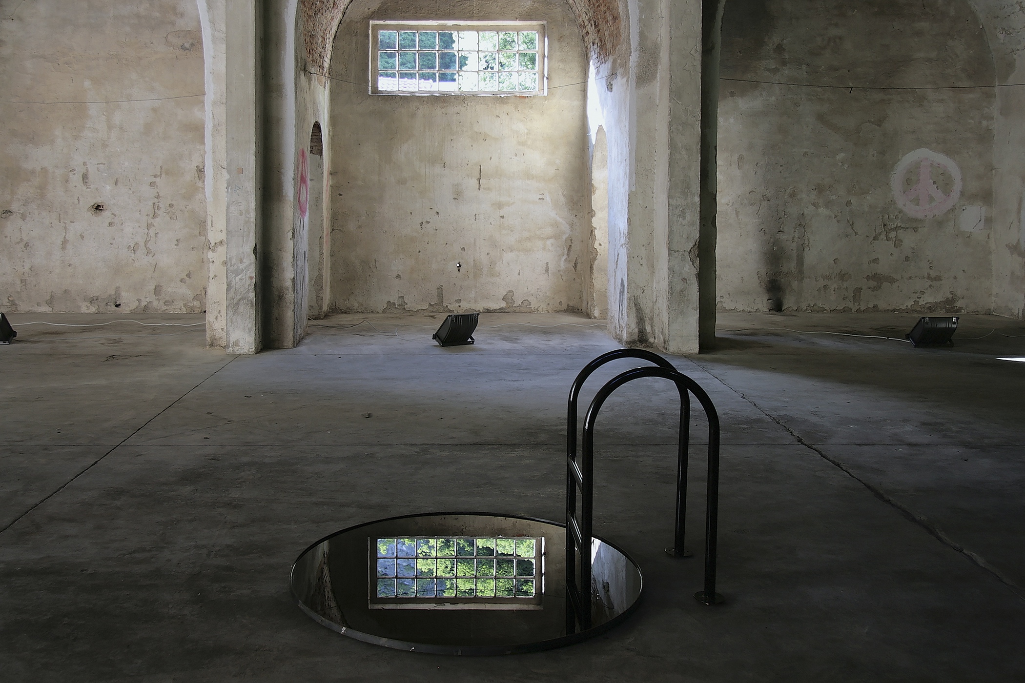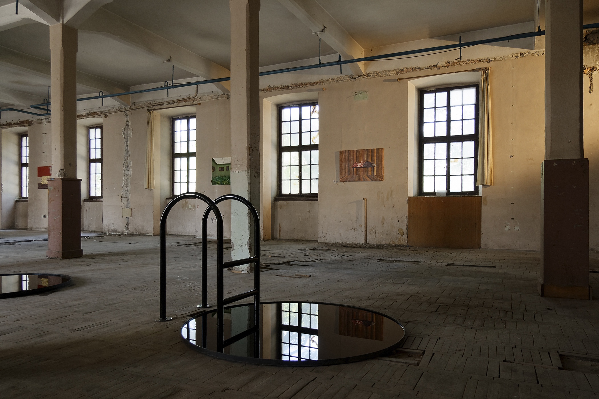 Work consists of metal ladders and a round pool filled with used motor oil. The specific quality of the used liquid – petroleum product, opens up multiple levels of interpretation, as a global vision of a polluted environment and consumer society whose future uncertainly floats dependent on big businesses and available energy resources. Tensions and commotions are continued in the visual registry of the pools. The dark