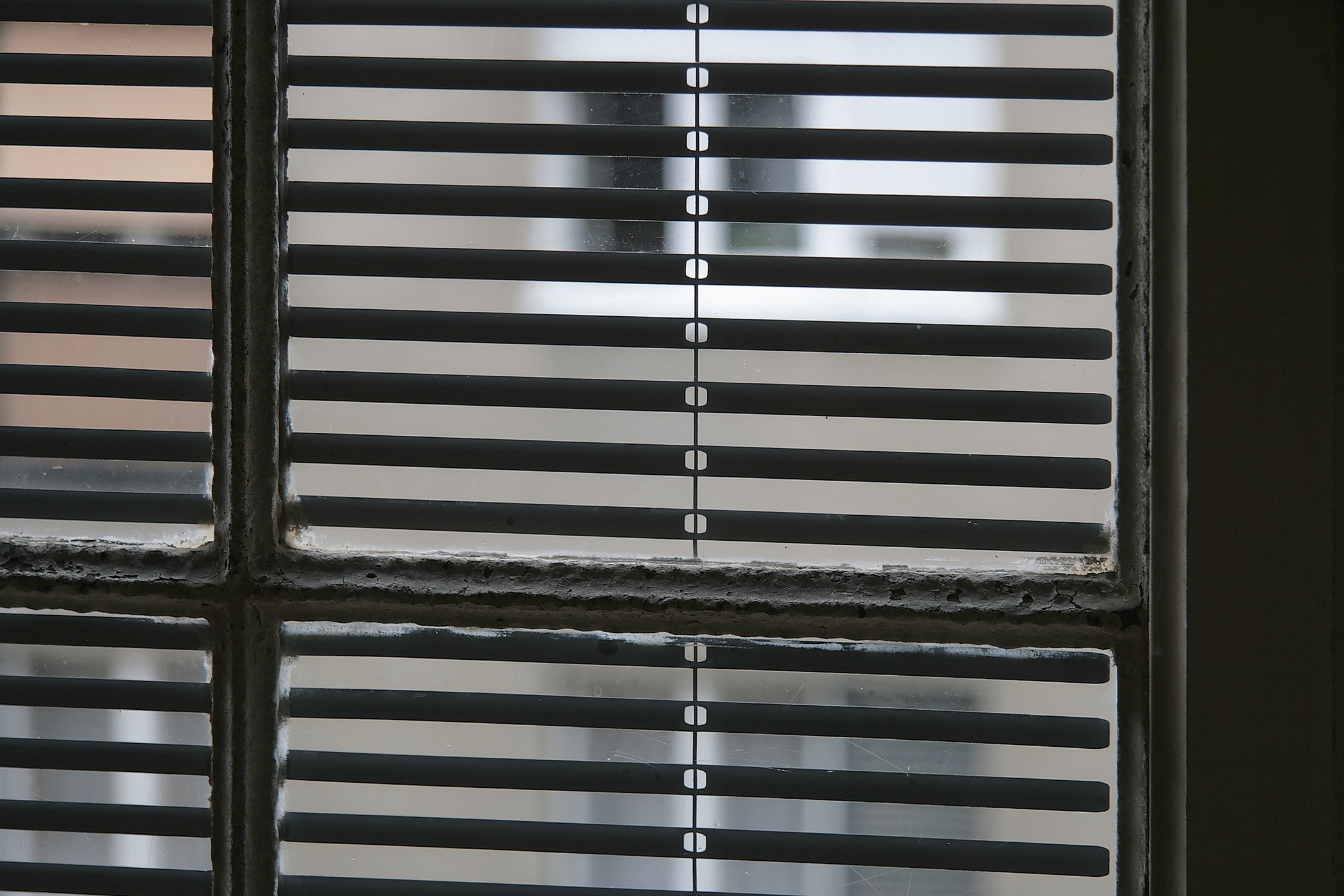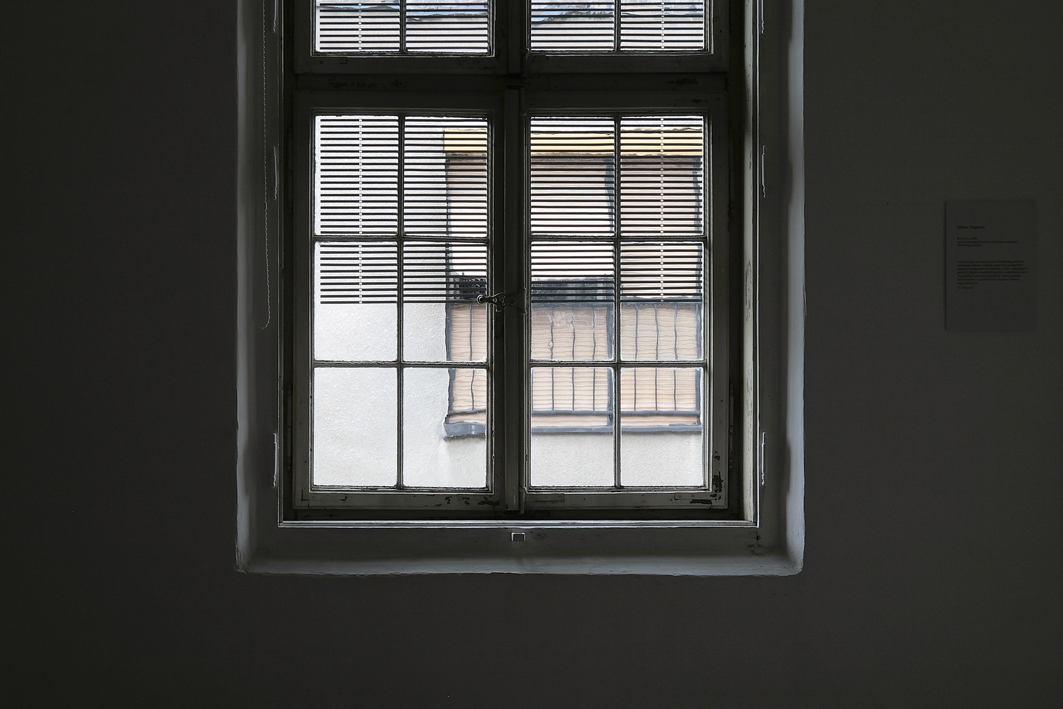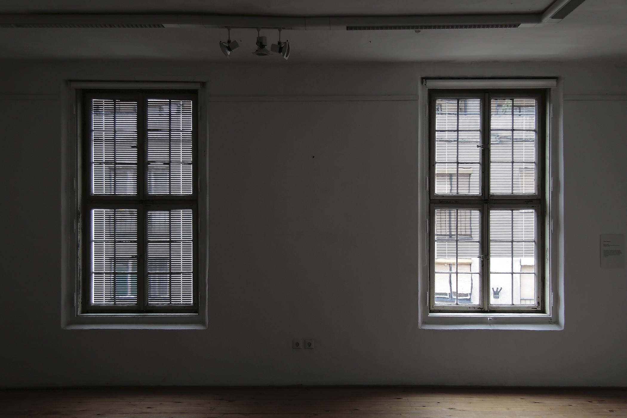 Interventions on the two windows of the exhibition space simulate the outlines of movable office window blinds raised to different heights. A common and movable object is transformed into a stationary contour unsusceptible to the influence of the individual. The shadow becomes imposed, and the window shading is default and immutable.
