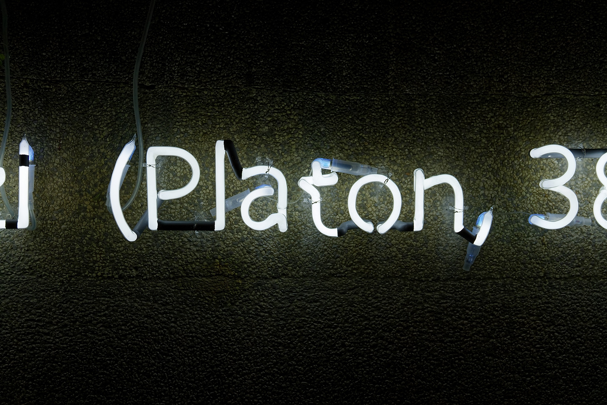 A textual artwork made out of argon light tubes at the entrance of the exhibition venue. It said: