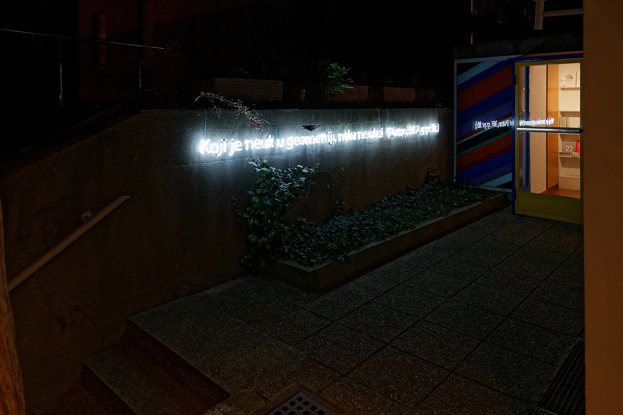 Let no one ignorant of geometry enters. (Plato, 387 B.C.). It is believed that this inscription had been placed at the entrance of Plato’s Academy. In this case, geometry can be interpreted in two ways: literally – as a branch of mathematics – and in the context of the inscription as such, as a symbol of abstract thinking aiming at complete understanding, i.e. knowledge. The meaning of the text is linked directly with the work of Vjenceslav Richter, but dislocating the inscription into an exhibition venue and thus multiplying its semantic levels.