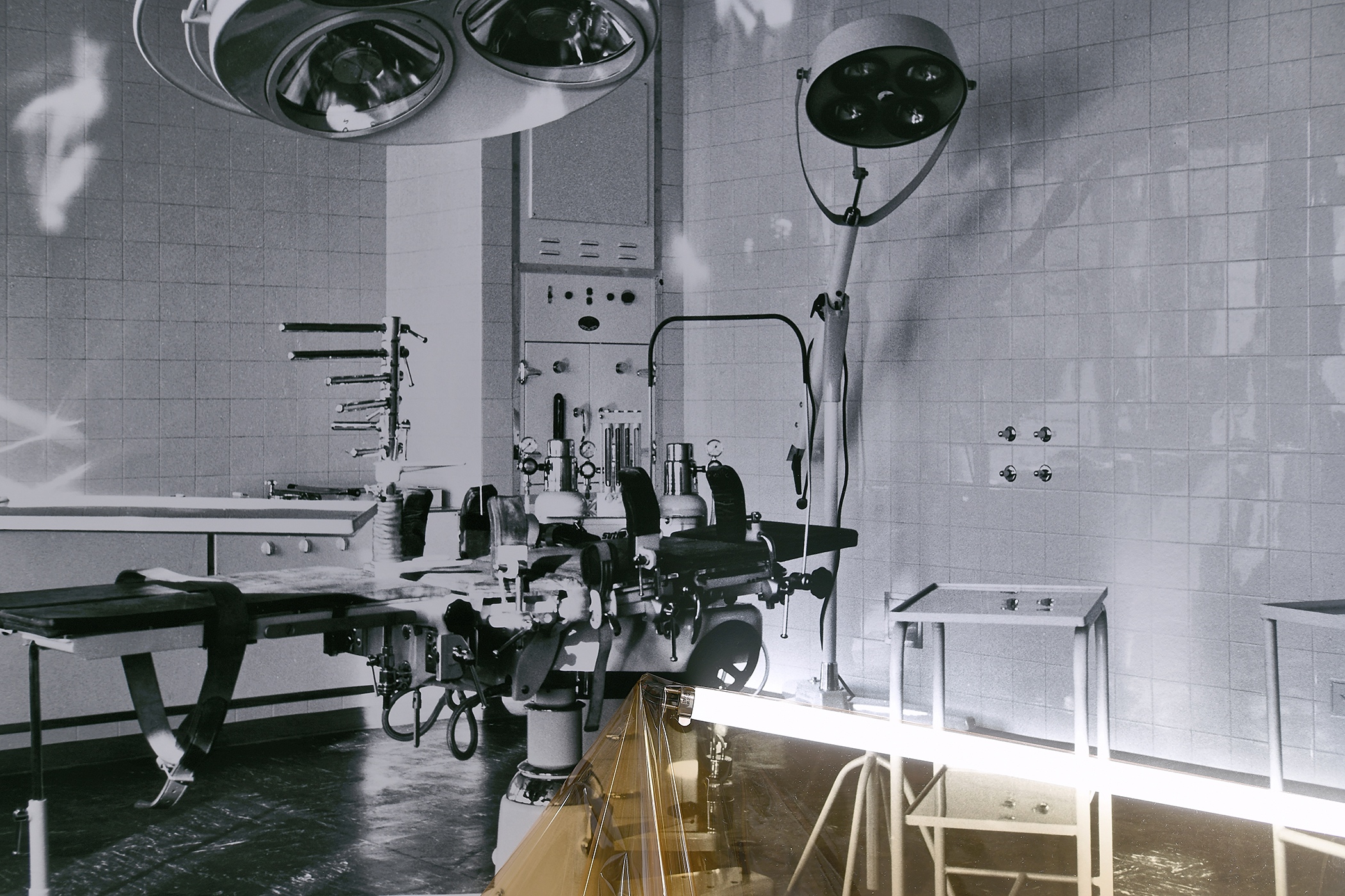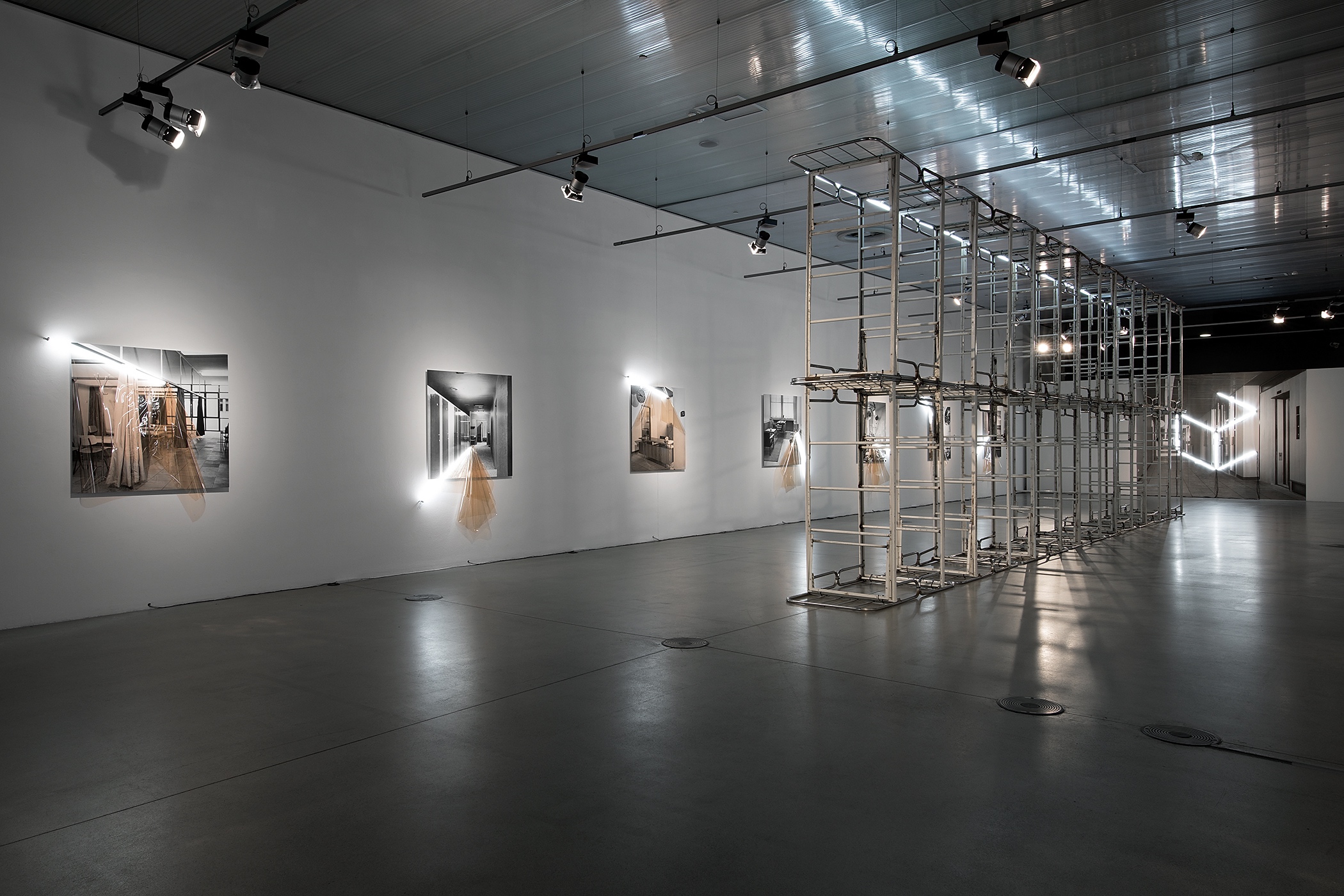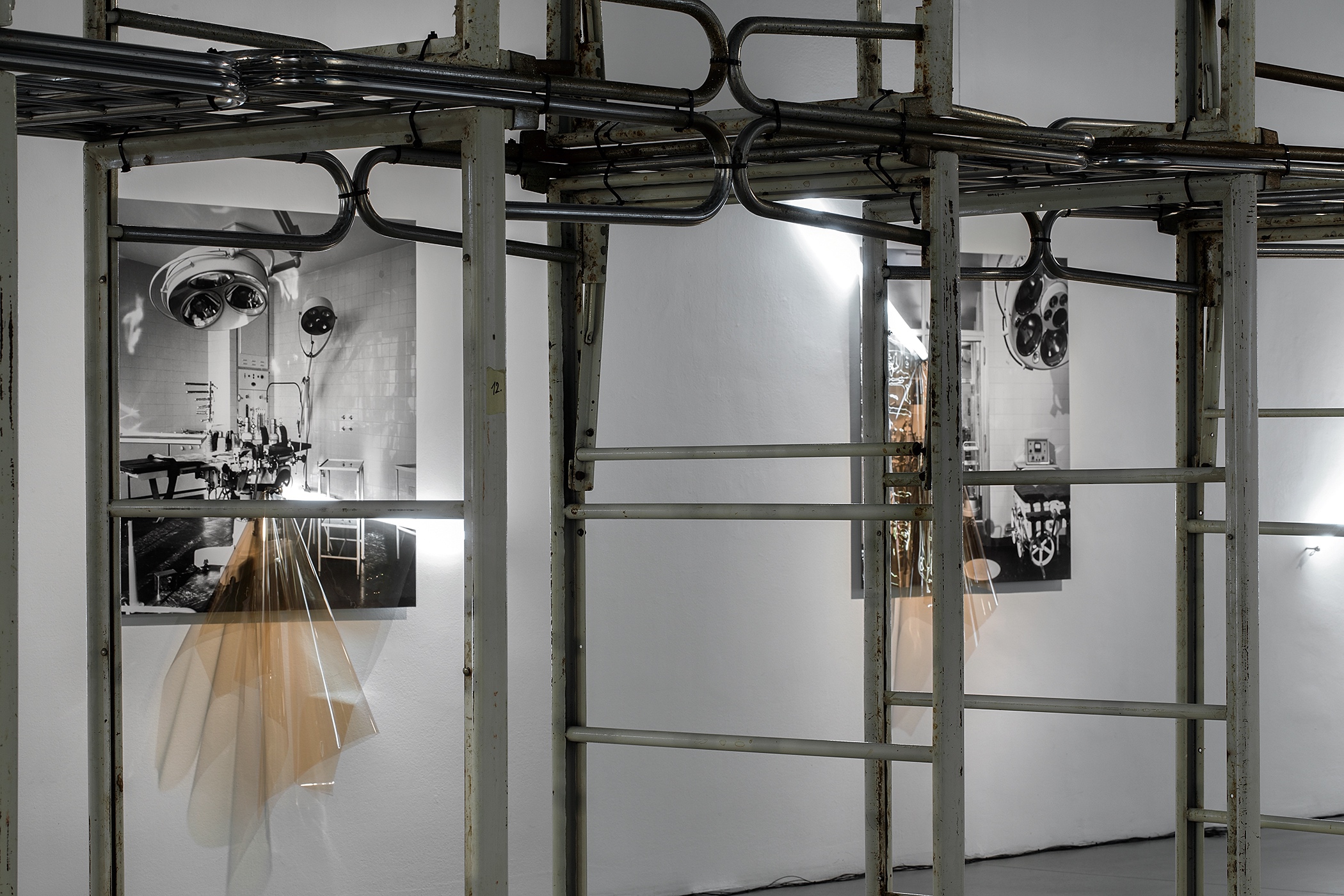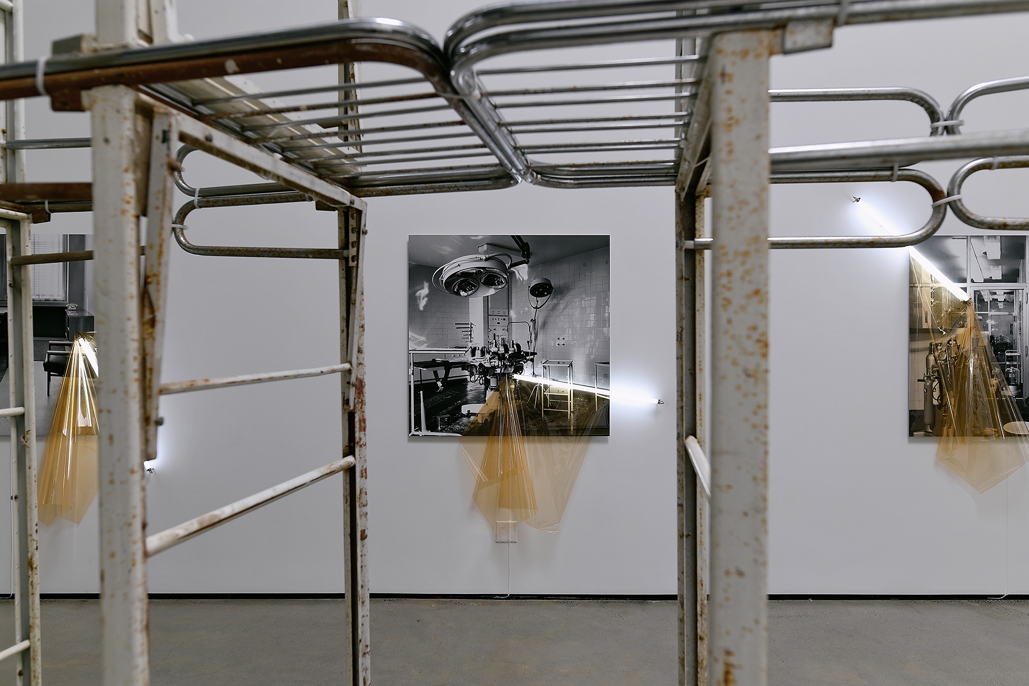 The memory of the represented space is enhanced by the introduction of old bactericidal lamps and scrapped beds taken from the same hospital. With the form of a large installation structure made of iron beds, modernist elements of the architecture of the hospital’s main building are cited. The objects of utility themselves – as carriers of memory – are almost completely anonymized through the geometry of the verticals and horizontals of the newly created architecture.