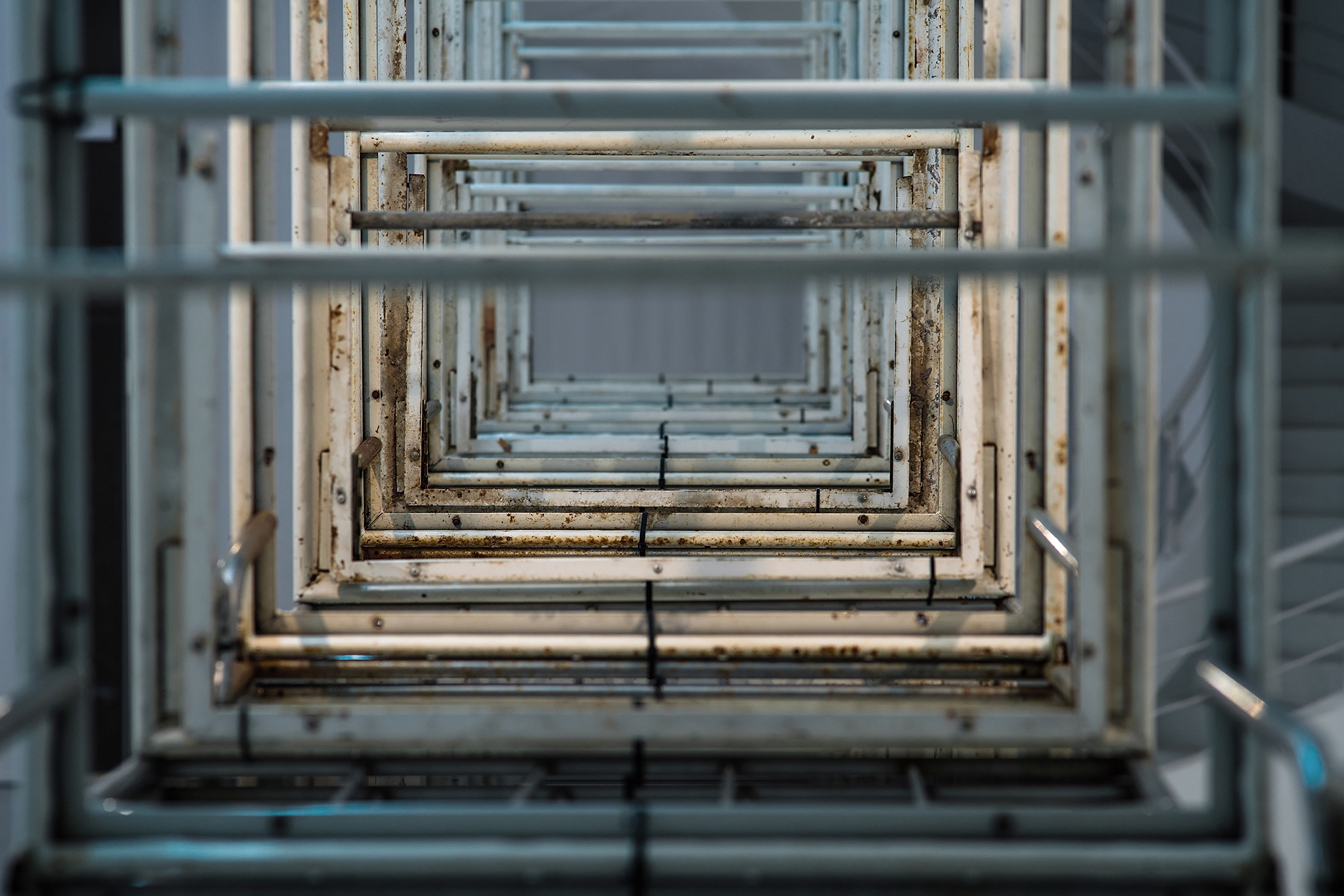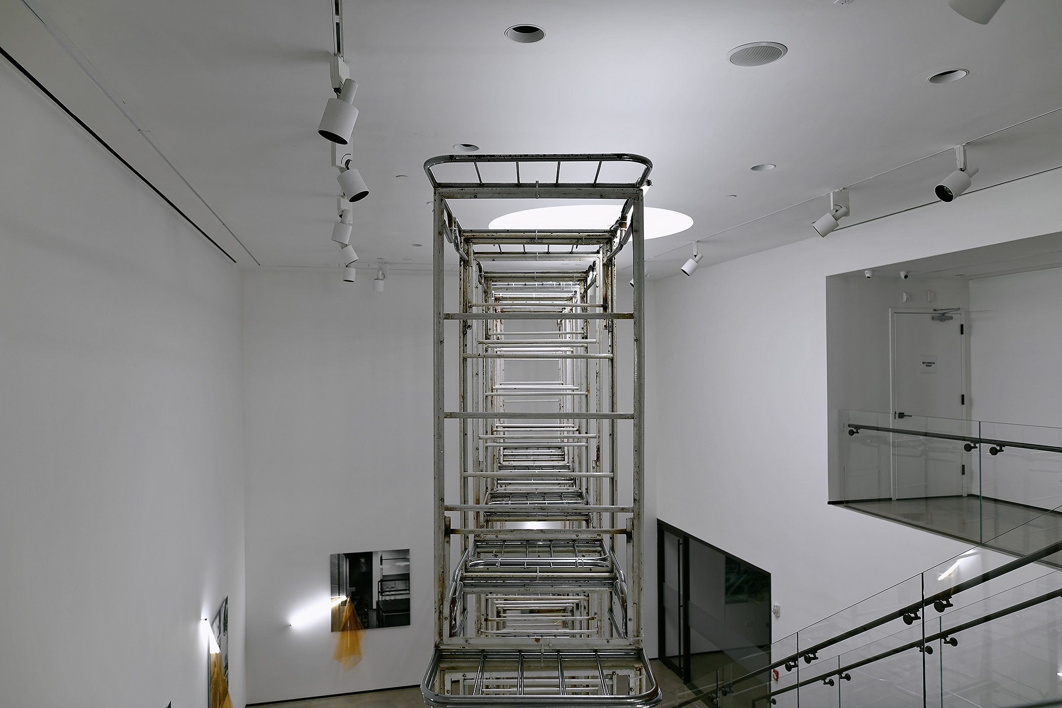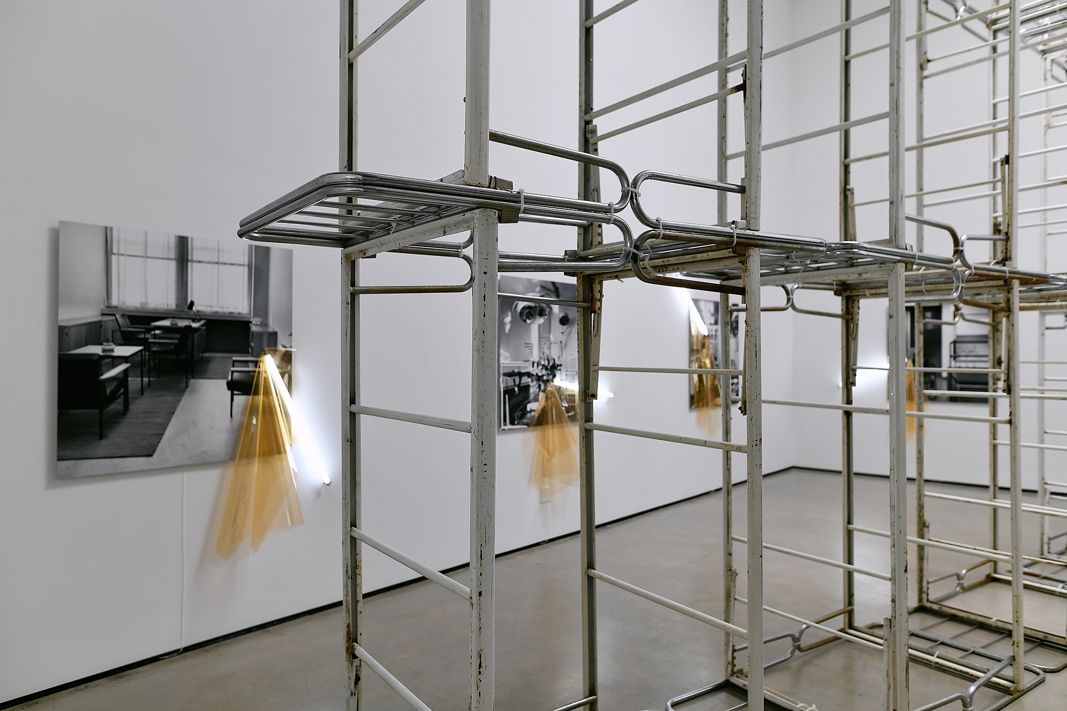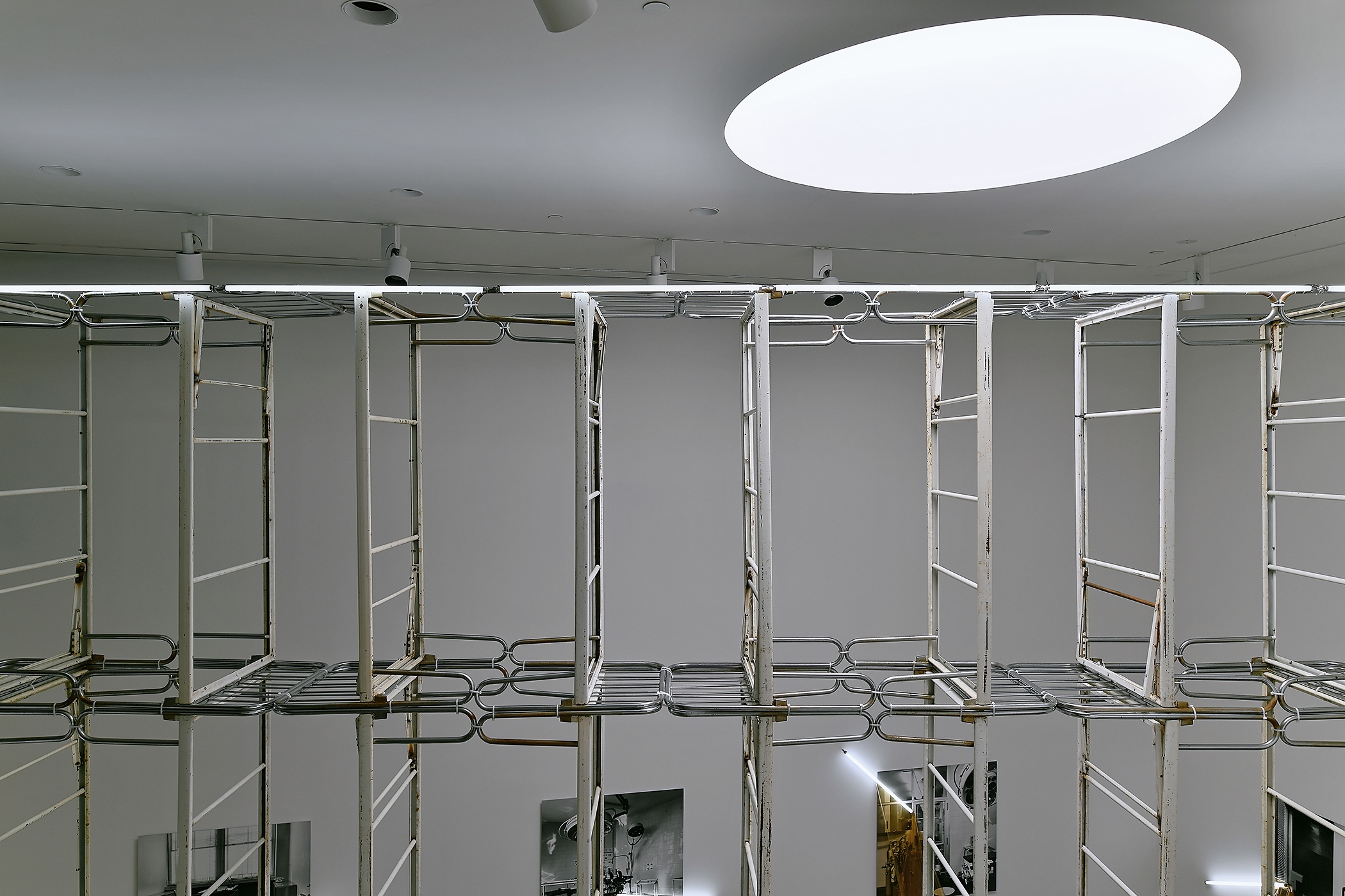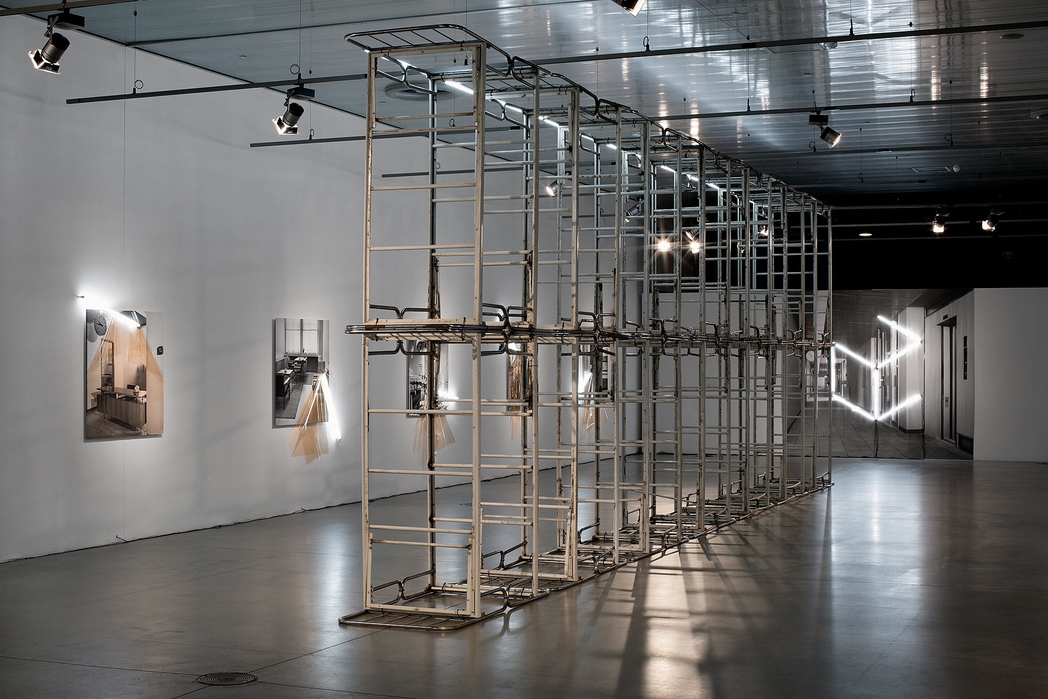 The memory of the represented space is enhanced by the introduction of old bactericidal lamps and scrapped beds taken from the same hospital. With the form of a large installation structure made of iron beds, modernist elements of the architecture of the hospital’s main building are cited. The objects of utility themselves – as carriers of memory – are almost completely anonymized through the geometry of the verticals and horizontals of the newly created architecture.