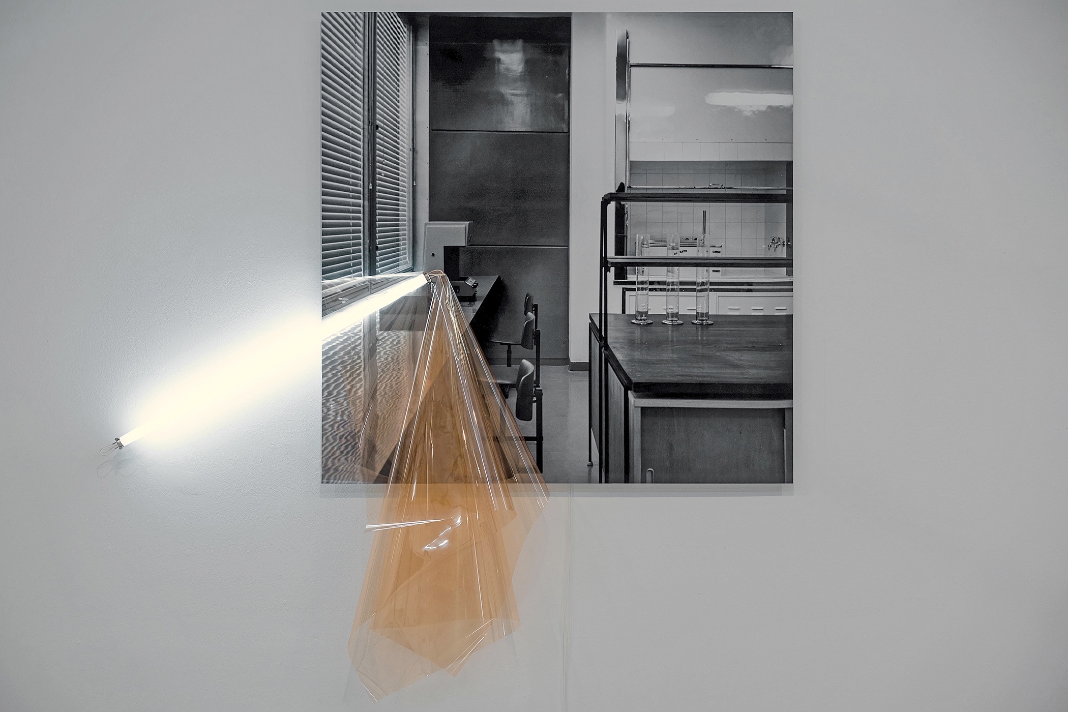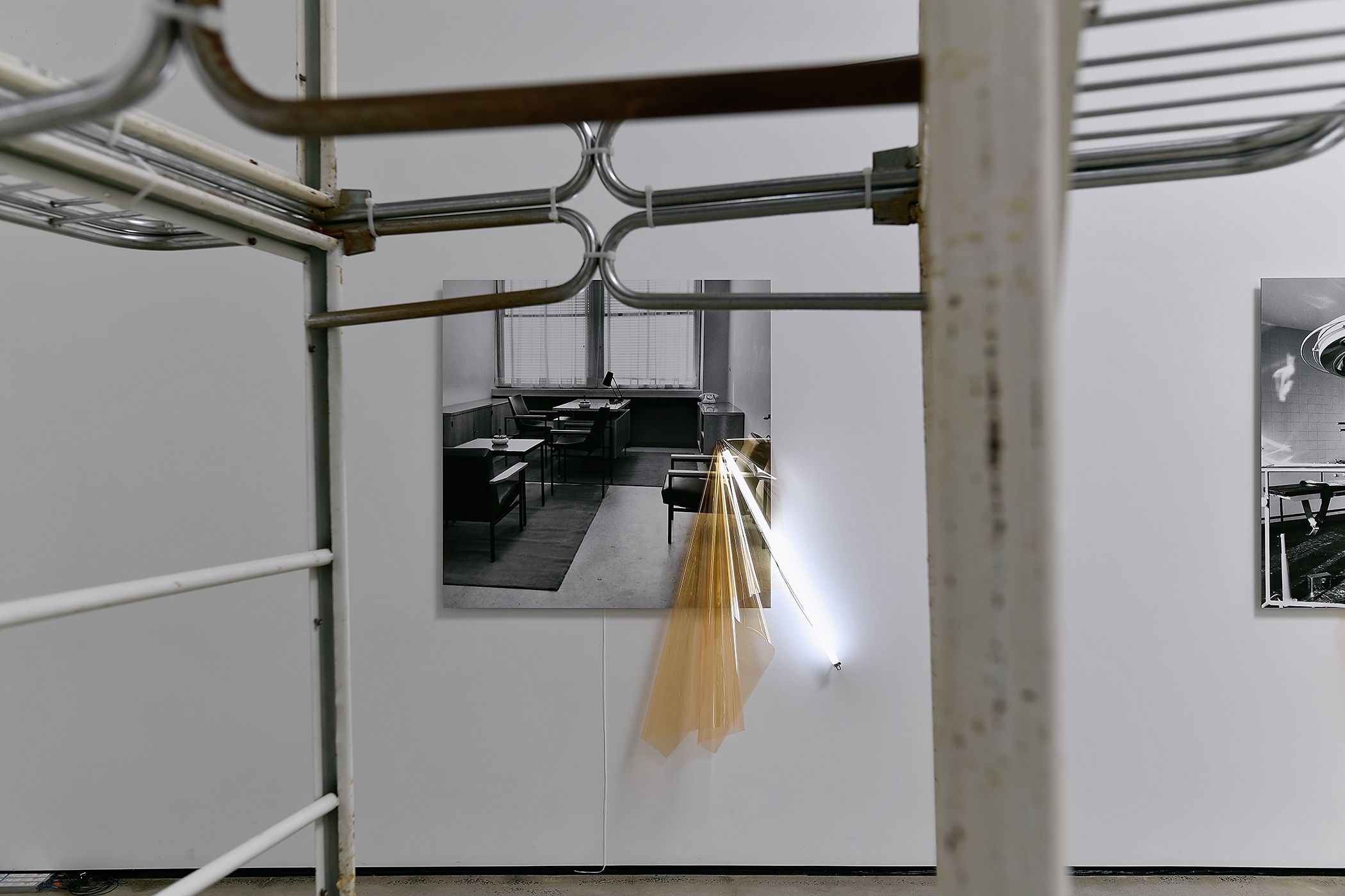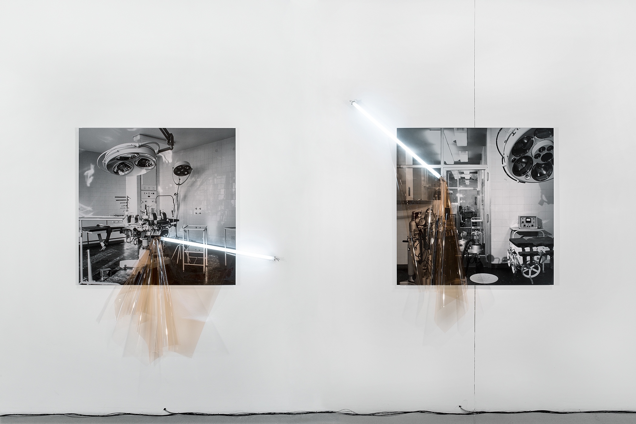 The wall works are hybrids at the intersection between photography, relief, and object. It consists of digital prints of archival photographs of the hospital’s exterior taken in 1965, before the hospital’s inauguration. Each print is mounted on an aluminum board and forms a background for industrial filters for color correction that have been fixed to the photographs with fluorescent light tubes.