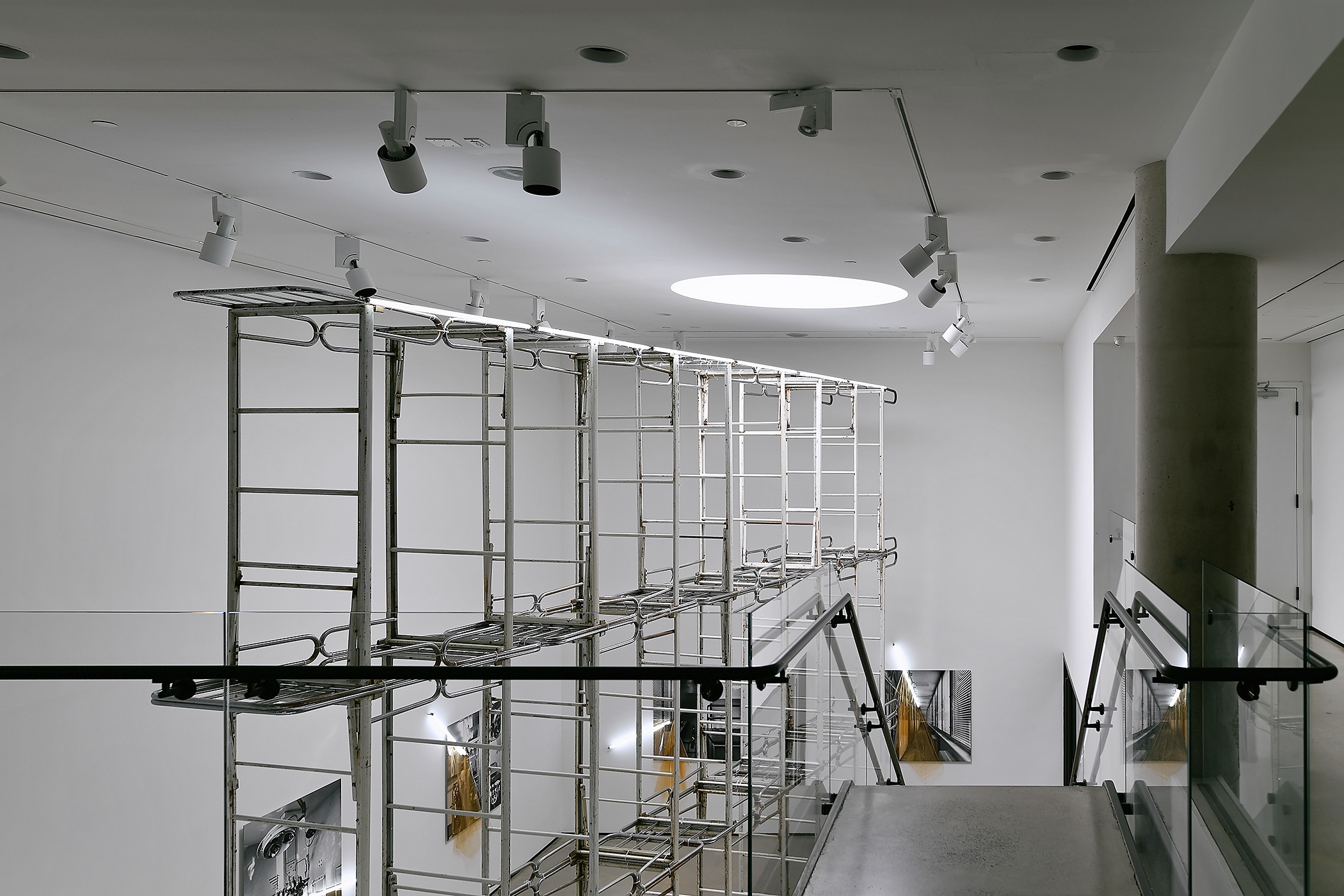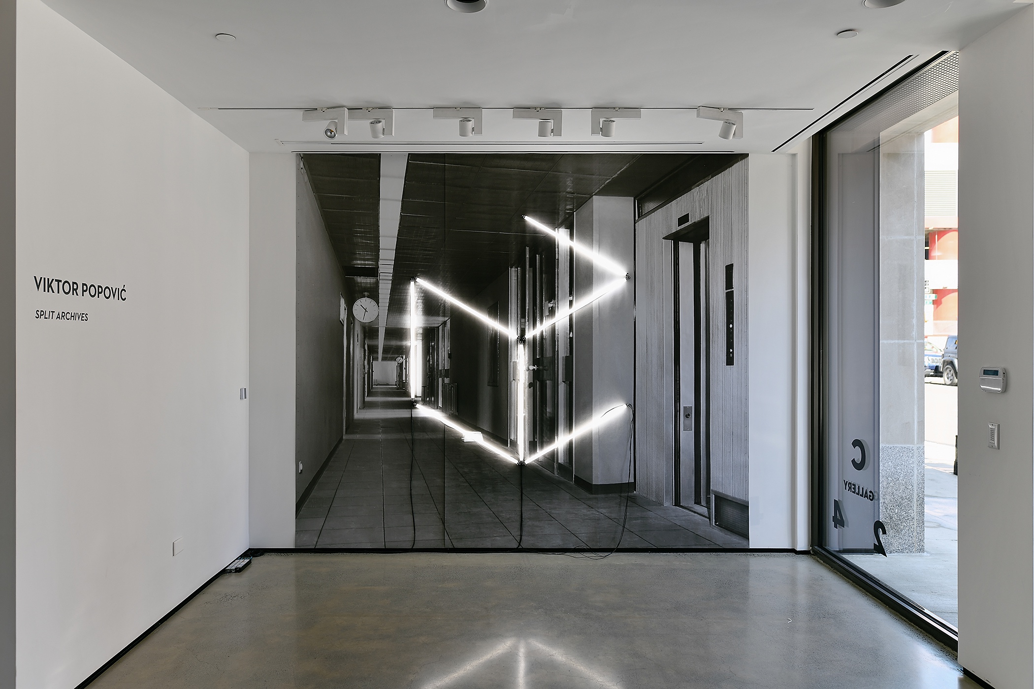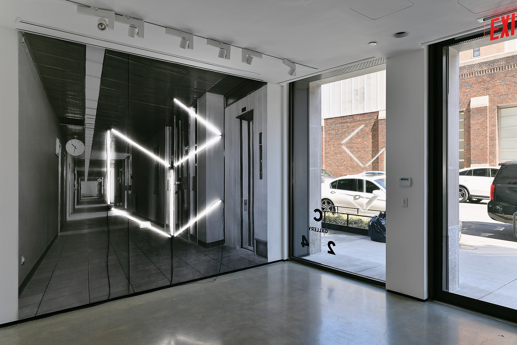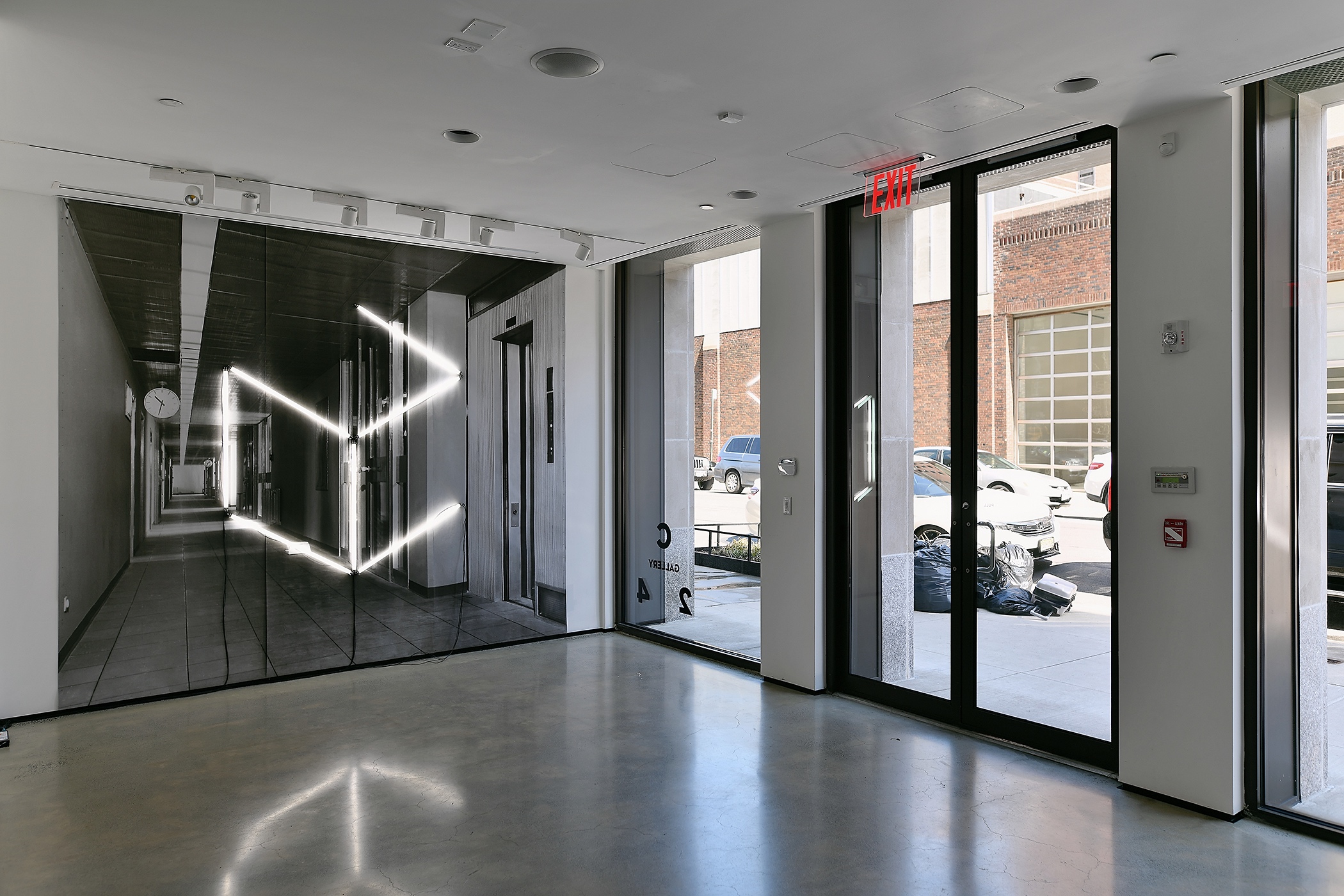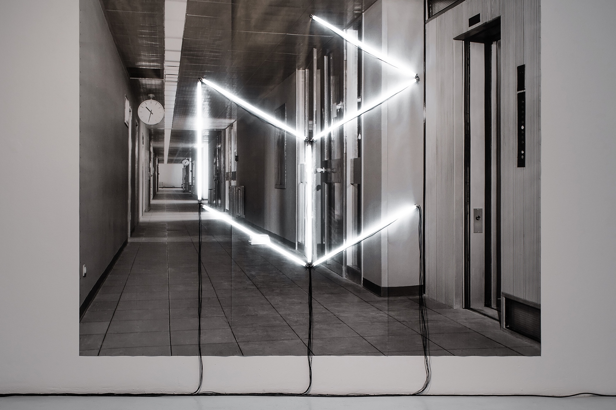 The print for the large wall work is mounted on the wall and forms a background for the construction of fluorescent tubes. The tubes form an isometric drawing that accentuates the constructivist roots of modernism.