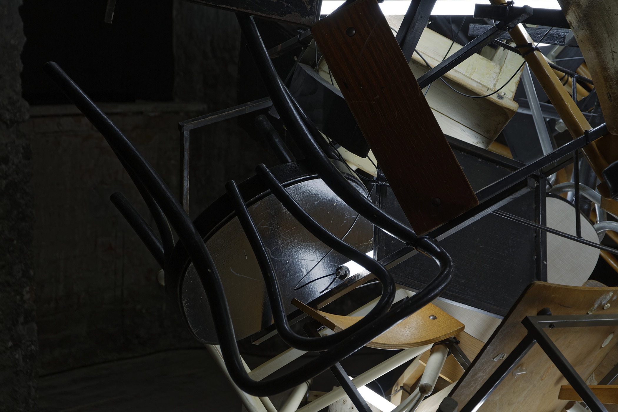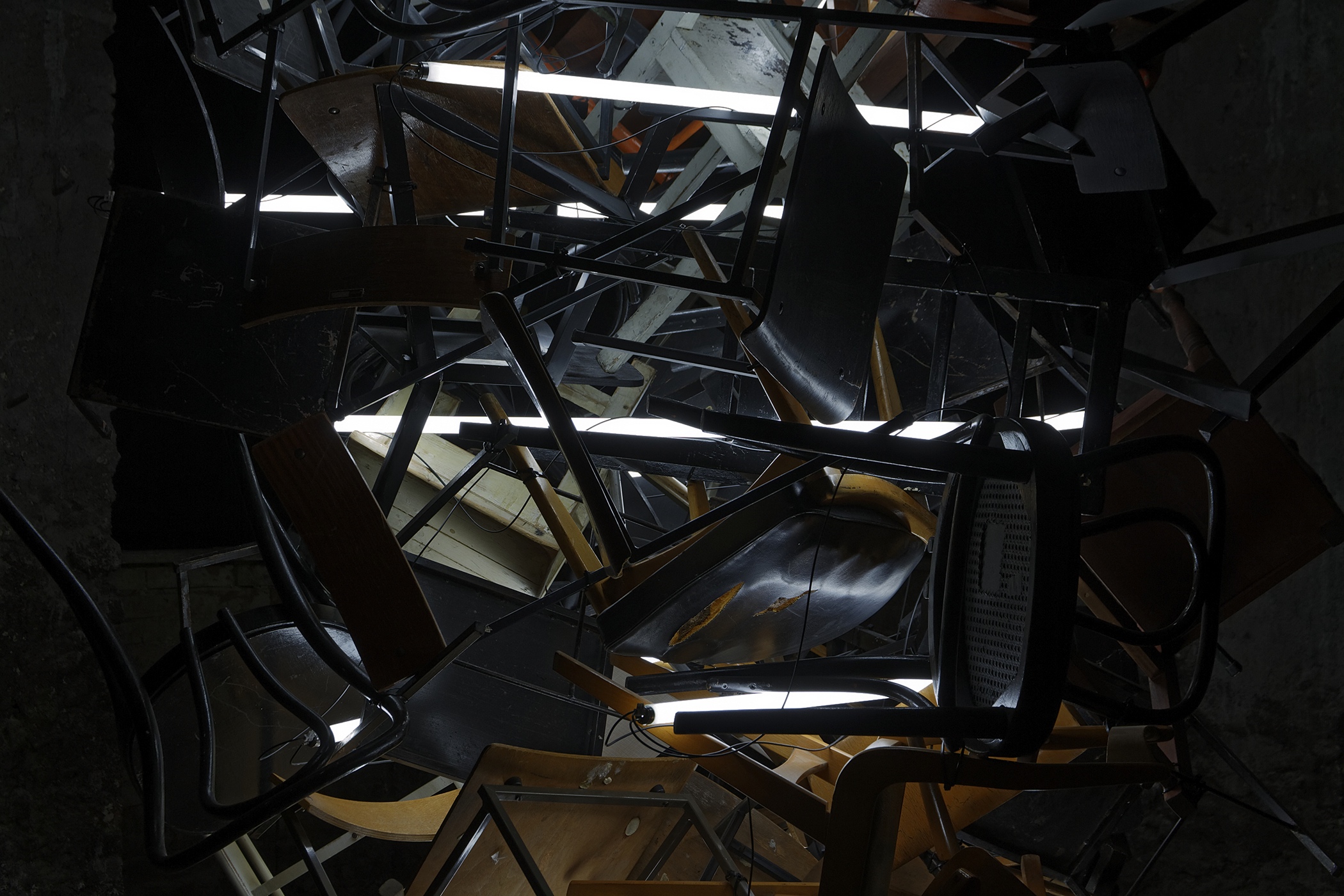 The installation was made from chairs borrowed from Slovenian National Theatre Drama in Ljubljana. Items were removed from their original context, preventing their use as functional objects and thus gaining a new artistic context. The procedure is very straightforward, there is no simulation – the chairs are attached to a seemingly chaotic pile. Now come to the fore their shape, their ability to create a visually interesting whole. The chairs, each carrying their own story, indicate traces of wear, in contrast to the luminous fluorescent tubes placed within the installation. On one side are worn objects of daily use, on the other cold, the light that defines them is almost symbolically transformed into the exhibition display. The process ends when, after the closing of the exhibition, the chairs are returned to the owner in their original context. No penetration of art and real life does not stop there, because when the items become mere objects again, are enriched by the memory of their artistic existence.