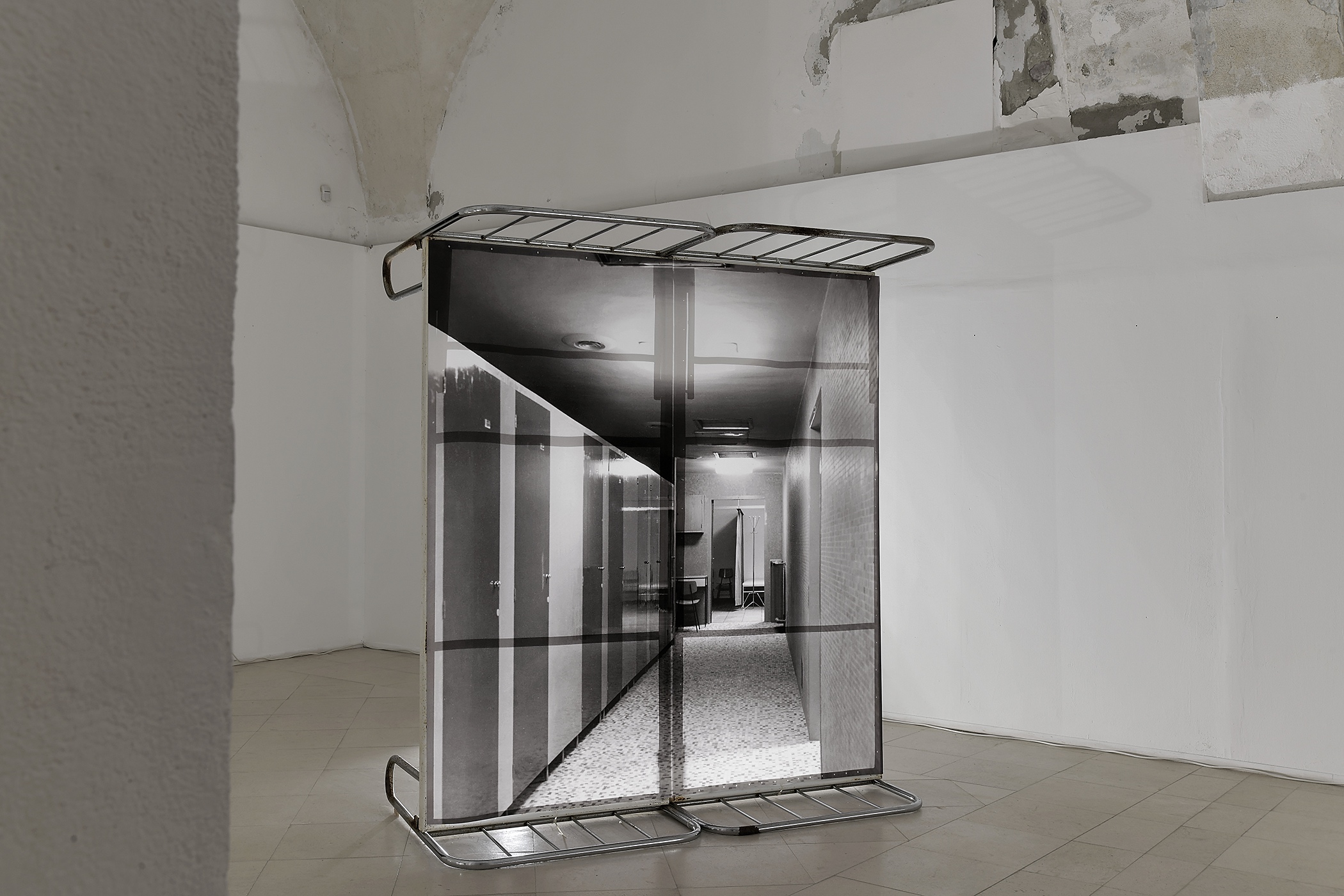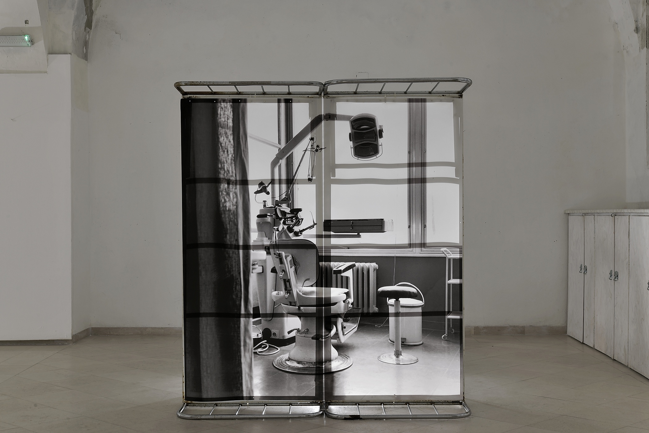 The work is a hybrid of photography and light installation. It consists of digital prints of archival photographs of the hospital’s interior taken in 1965, before the hospital’s inauguration. The photographs represent a clinical view, distanced and cold, and include a temporal distance from the represented subjects, pointing out the relationship between place and document. Each print is mounted on the pair of vertically placed old hospital beds, as a freestanding object displayed in space. Beds are not only props of the past in the role of artistic installation, but at the same, they represent some kind of constructions, frames for photographs, and bearers of a certain memory.