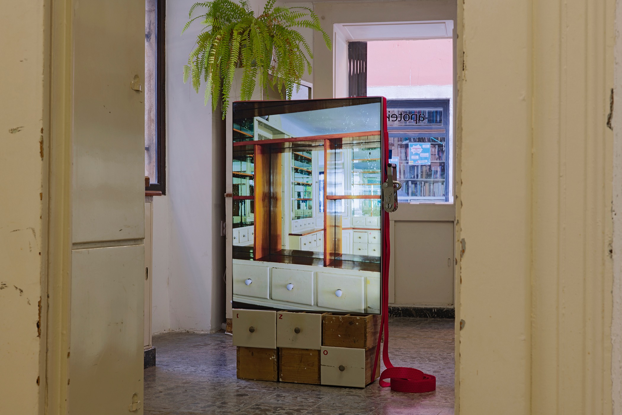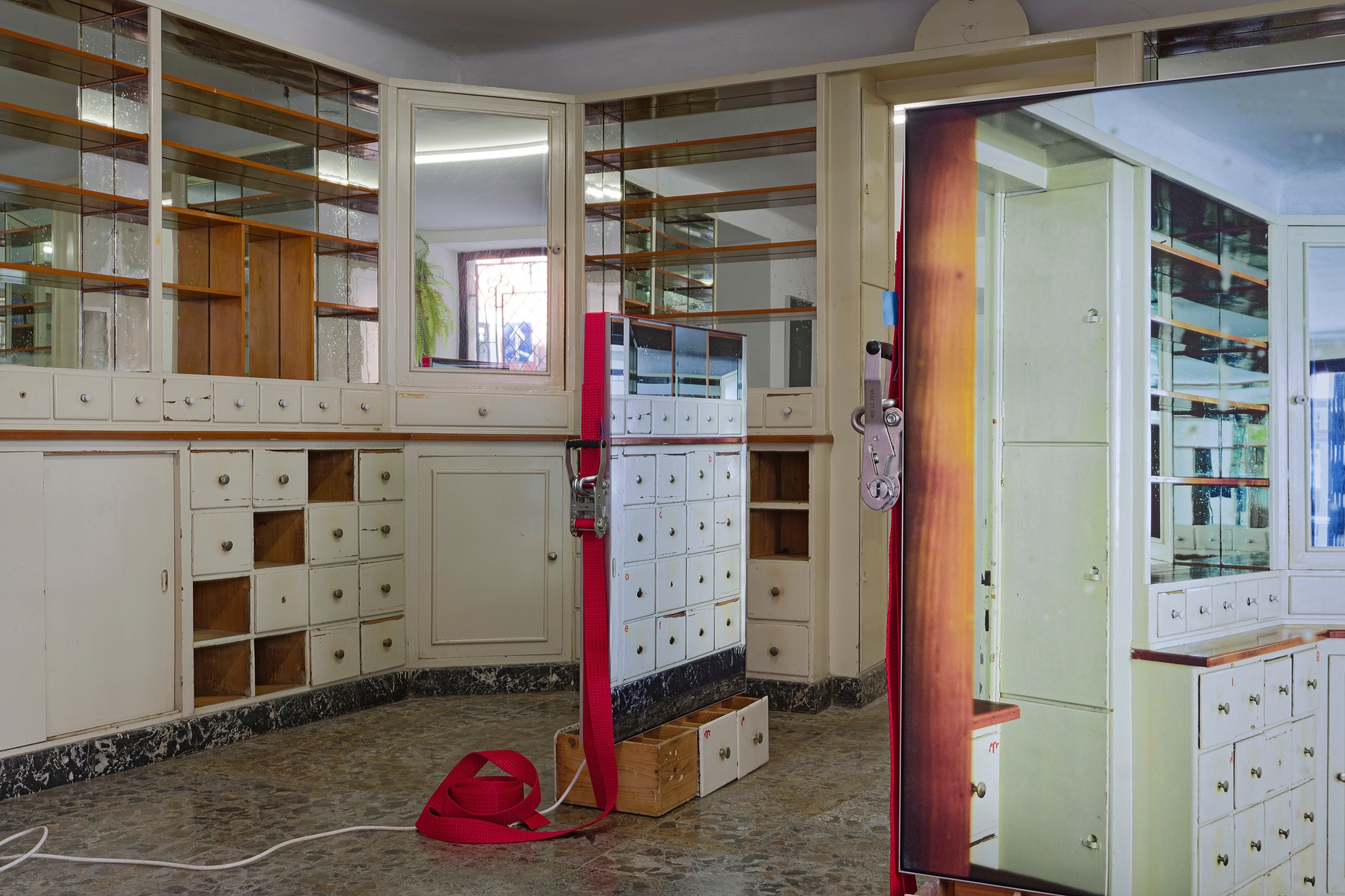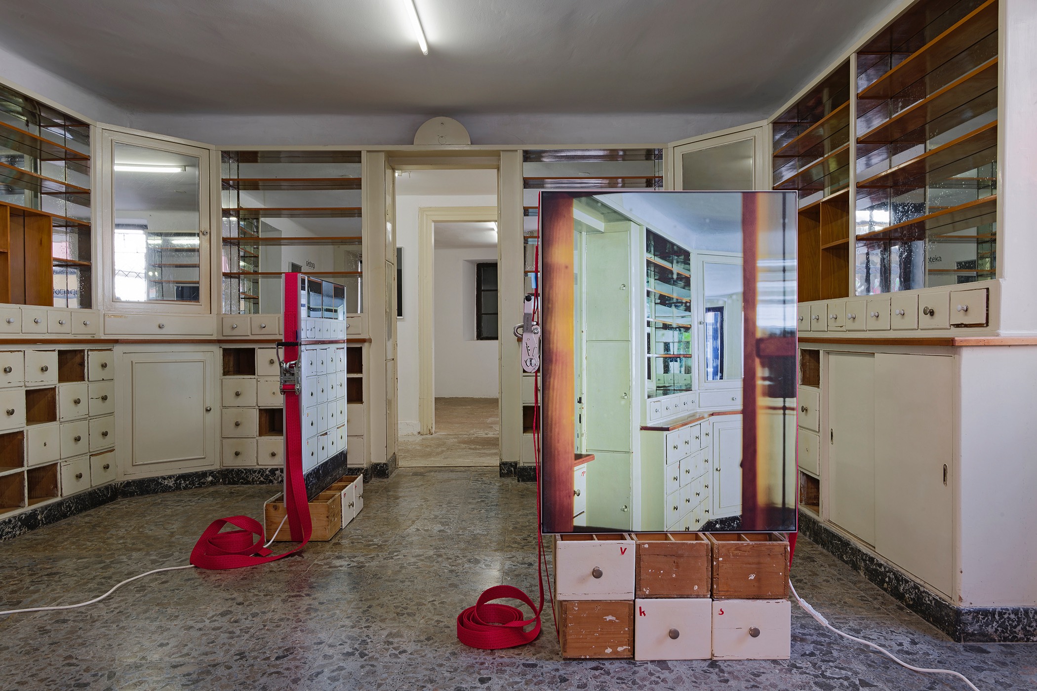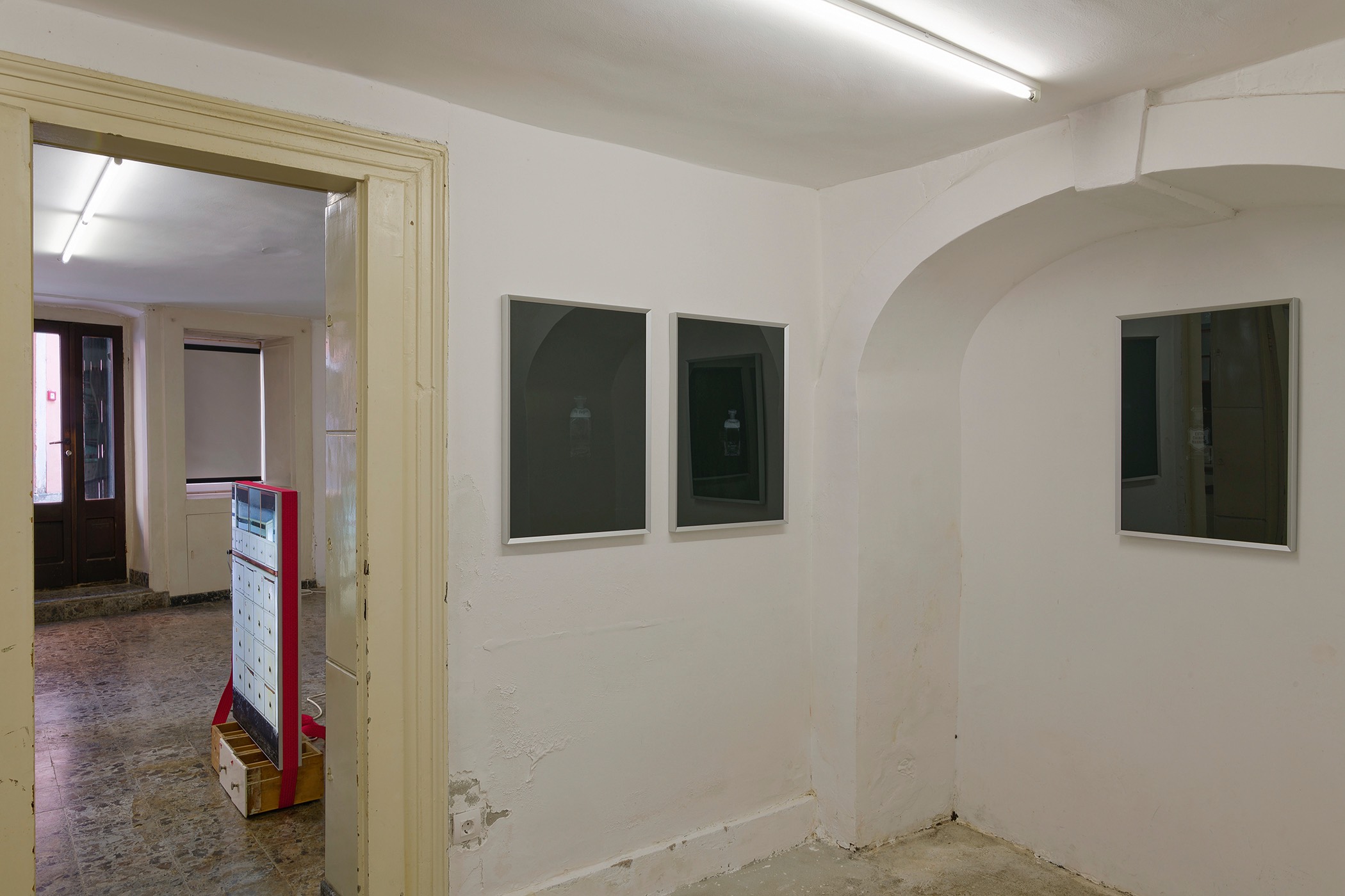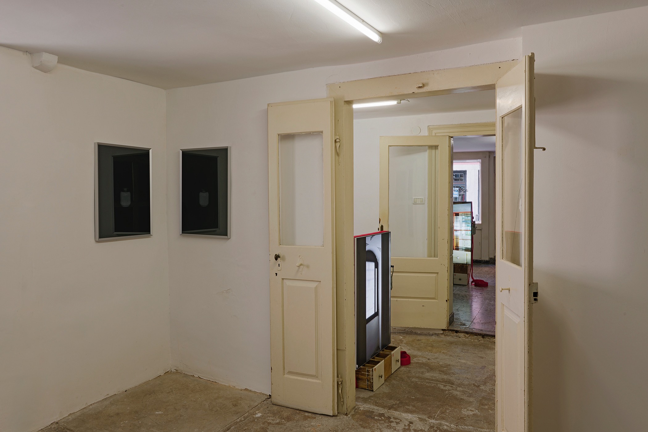 The second series is based on recent photographs of the gallery interior, capturing accumulated traces of time and use. These images are presented in freestanding, double-sided lightboxes, placed on a base constructed from drawers borrowed from the original white pharmacy cabinets still preserved within the space. The drawers, repurposed as sculptural foundations, anchor the photographic installation in the material memory of the site.