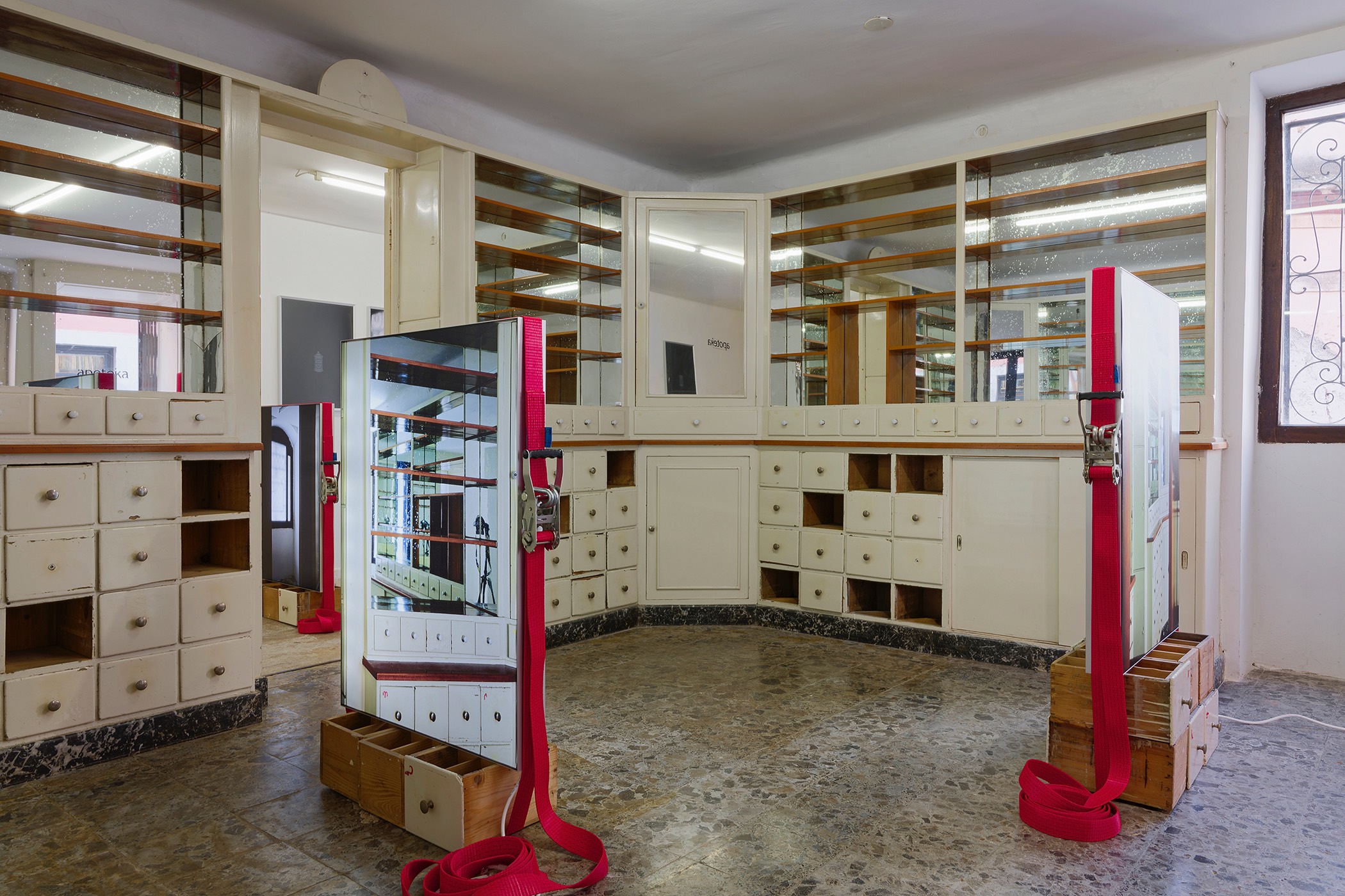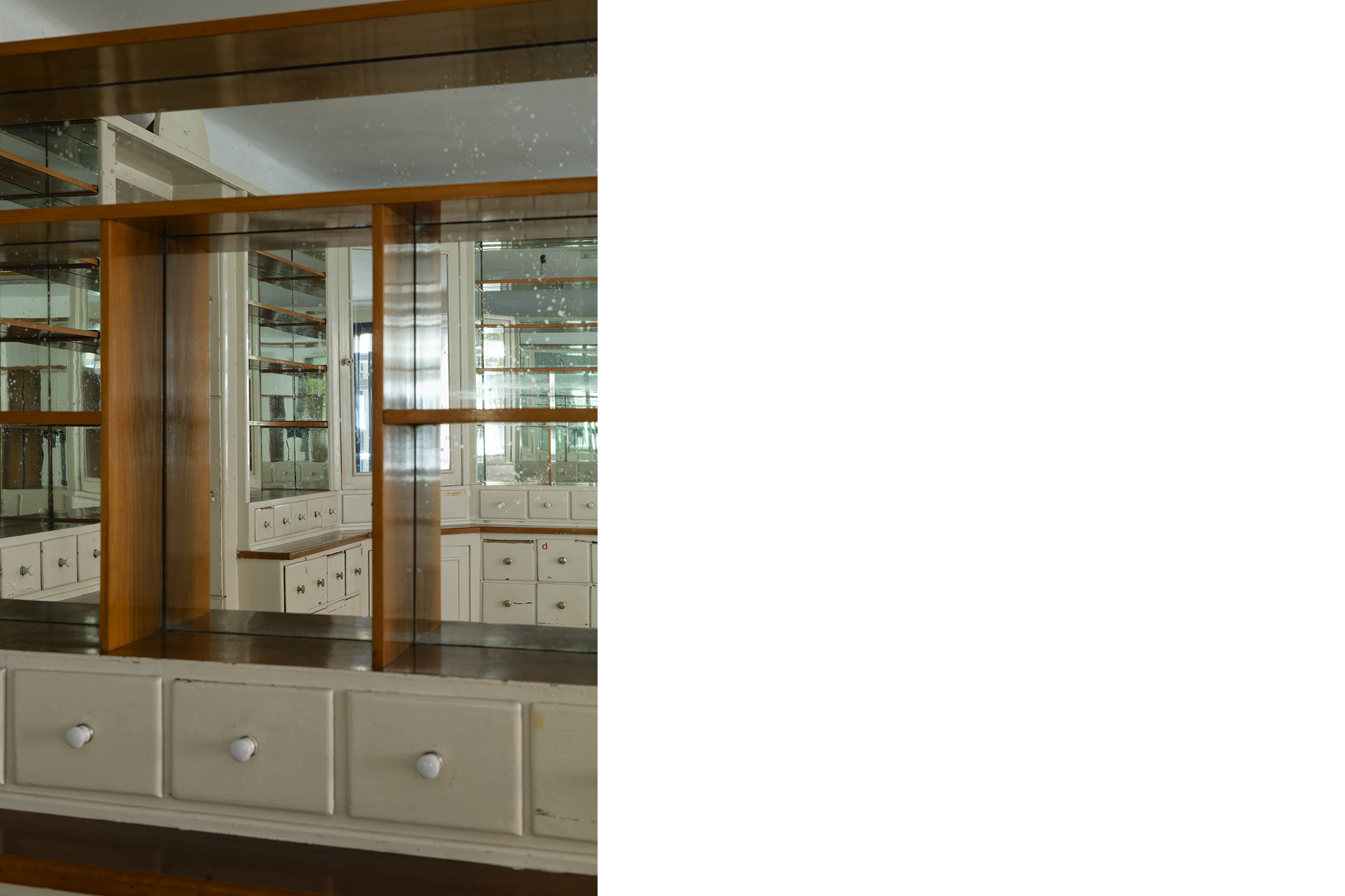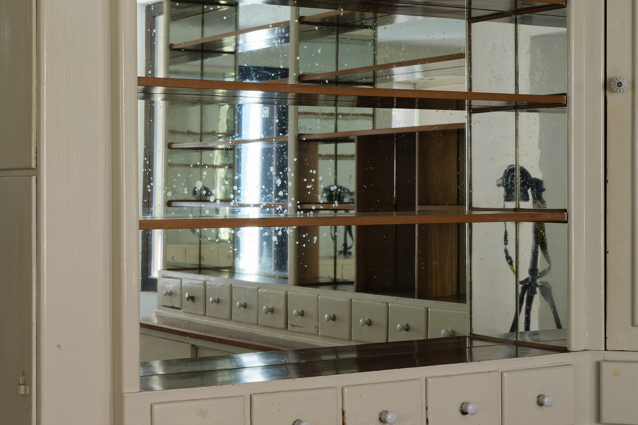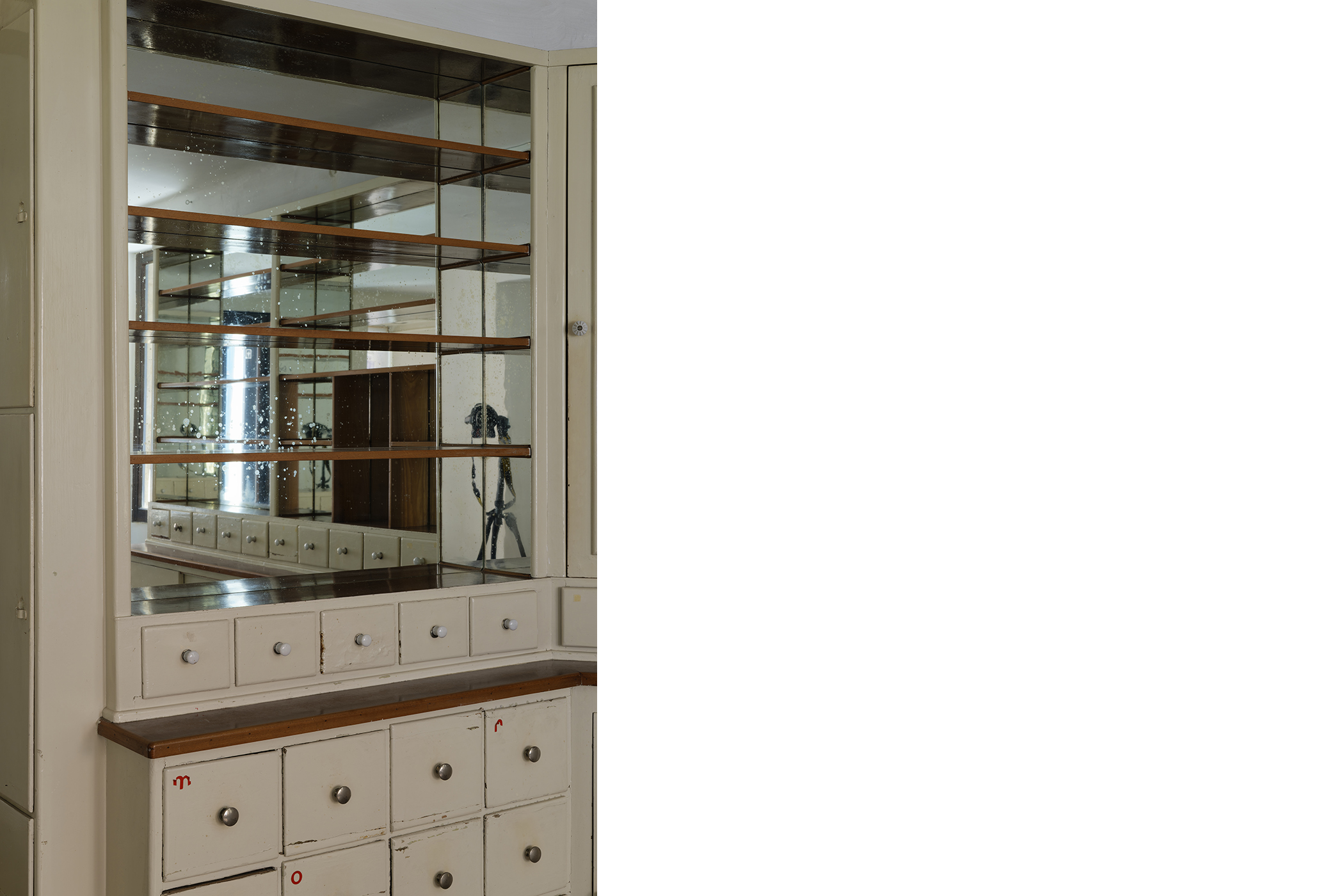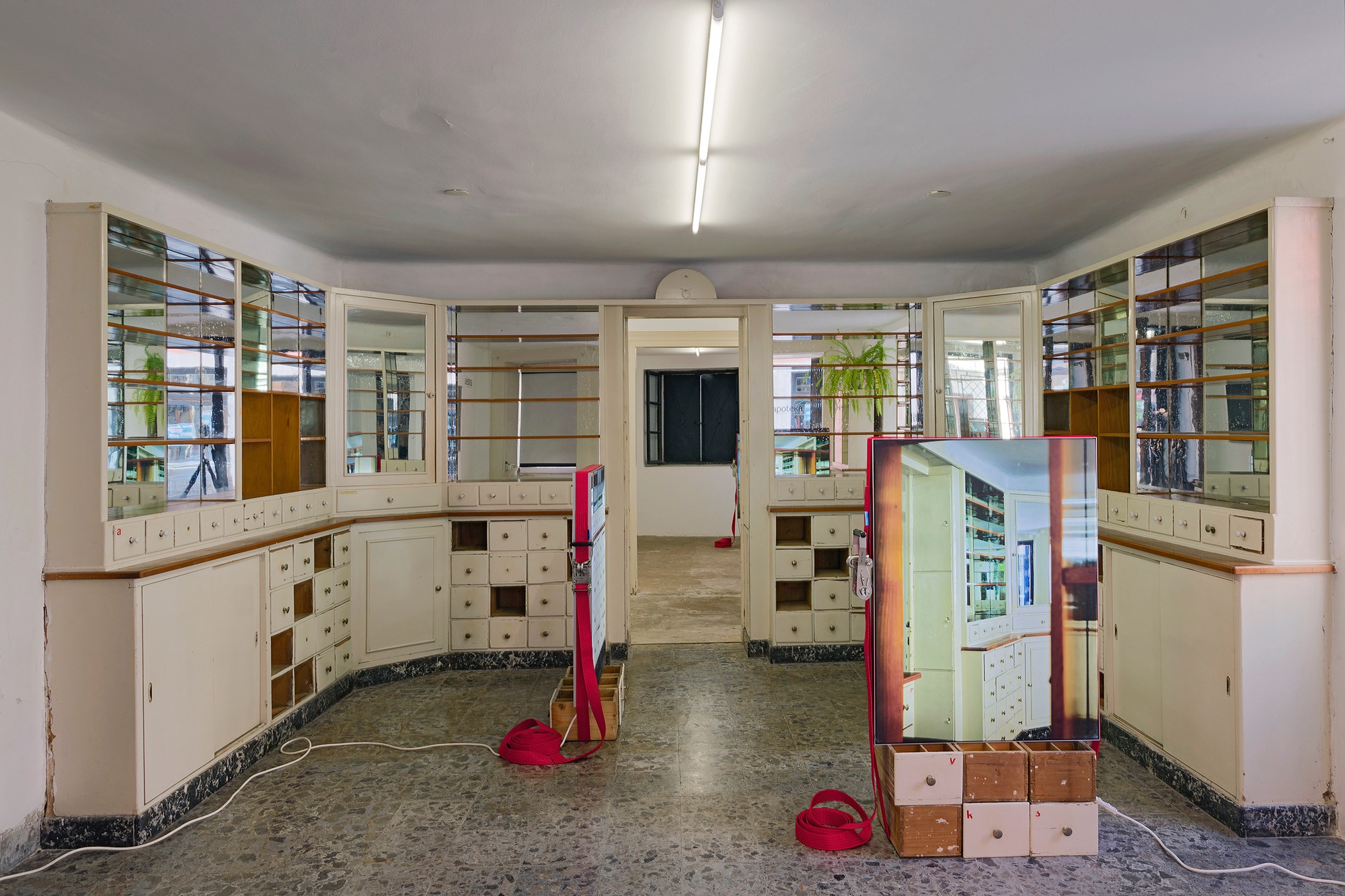 The second series is based on recent photographs of the gallery interior, capturing accumulated traces of time and use. These images are presented in freestanding, double-sided lightboxes, placed on a base constructed from drawers borrowed from the original white pharmacy cabinets still preserved within the space. The drawers, repurposed as sculptural foundations, anchor the photographic installation in the material memory of the site.