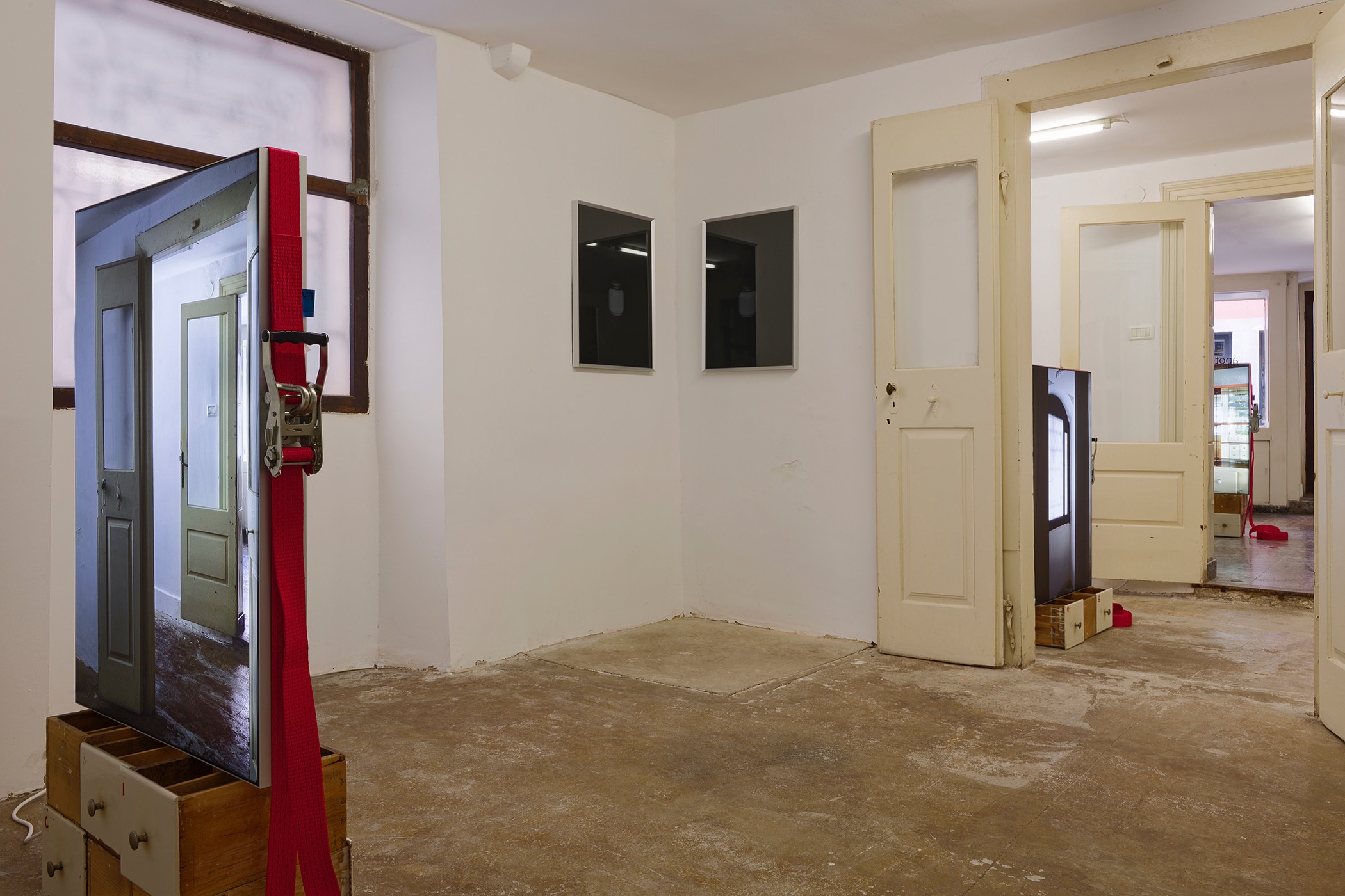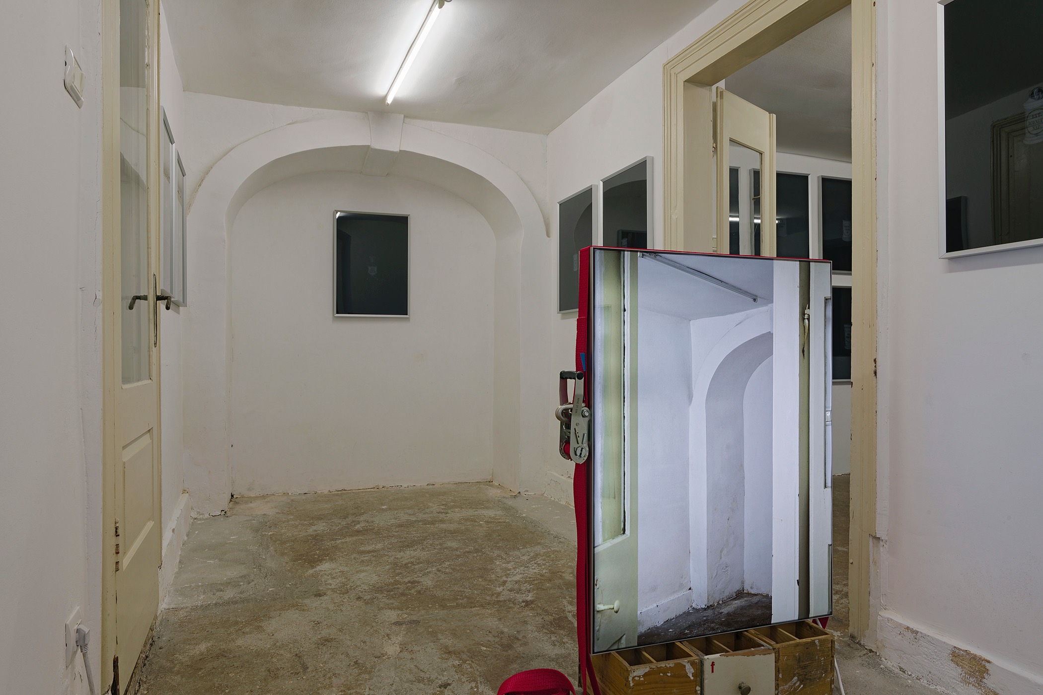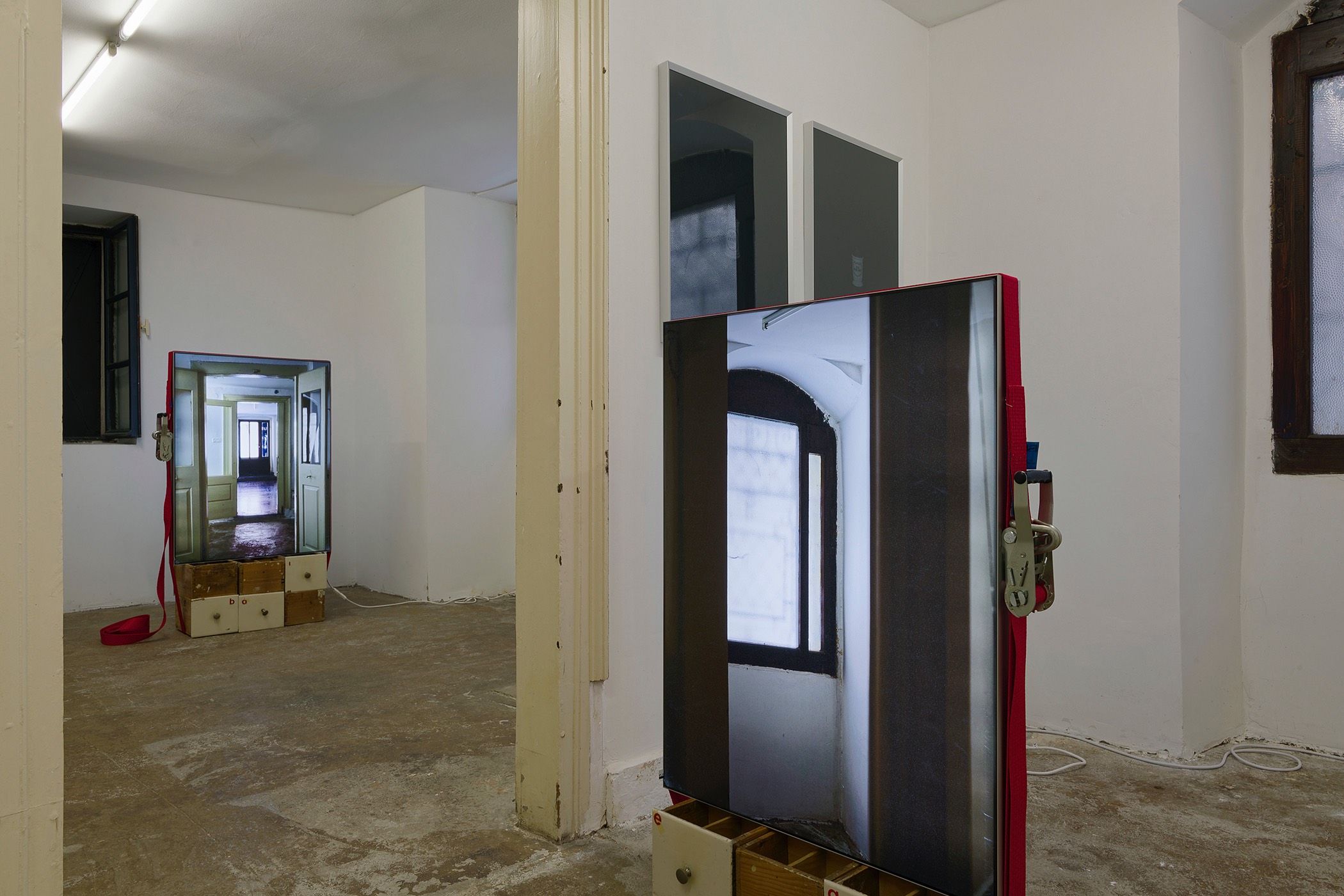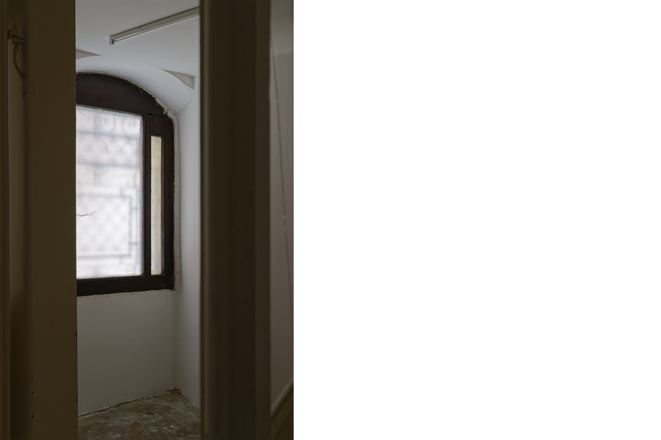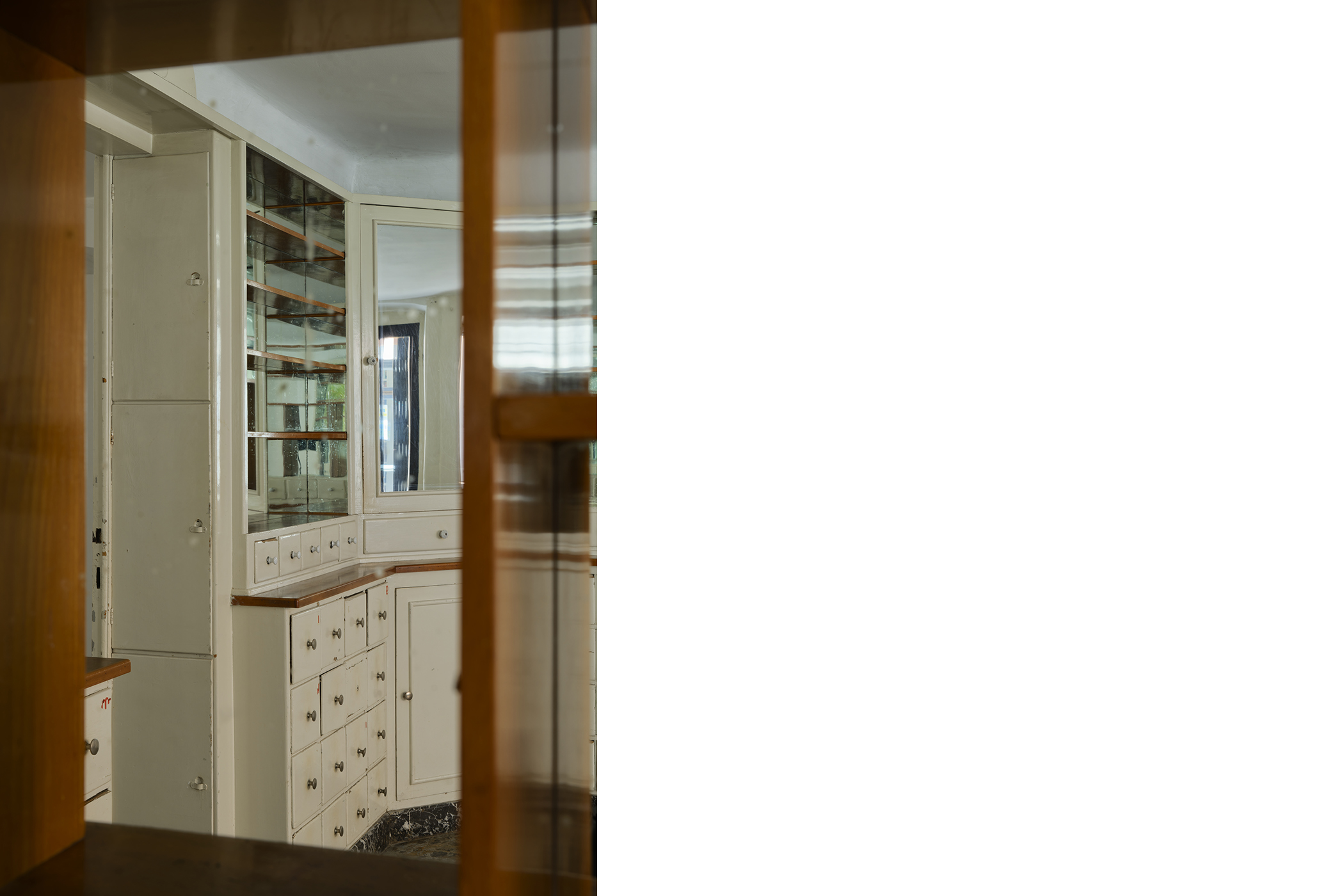 The second series is based on recent photographs of the gallery interior, capturing accumulated traces of time and use. These images are presented in freestanding, double-sided lightboxes, placed on a base constructed from drawers borrowed from the original white pharmacy cabinets still preserved within the space. The drawers, repurposed as sculptural foundations, anchor the photographic installation in the material memory of the site.