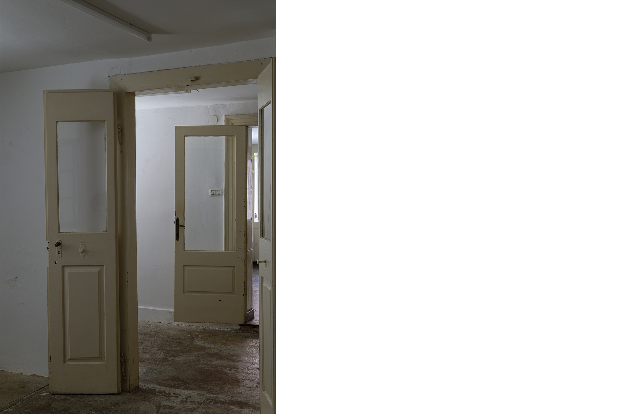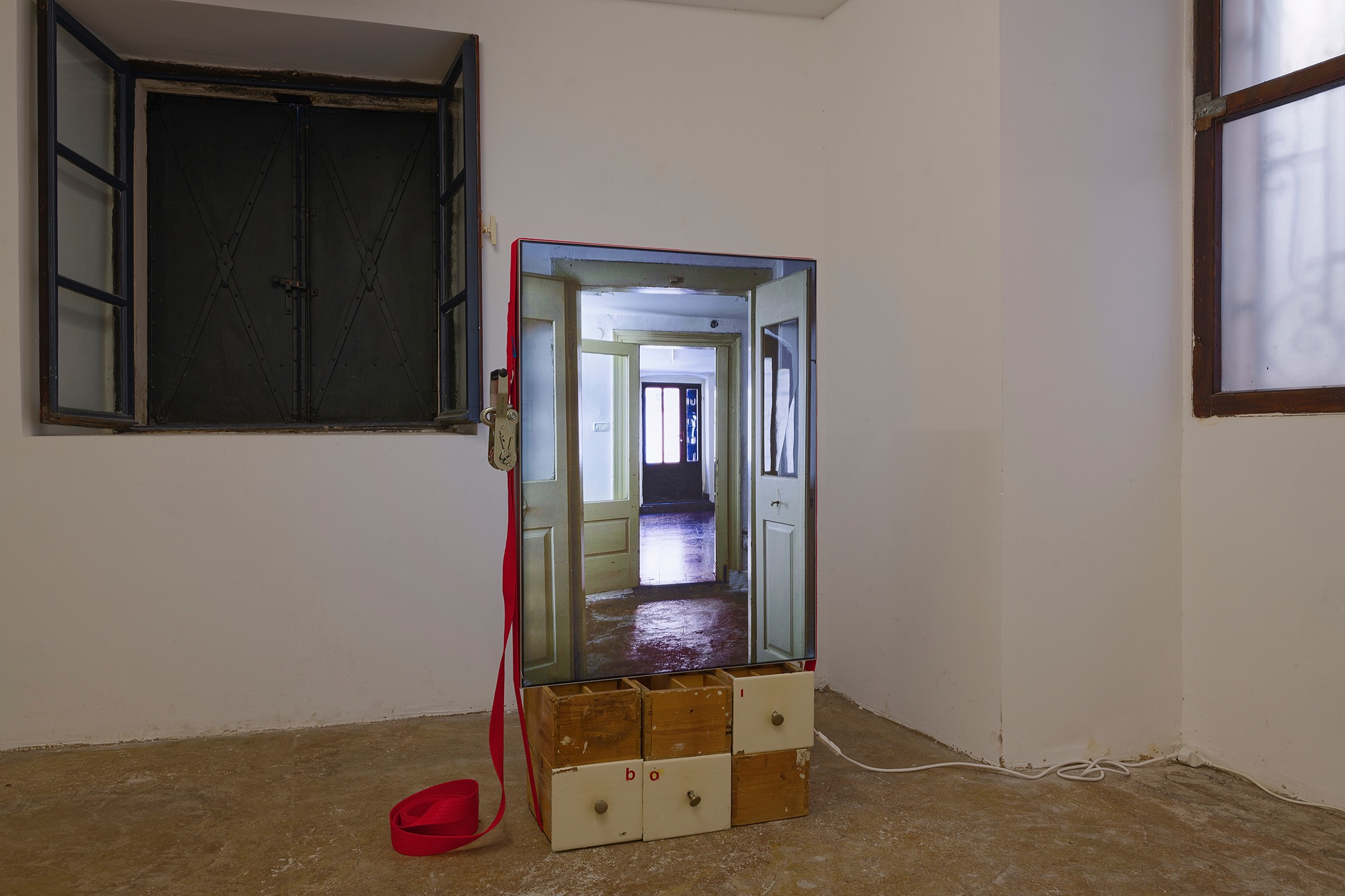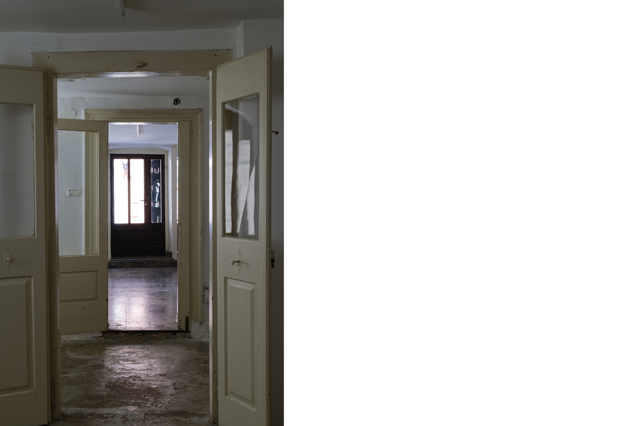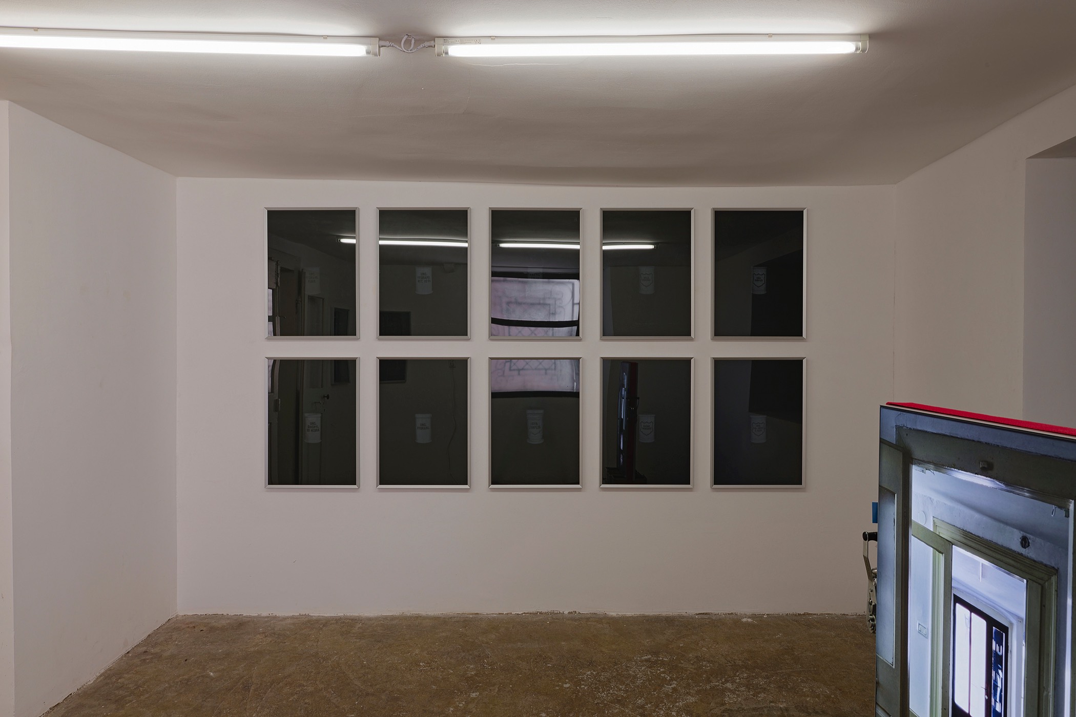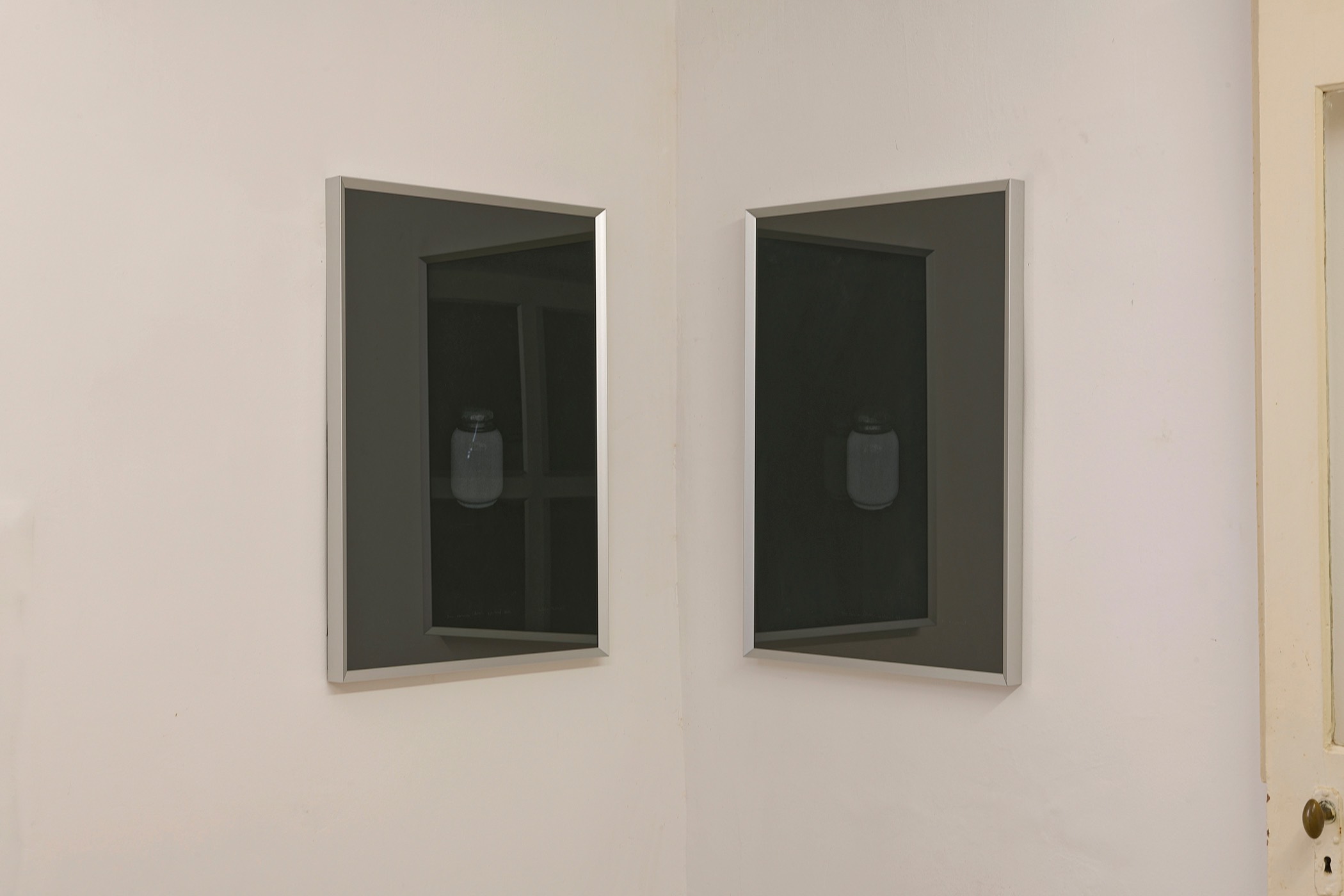 The second series is based on recent photographs of the gallery interior, capturing accumulated traces of time and use. These images are presented in freestanding, double-sided lightboxes, placed on a base constructed from drawers borrowed from the original white pharmacy cabinets still preserved within the space. The drawers, repurposed as sculptural foundations, anchor the photographic installation in the material memory of the site.