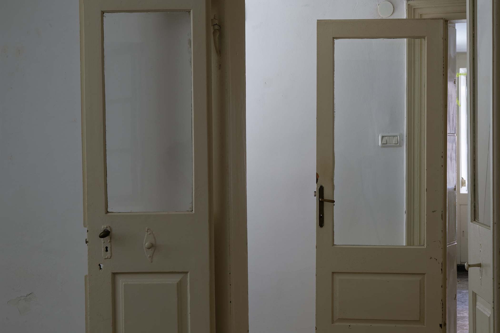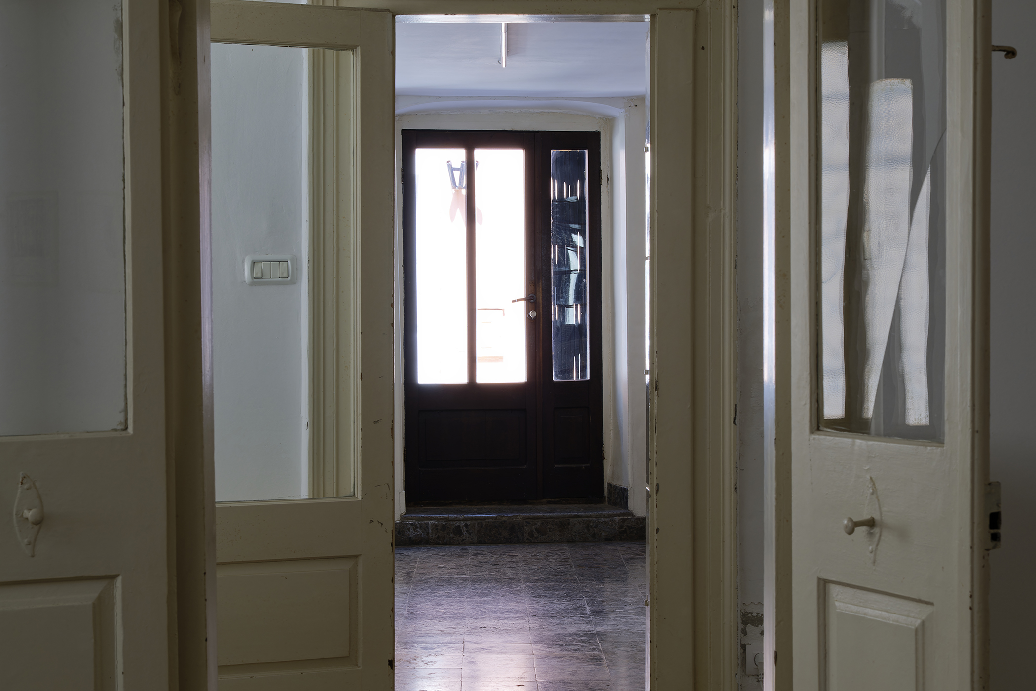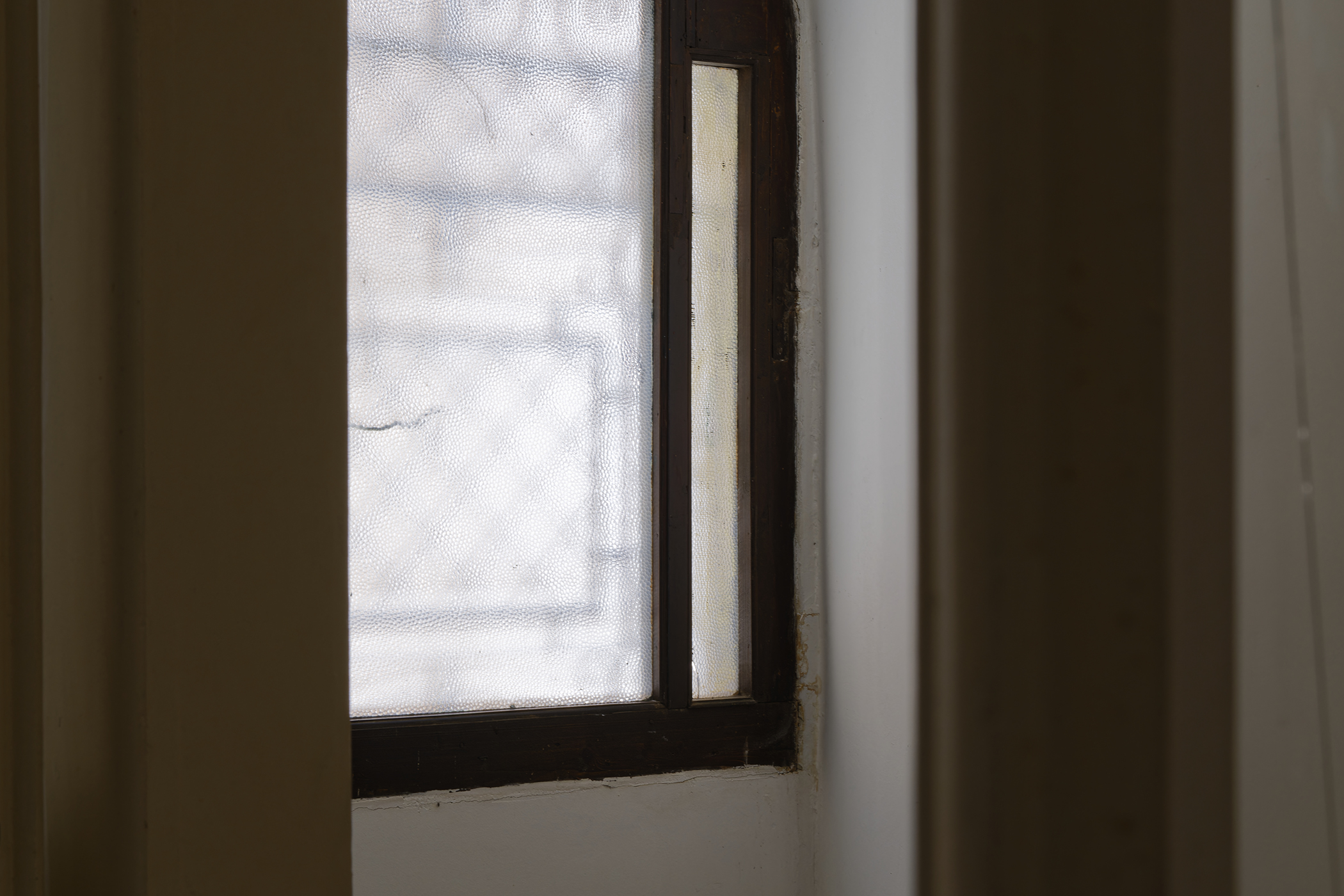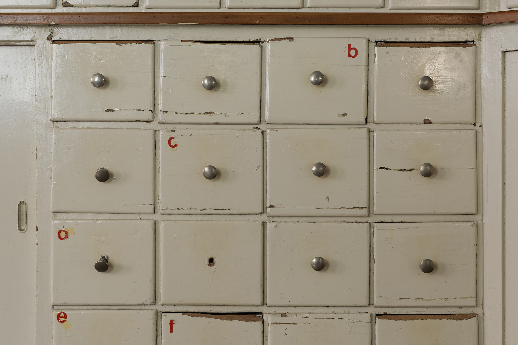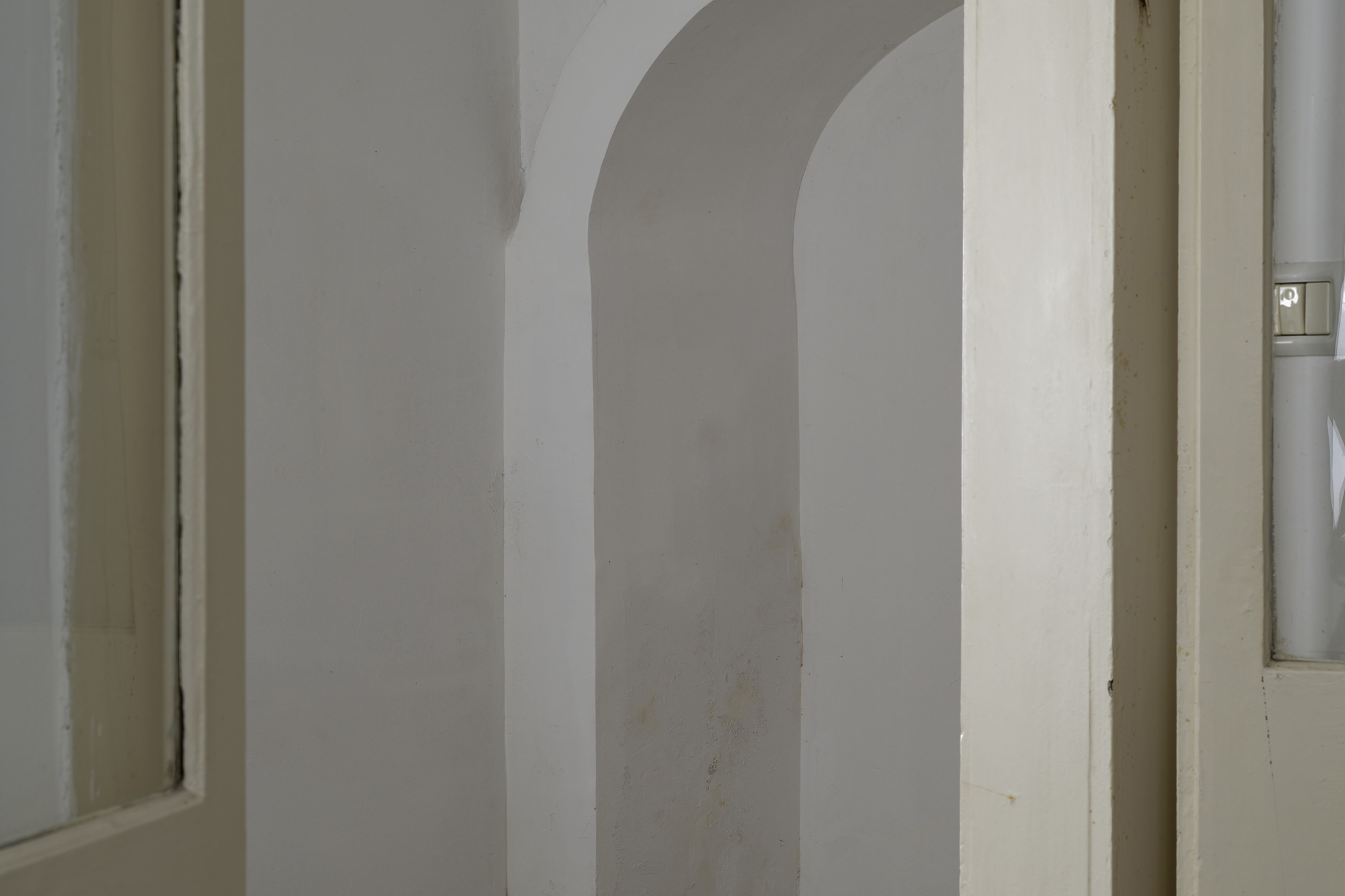 The second series is based on recent photographs of the gallery interior, capturing accumulated traces of time and use. These images are presented in freestanding, double-sided lightboxes, placed on a base constructed from drawers borrowed from the original white pharmacy cabinets still preserved within the space. The drawers, repurposed as sculptural foundations, anchor the photographic installation in the material memory of the site.
