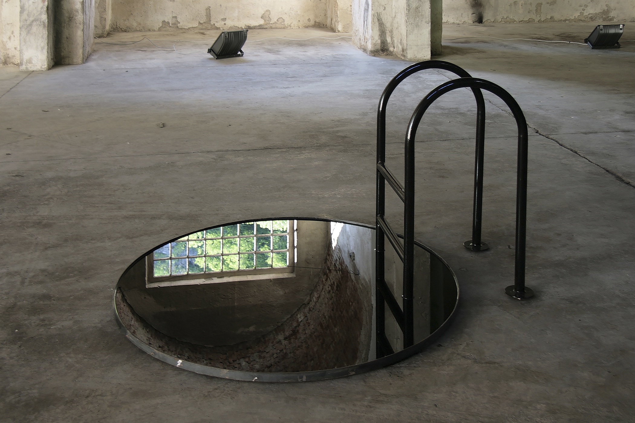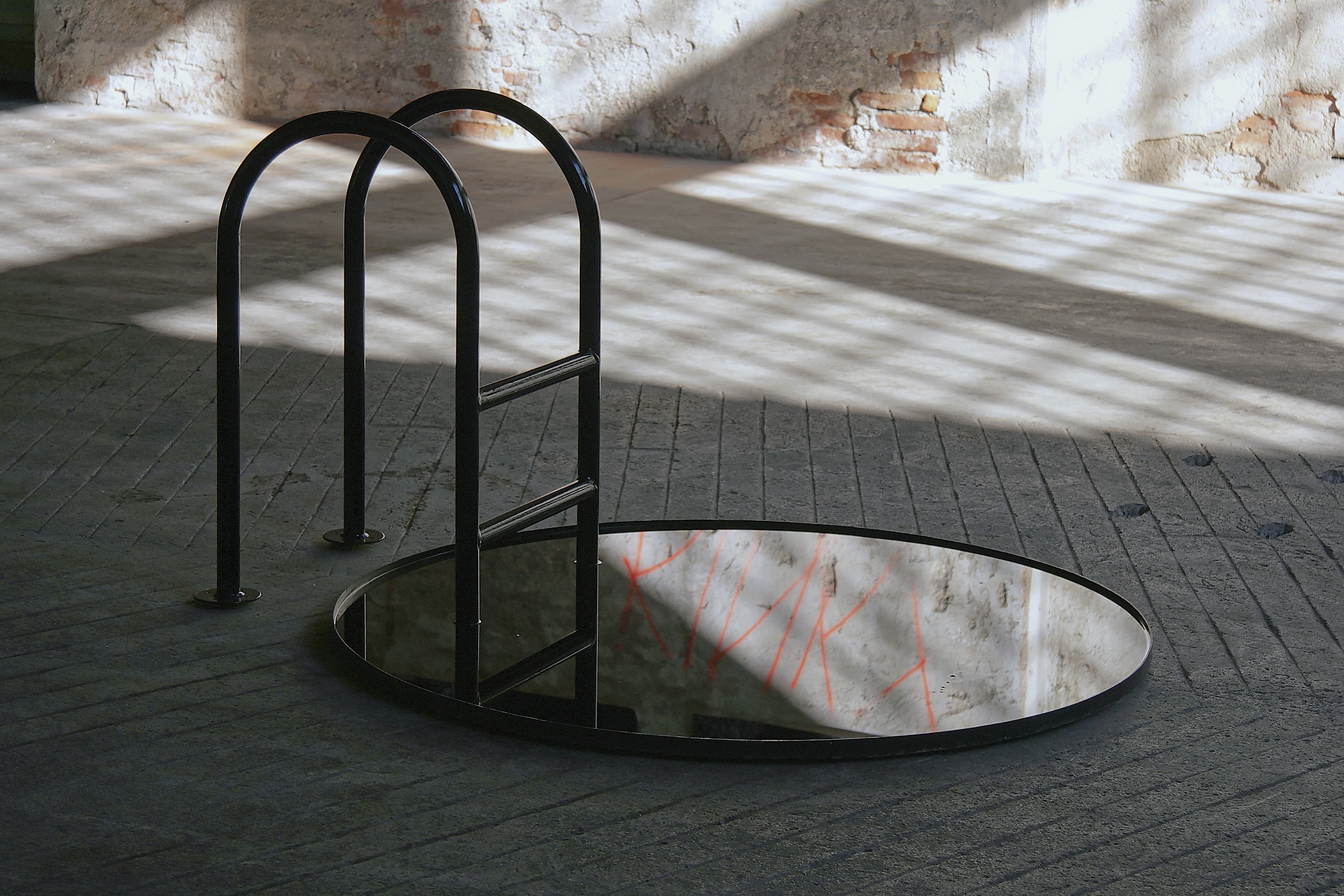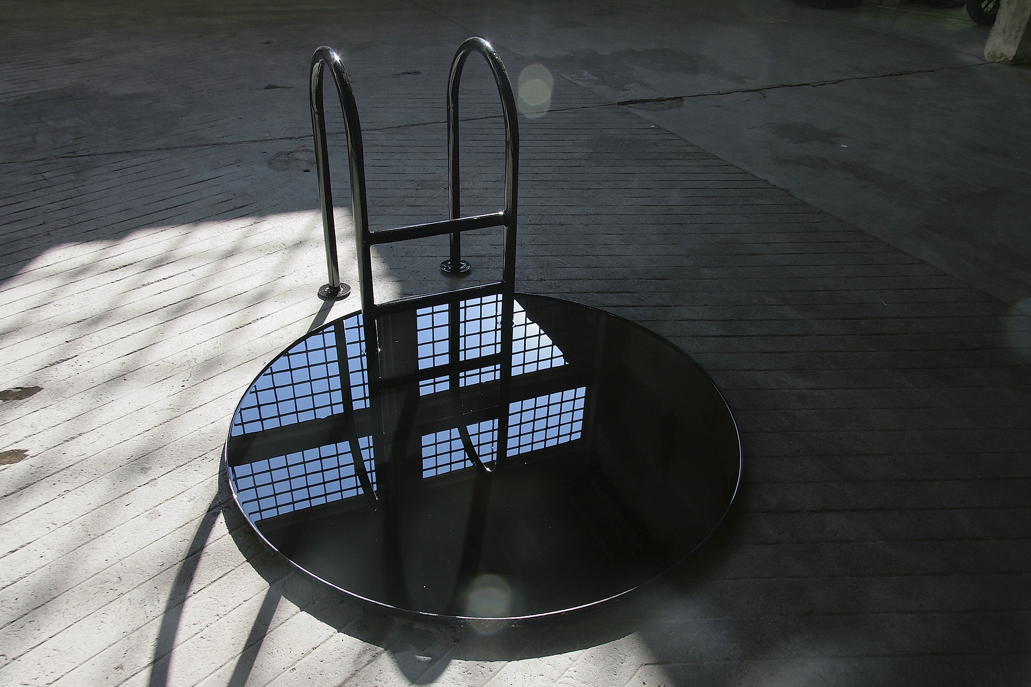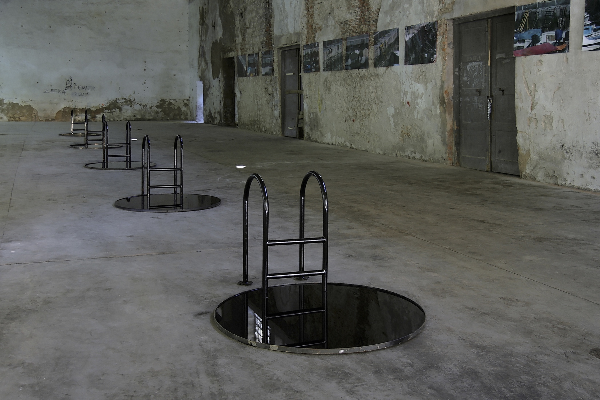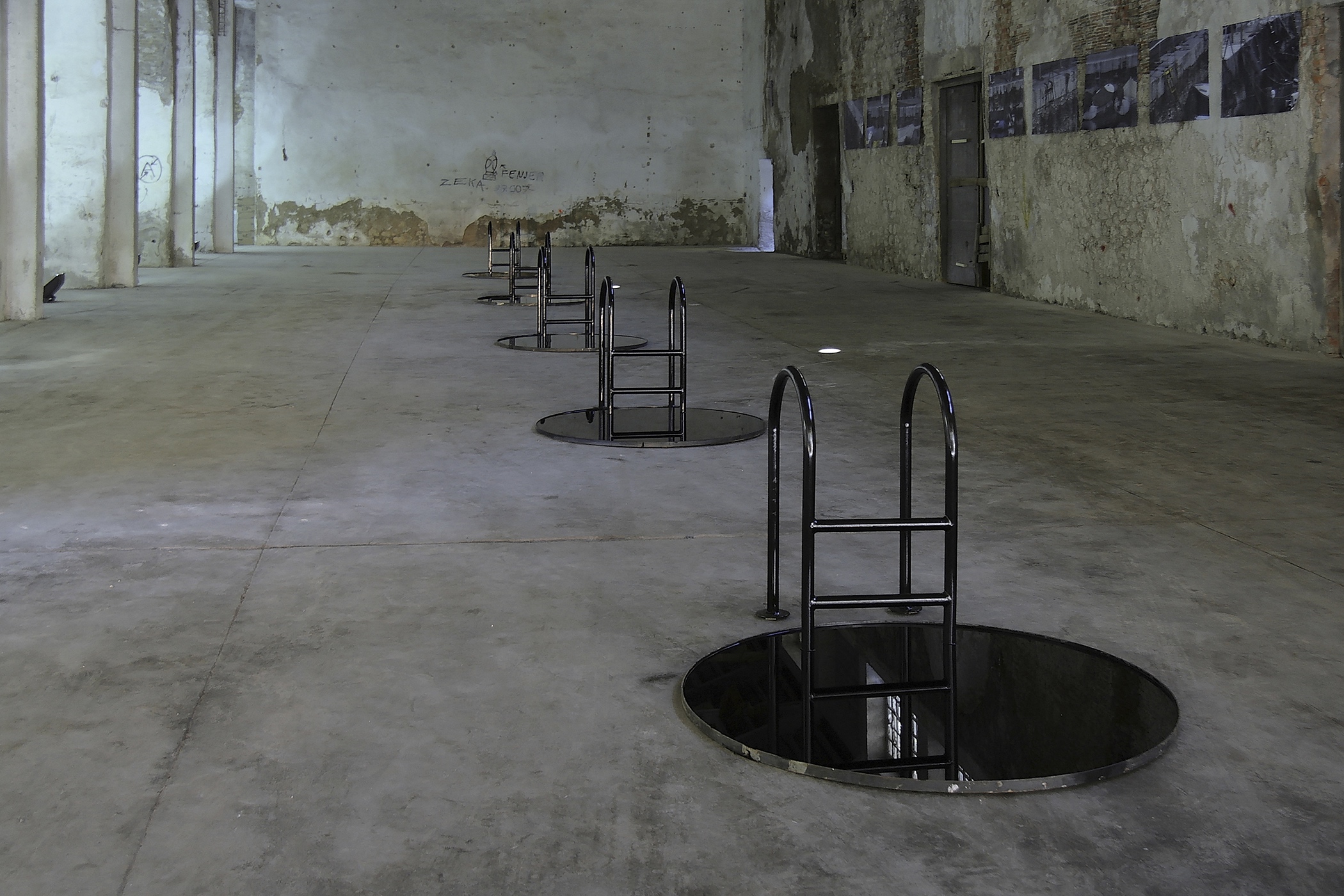 Thought-out inversion of expectations – witty game of paradox is intensified by the multiplied, ironically dysfunctional objects. They consist of metal ladders and a round pool filled with used motor oil. The specific quality of the used liquid – petroleum product, opens up multiple levels of interpretation, as a content-related feature of the city, locally noted in Mrtvi Kanal, as the global vision of a polluted environment and consumer society whose future uncertainly floats dependant on big businesses and available energy resources.