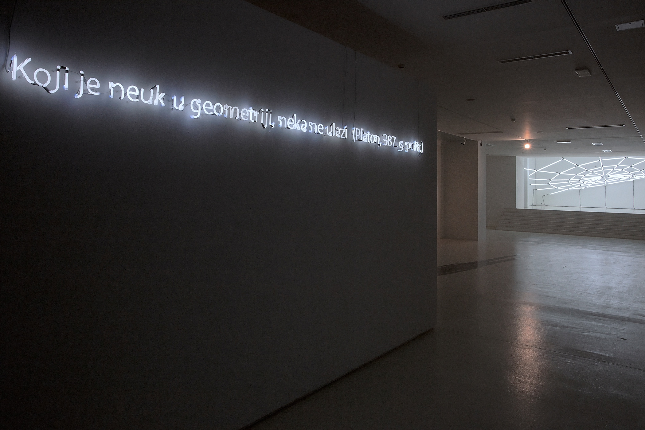 Let no one ignorant of geometry enter (Plato, 387 B.C.). It is believed that this inscription had been placed at the entrance of Plato’s Academy. In this case, we can interpret geometry in two ways: literally – as a branch of mathematics – and in the context of the inscription as such, as a symbol of abstract thinking aiming at complete understanding, i.e. knowledge. Thereby Popović has provoked a play of interpretation, linking the meaning of the text directly with the work of Vjenceslav Richter, but dislocating the inscription into an exhibition venue and thus multiplying its semantic levels. This procedure is close to the