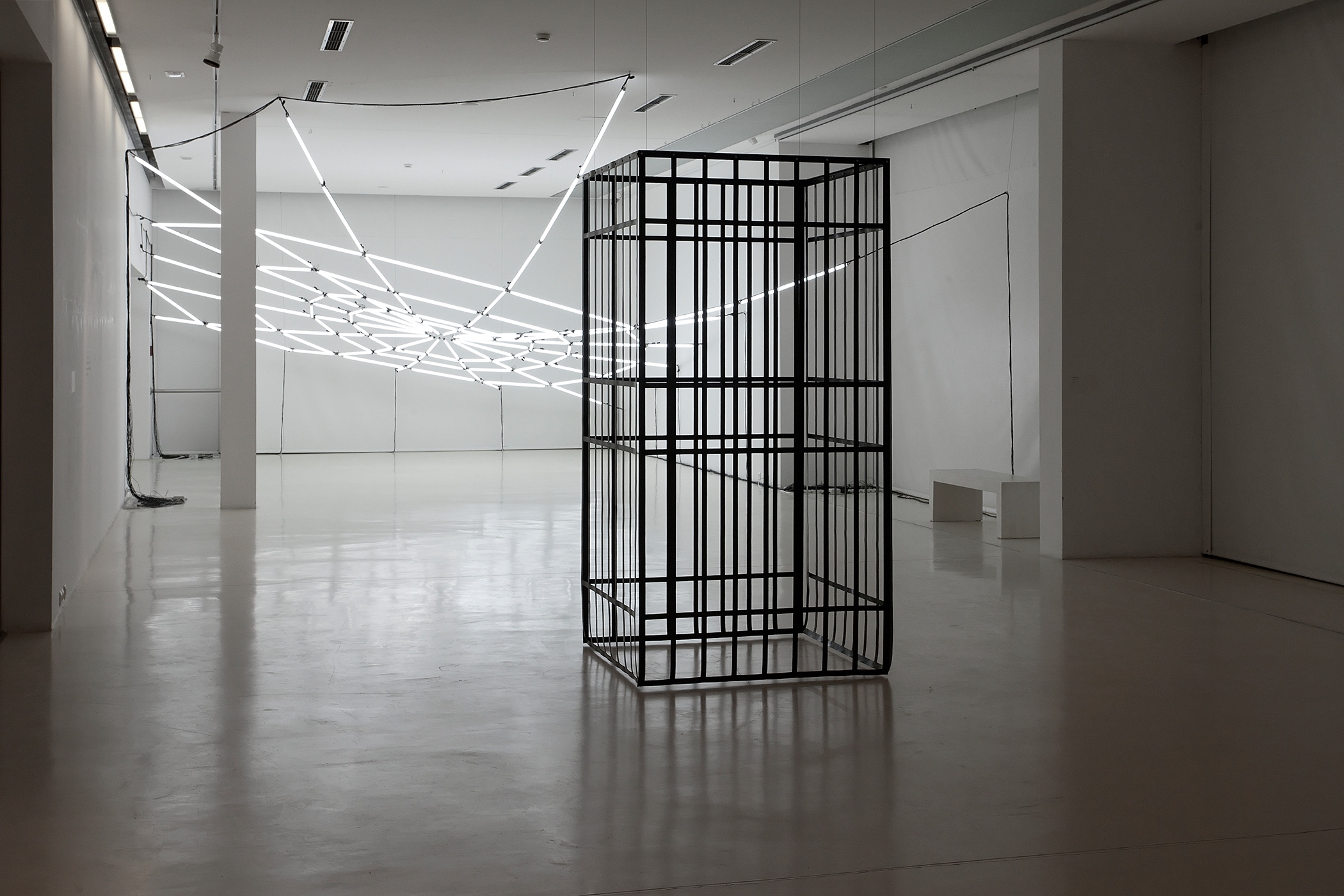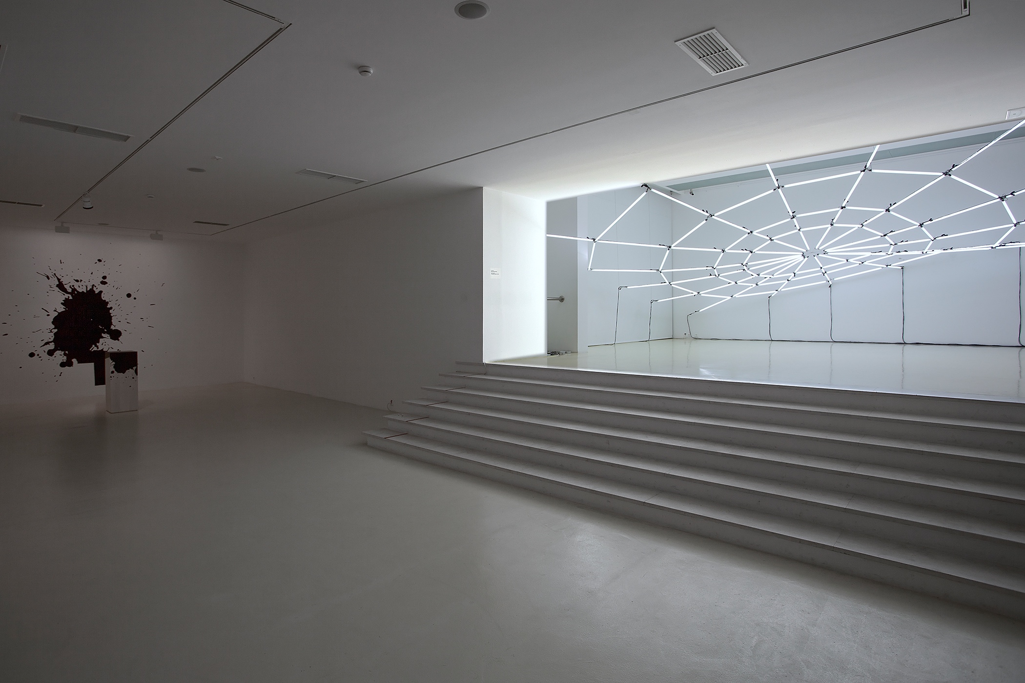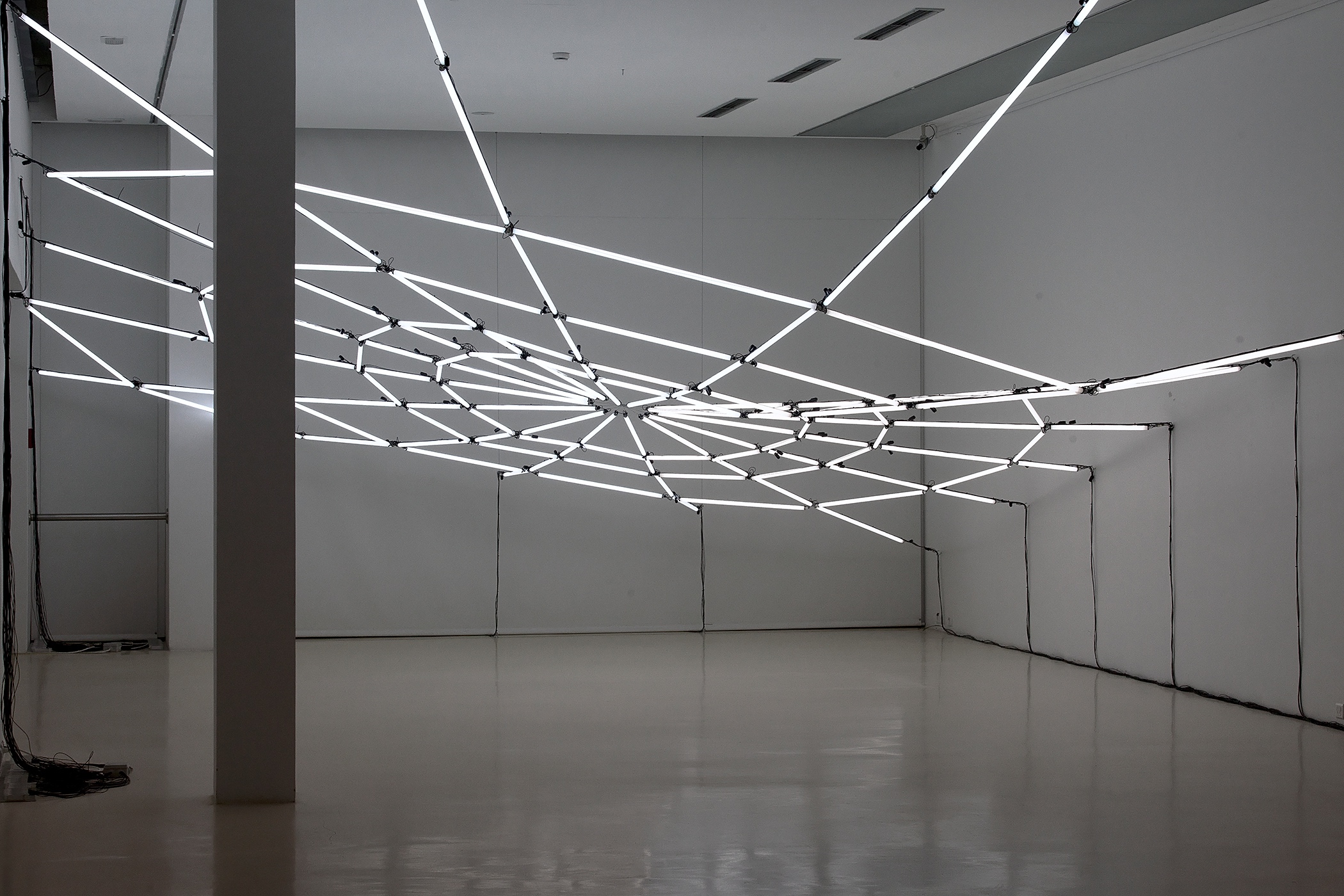 spun out of more than a hundred neon tubes, covering more than 40 m2 of space. By juxtaposing very fine linear elements and cold neon light, the artist has produced an artwork that with its precision and power, again testifies to the clarity of form and concept.