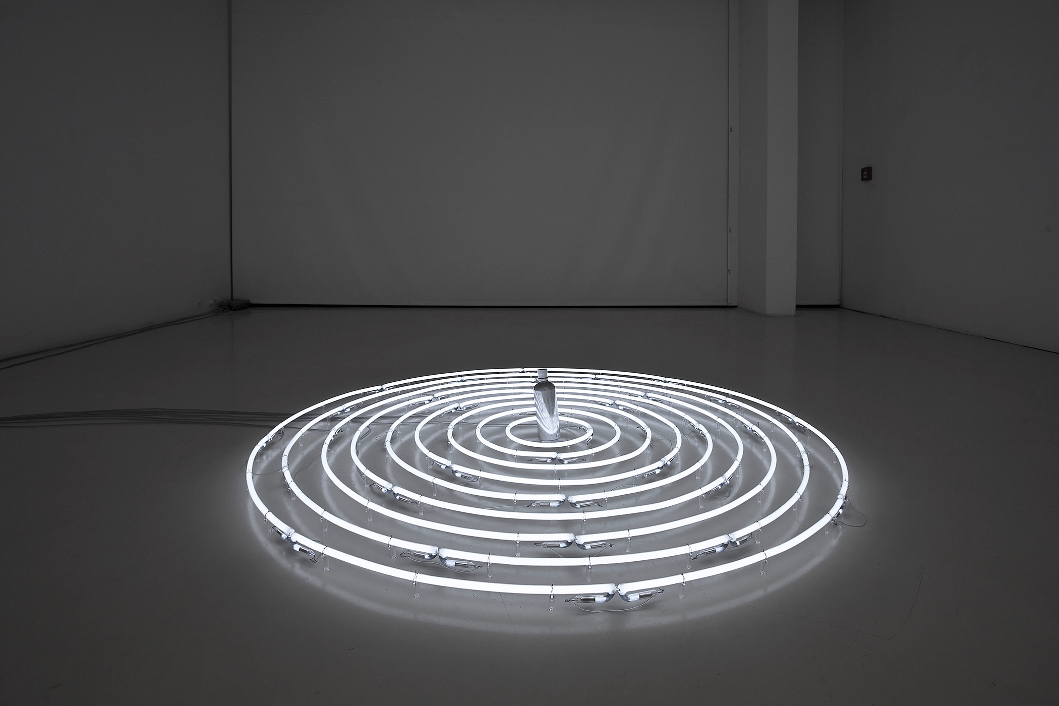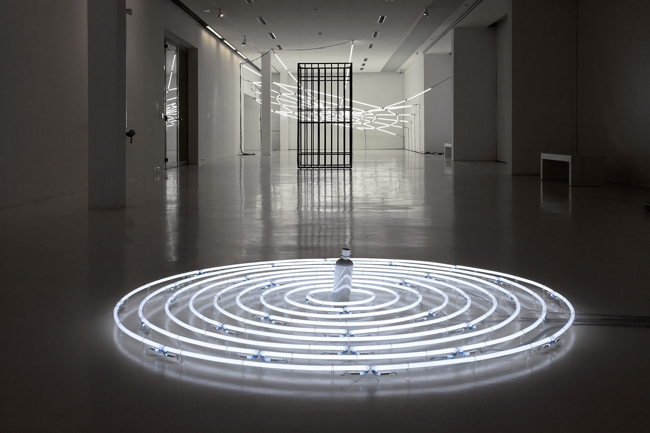The two remaining artworks, here exhibited for the first time – the installation with an aluminum bottle surrounded by concentric circles of light (