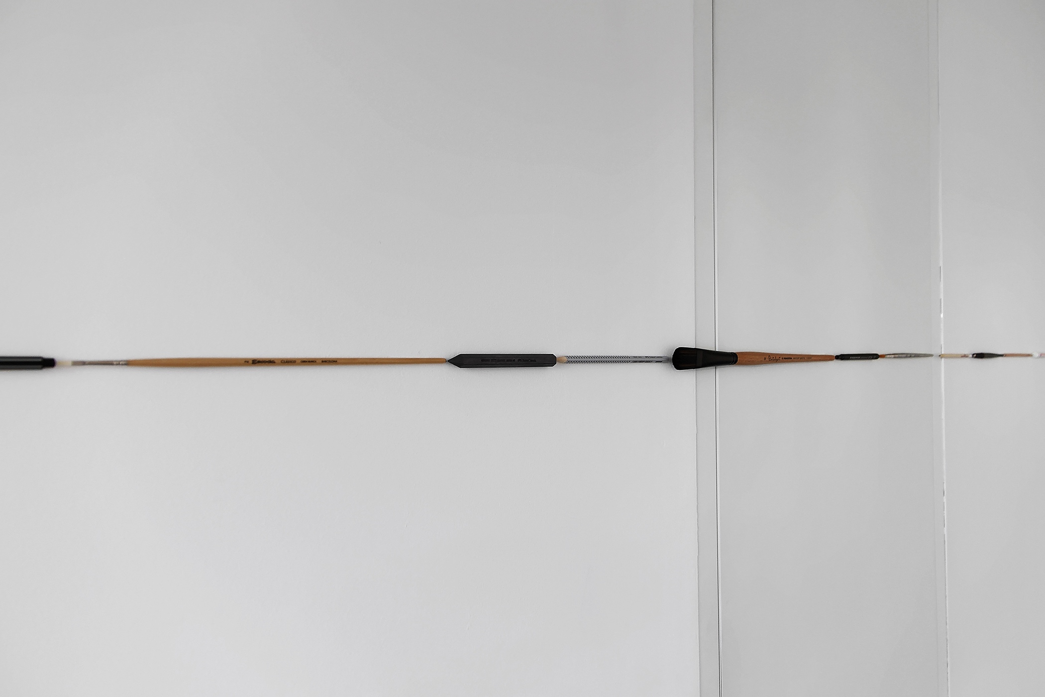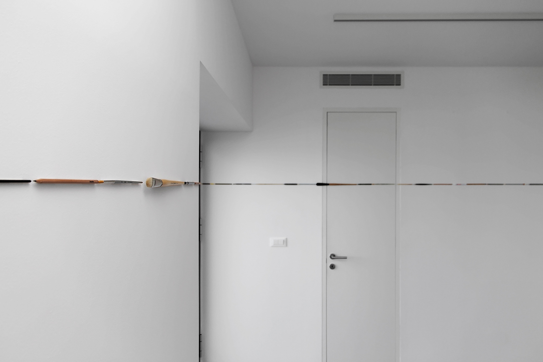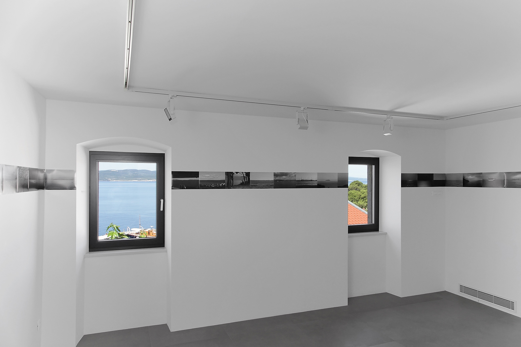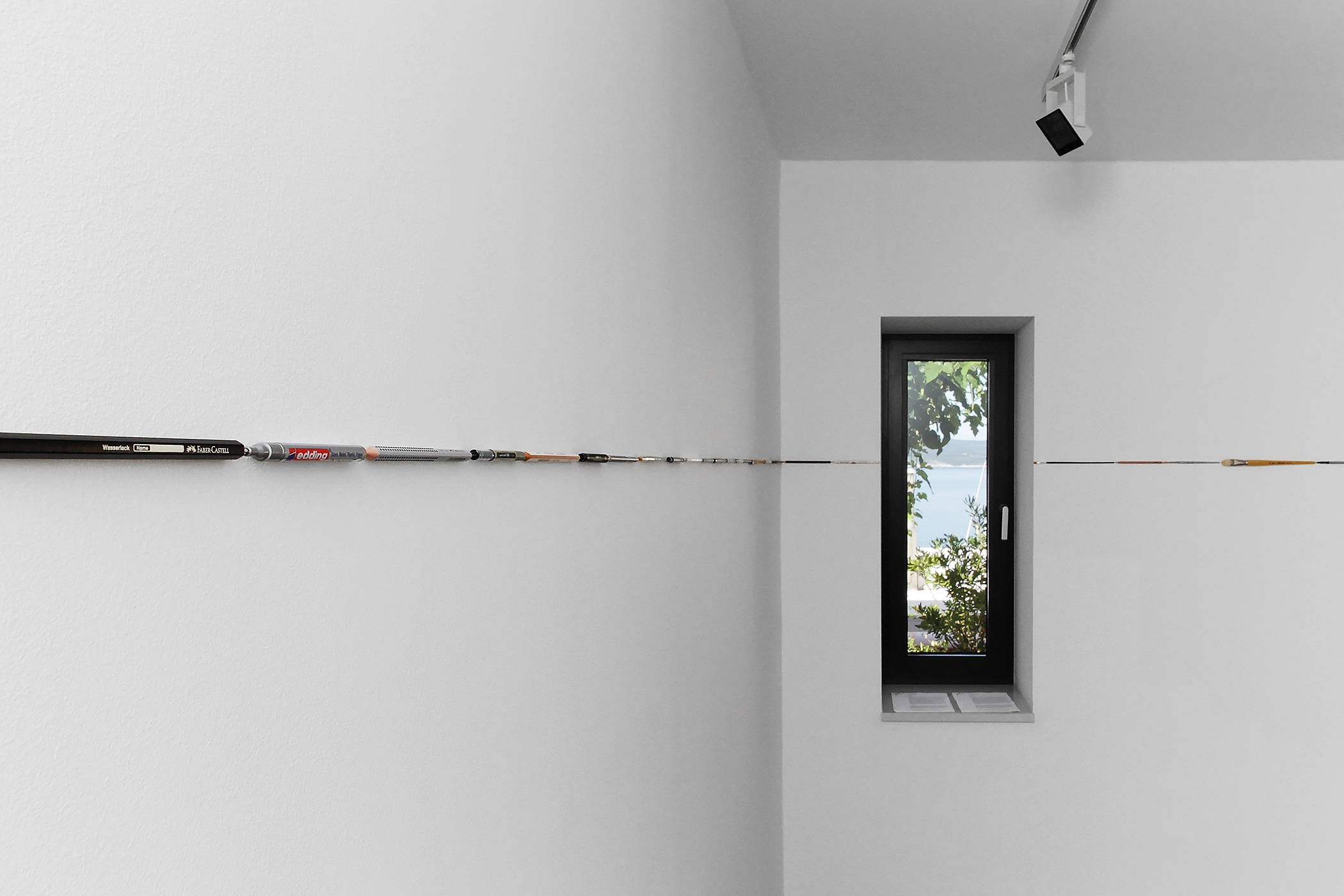 As an initial reference to this specific space, Popović chooses the original character of a typical Dalmatian residential house – the gallery’s windows overlook the sea. The landscape becomes an extremely important and dynamic element in the definition of the interior as well. The most distinguishable element that becomes the artist’s focal point is the horizon. He appropriates it and continues it in the interior by creating a new collage horizon made of photographs. He doesn’t use the photographs of that particular view but assembles various photographs of the sea created through a longer period of time in such a way that he connects them all exactly on the line of the horizon and creates one continuous landscape. What becomes obvious is that the horizon is nothing but the line. And lines are not created only in nature. Man creates them through various means: using pencil, ballpoint pen, brush... The artist can create them using the very objects used for drawing. On the ground floor of the gallery, Popović creates a new horizon using those exact objects. Such inversion becomes even more interesting when we remember that the line, regardless of how it was made, is the starting point of any creative process.
