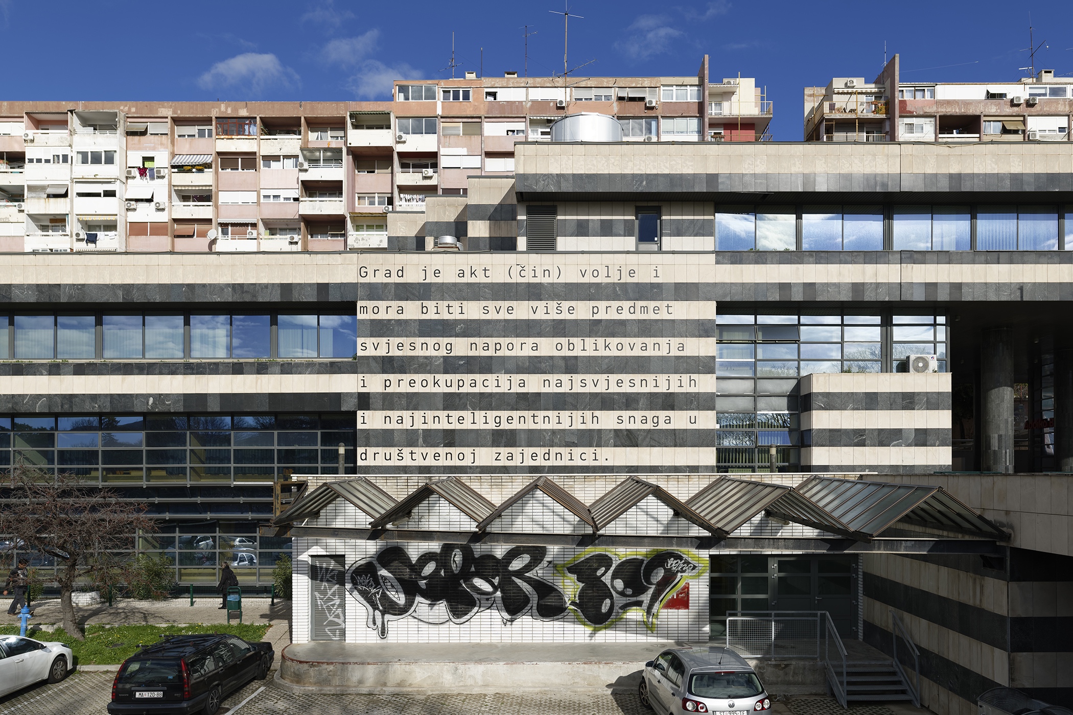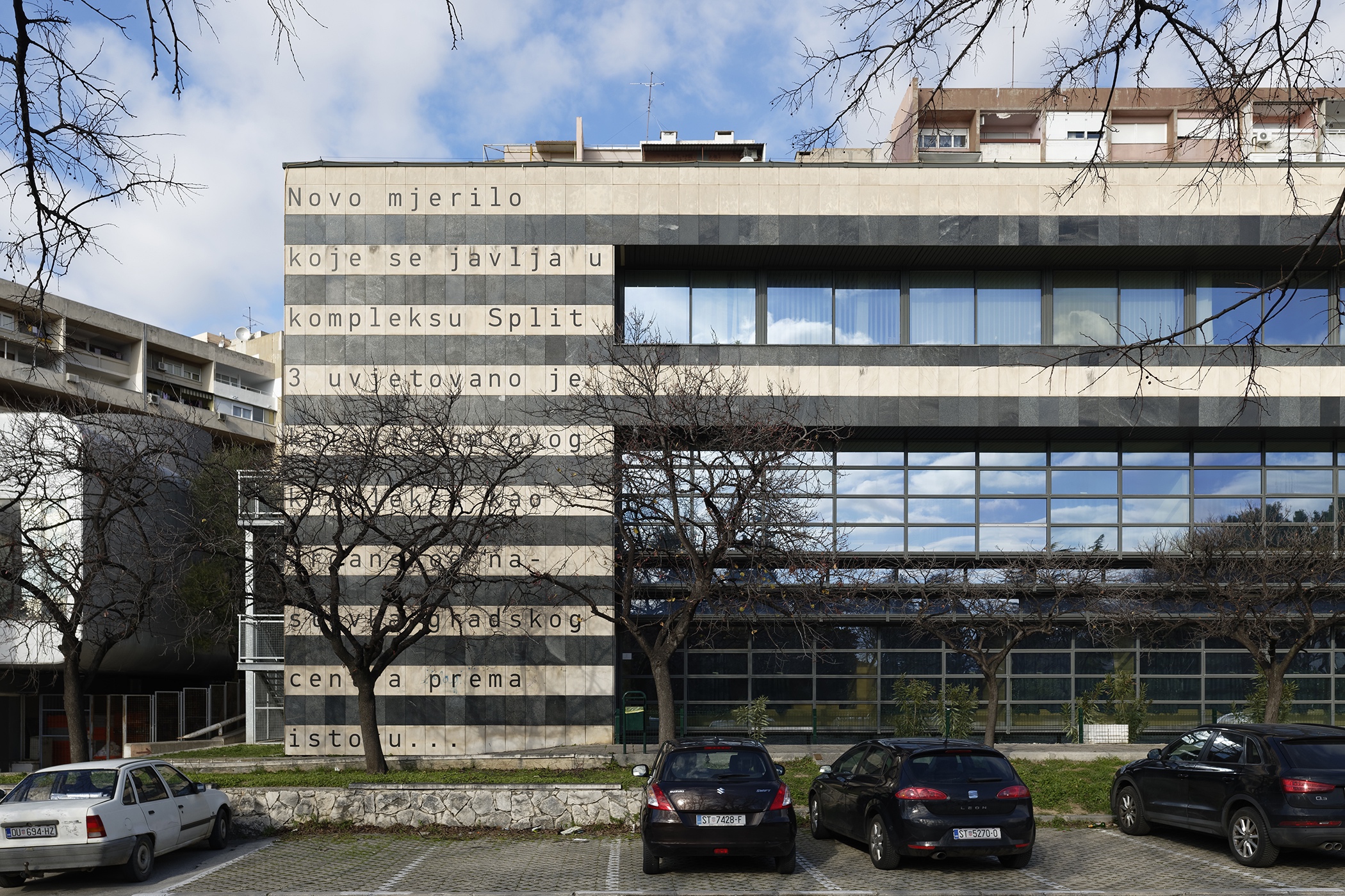 The cornerstone of Viktor’s reflections and reaction is the urban and architectural planning of Split’s third city raion (district) from the late 1960s. By writing textual fragments on the façade of the Faculty of Humanities and Social Sciences building in Split, which has been designed at the intersection of two epochs and different socio-political paradigms by architect Dražen Colnago, as the Brodomerkur business and commercial building, the artist problematizes the urban and architectural heritage from the late 1960s and through the 1970s. Specifically, Popović selects a few sentences from the archival document for the Split 3 project – Basic urban design – Textual part: preliminary technical description and report from November 1969, and applies them to the recognizable façade, turning it into an active staff notation, thus questioning the appearance and nature of the present-day city.