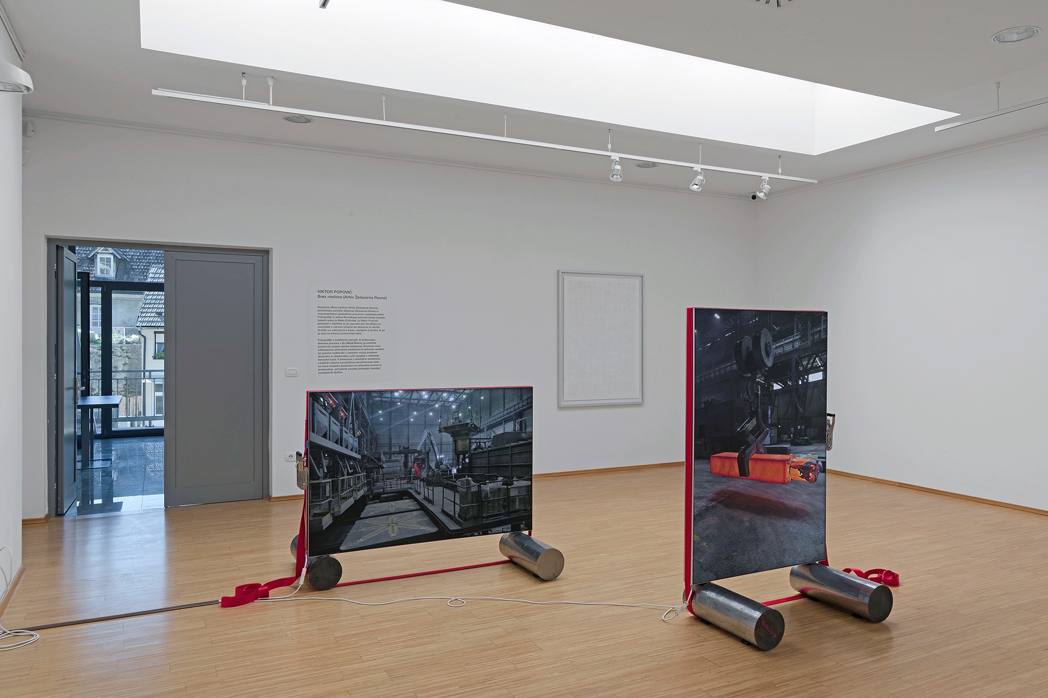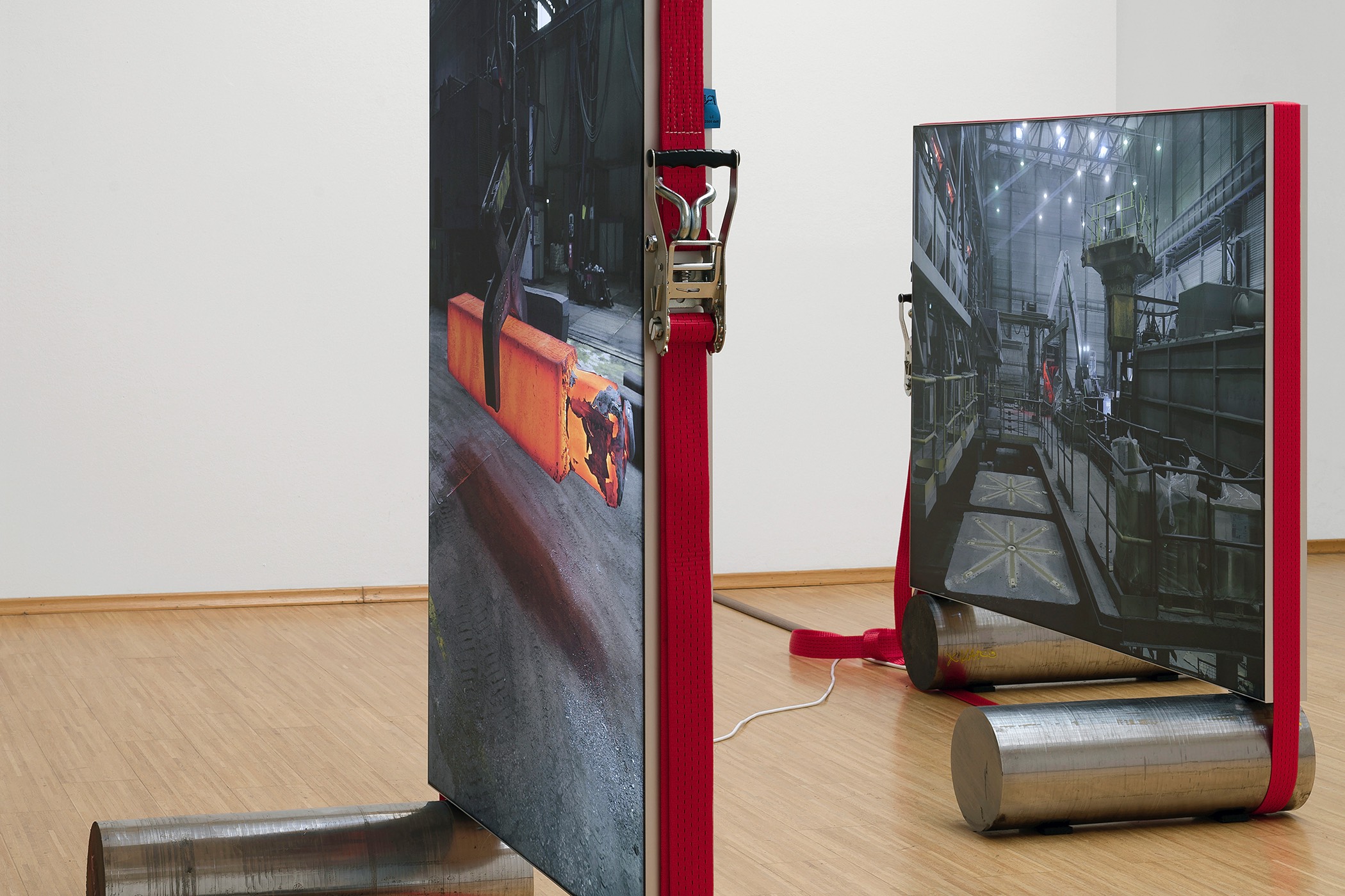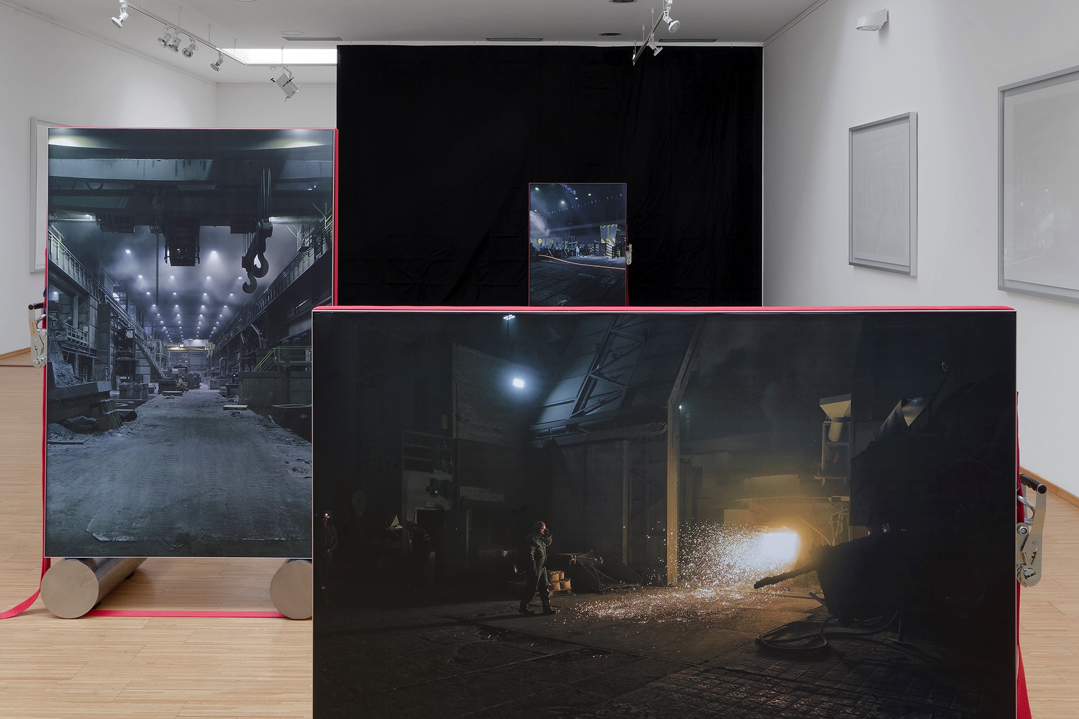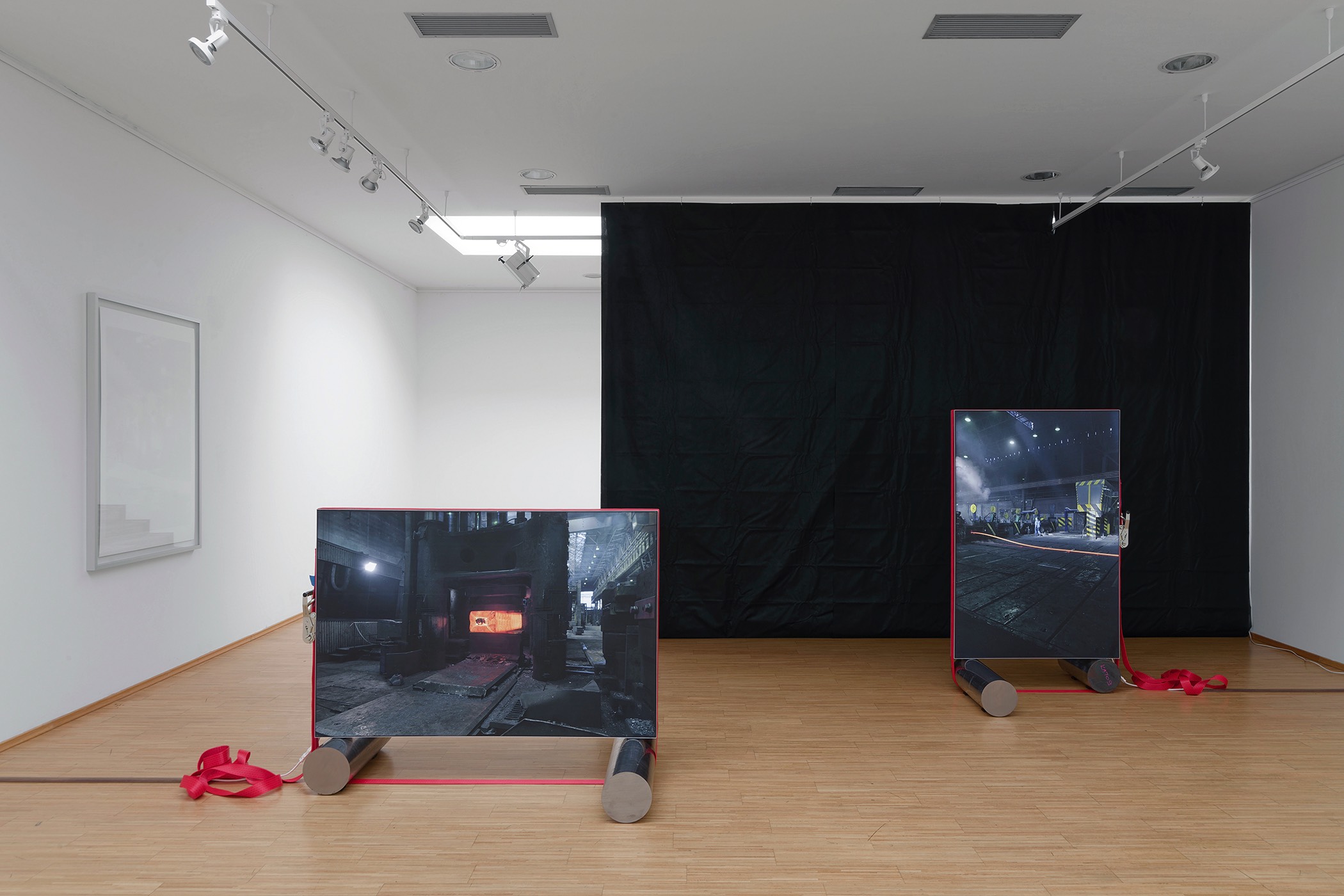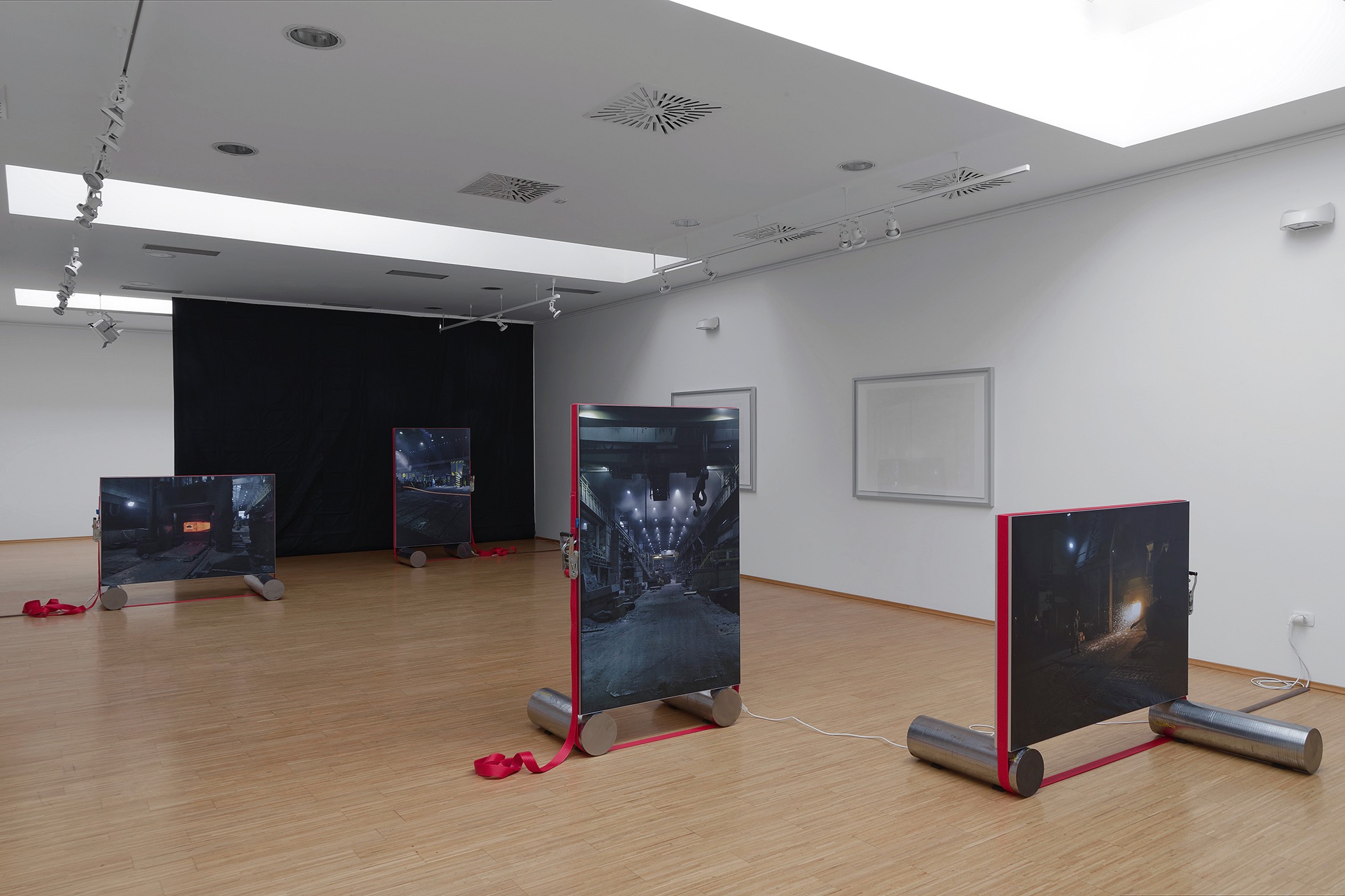 The photographs displayed in light boxes show some of the production locations at SIJ Metal Ravne, which were taken by the artist during a visit to the factory. The contrast between the printed archival images and their bright, clear modern counterparts creates an implicit tension that adds drama to the whole. In comparison to the older images, which reflect the socialist glorification of labor, the new ones are limited to internal perspectives and breathtaking interiors of industrial spaces. There are no workers, only a shadow that occasionally appears at the edge, and the steps of modern-day Sisyphuses. Their indifference to the impressive process of continuous transformation of steel into familiar and technically sophisticated forms transcends the significance of the results of their work in the Carinthian environment. The local landscape has suffered for decades as the working process irreversibly marked the people and architecture.