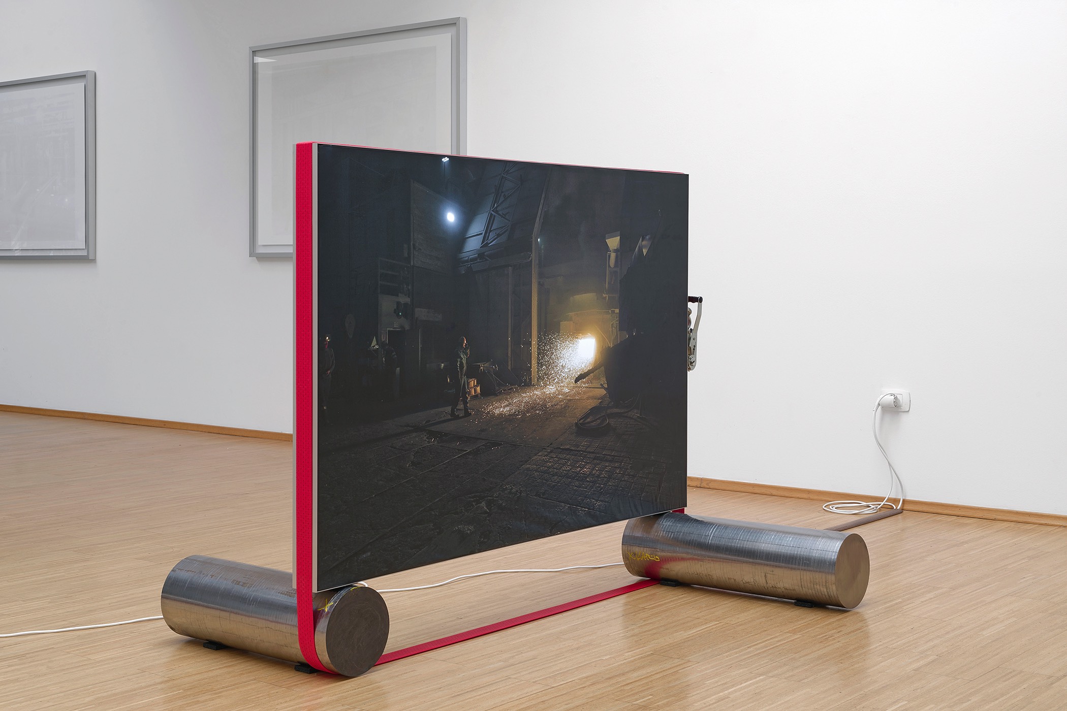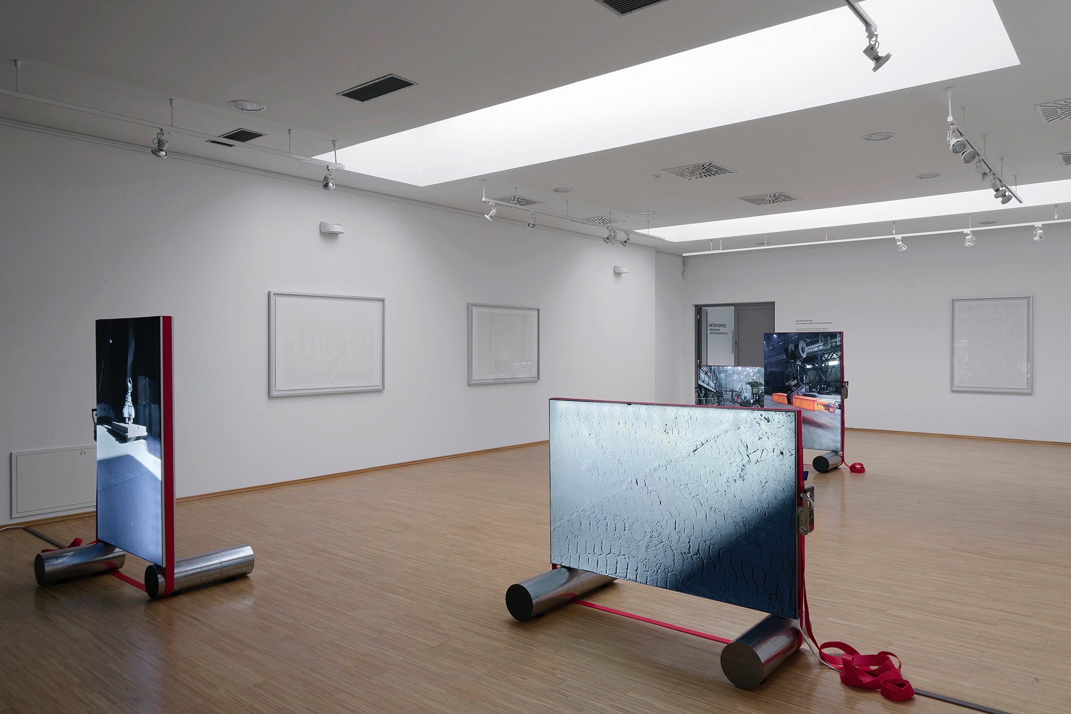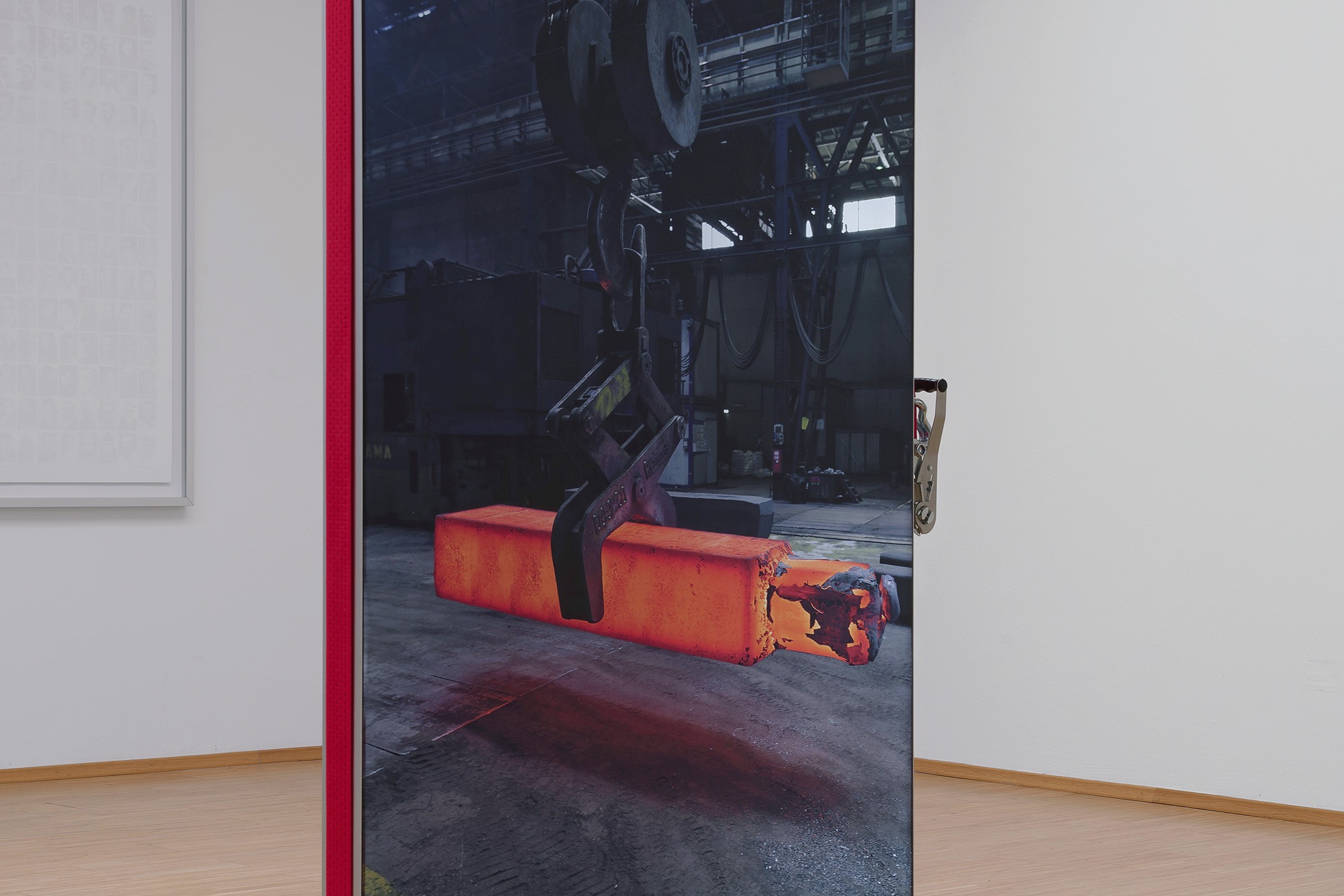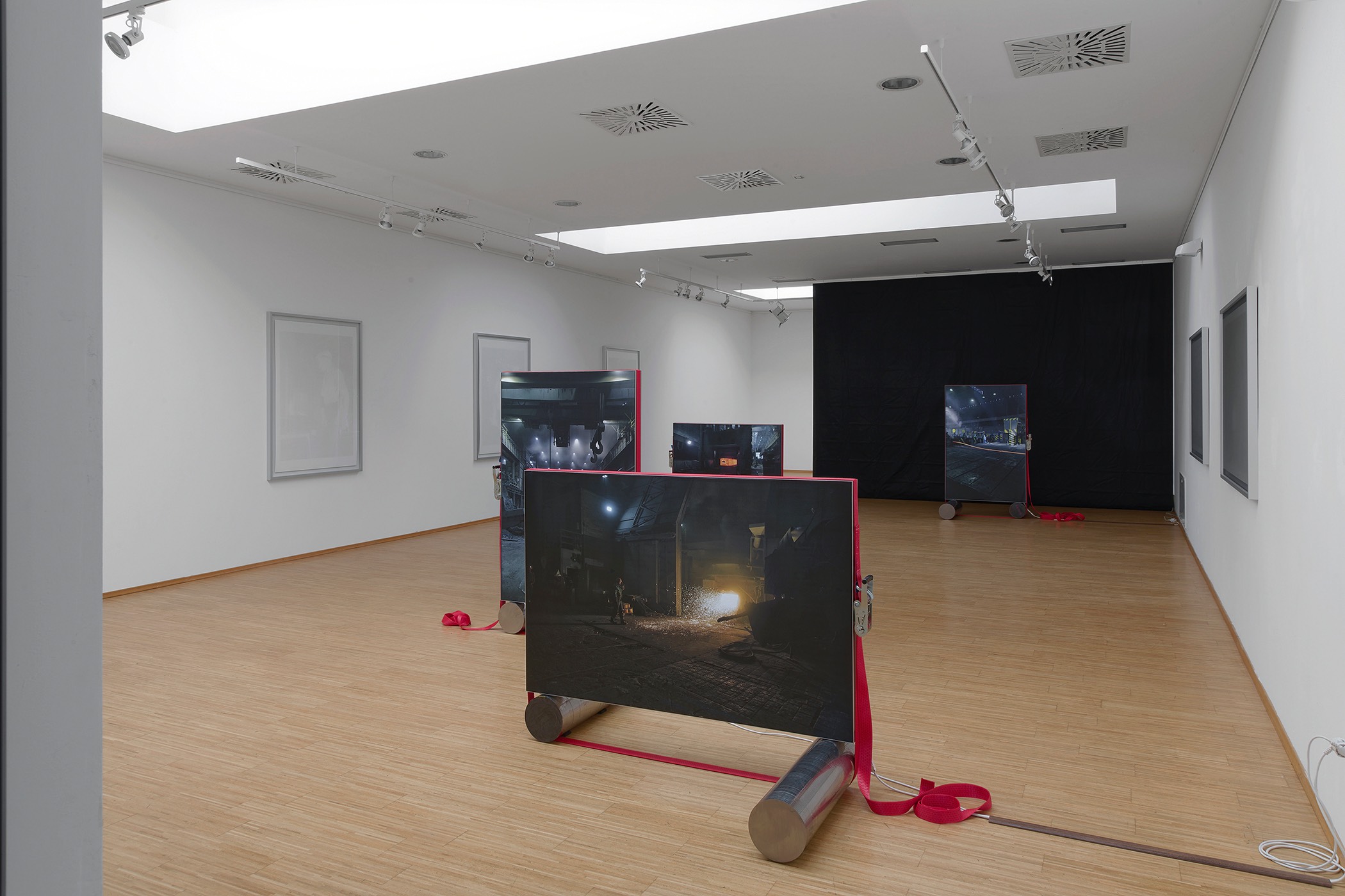 The photographs displayed in light boxes show some of the production locations at SIJ Metal Ravne, which were taken by the artist during a visit to the factory. The contrast between the printed archival images and their bright, clear modern counterparts creates an implicit tension that adds drama to the whole. In comparison to the older images, which reflect the socialist glorification of labor, the new ones are limited to internal perspectives and breathtaking interiors of industrial spaces. There are no workers, only a shadow that occasionally appears at the edge, and the steps of modern-day Sisyphuses. Their indifference to the impressive process of continuous transformation of steel into familiar and technically sophisticated forms transcends the significance of the results of their work in the Carinthian environment. The local landscape has suffered for decades as the working process irreversibly marked the people and architecture.