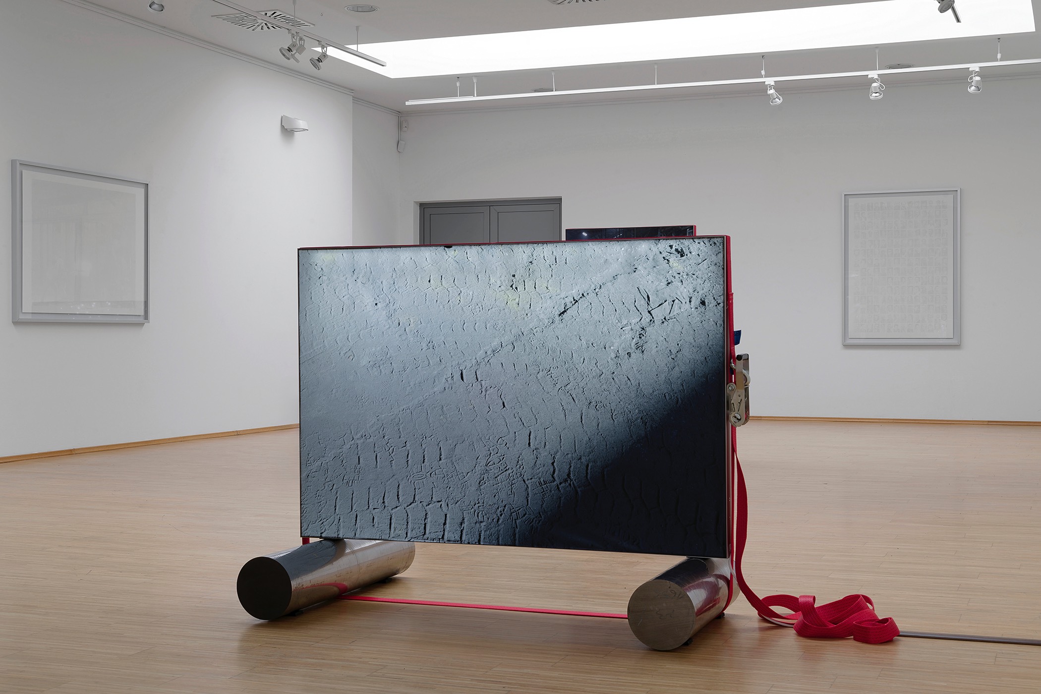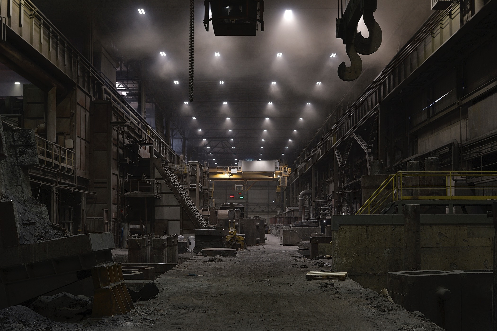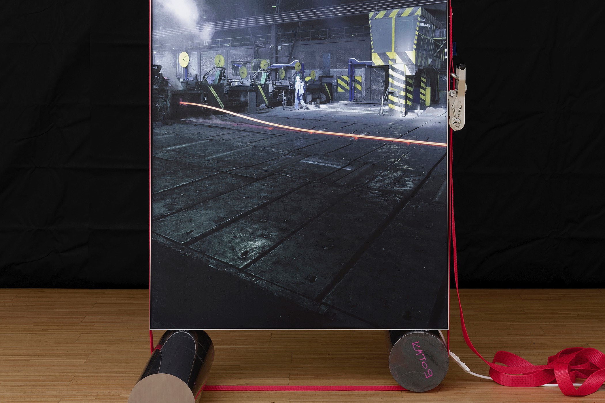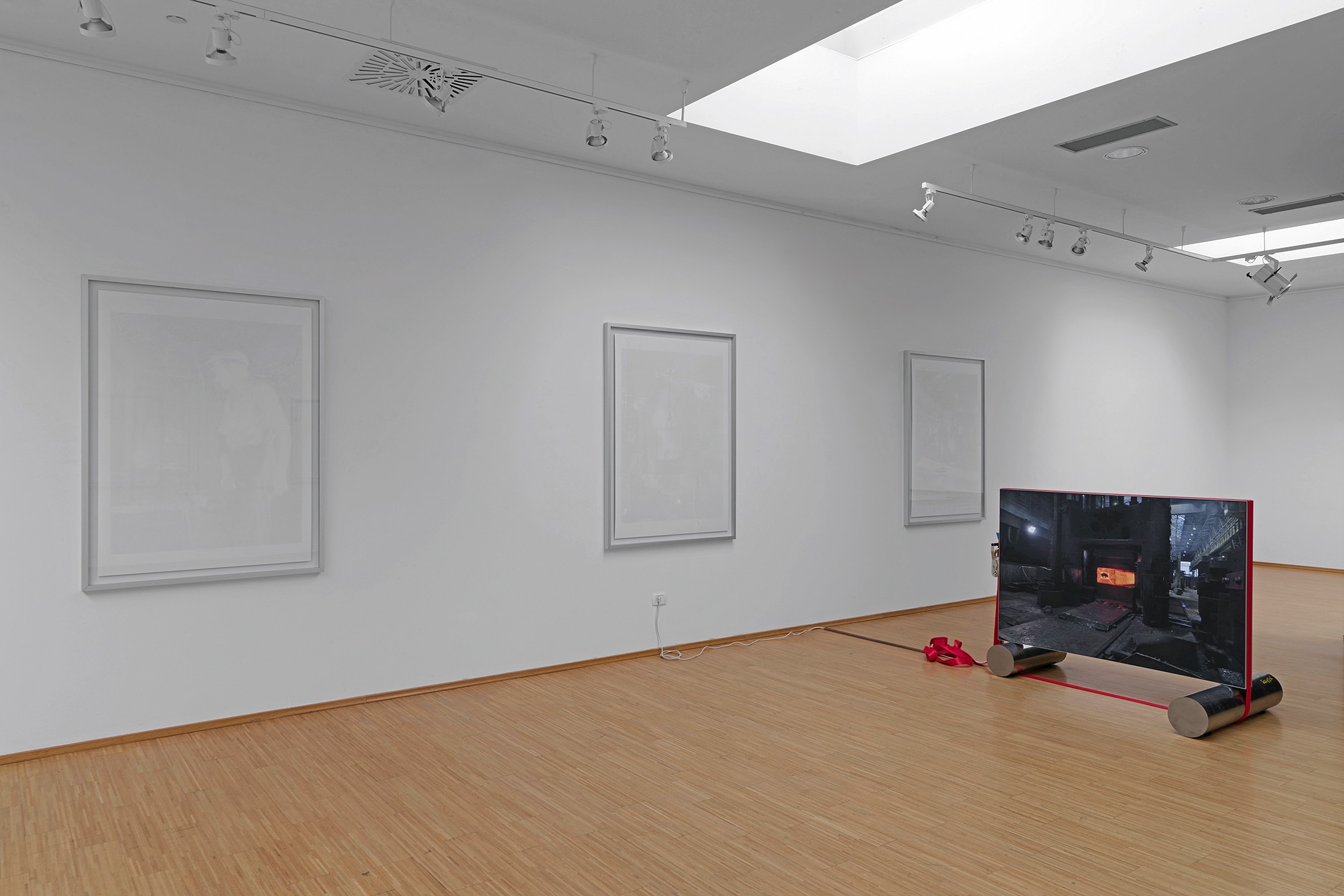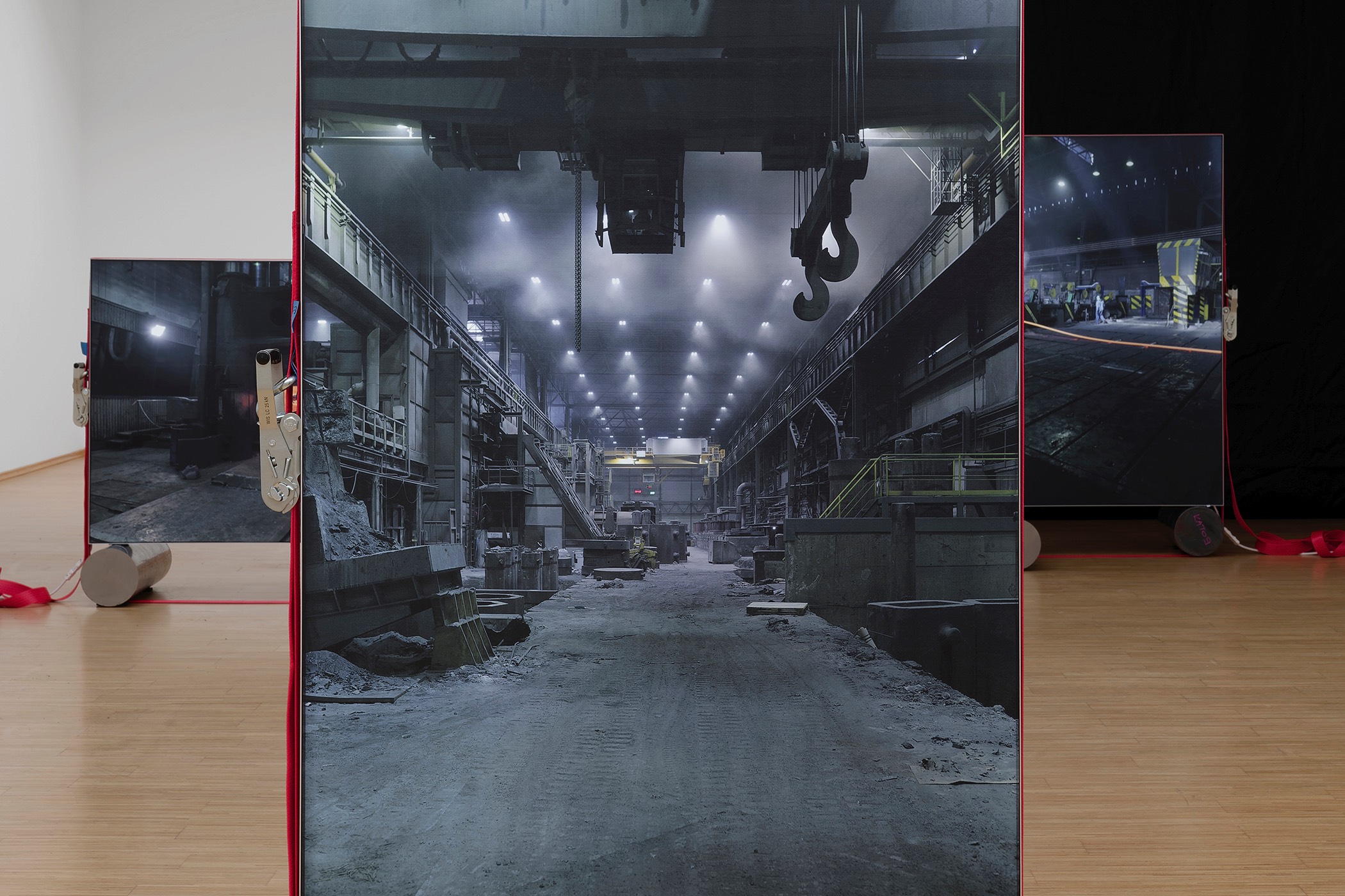 The photographs displayed in light boxes show some of the production locations at SIJ Metal Ravne, which were taken by the artist during a visit to the factory. The contrast between the printed archival images and their bright, clear modern counterparts creates an implicit tension that adds drama to the whole. In comparison to the older images, which reflect the socialist glorification of labor, the new ones are limited to internal perspectives and breathtaking interiors of industrial spaces. There are no workers, only a shadow that occasionally appears at the edge, and the steps of modern-day Sisyphuses. Their indifference to the impressive process of continuous transformation of steel into familiar and technically sophisticated forms transcends the significance of the results of their work in the Carinthian environment. The local landscape has suffered for decades as the working process irreversibly marked the people and architecture.