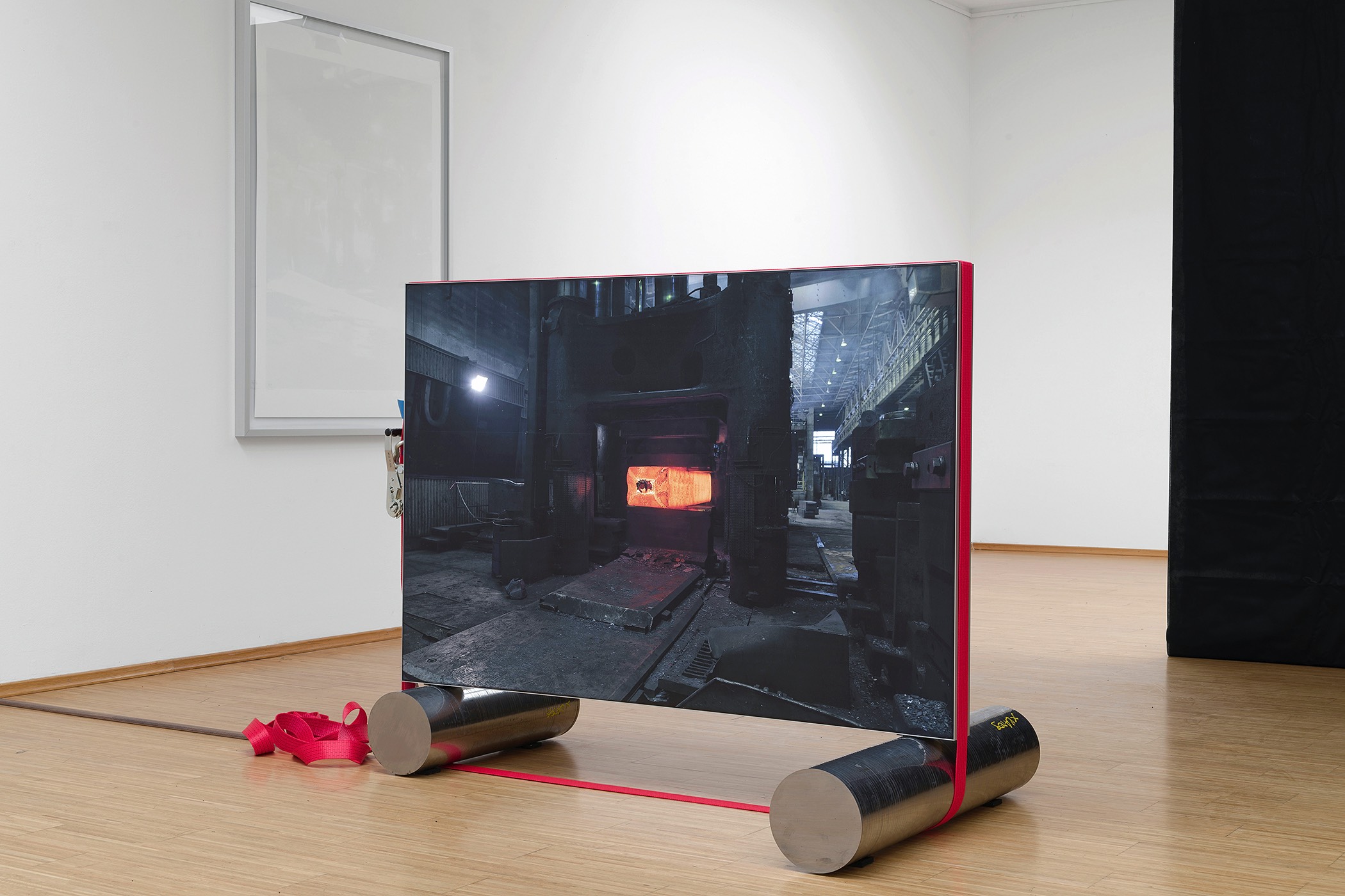 In “Untitled (Archive Ravne Steelworks)”, Viktor Popović intentionally uses the language of industrial design: the frames of the prints and light boxes are metal, the boxes are attached to the forgings with ratchet straps, and seemingly forgotten electrical cables are lying on the floor. We encounter light boxes daily as carriers of advertising messages on billboards. Here, the aluminum-framed light boxes, manufactured with industrial precision, carry artistic photographs and are transformed into sculptures. The constant shifting of focus, the change of location – from the symbolic and artistic world, back to reality and vice versa – and the interplay of different fields such as art, design and industry, gives the installation a fresh and dynamic feel. All these modes of presentation are intertwined and enable the viewer to understand the exhibition on different levels.