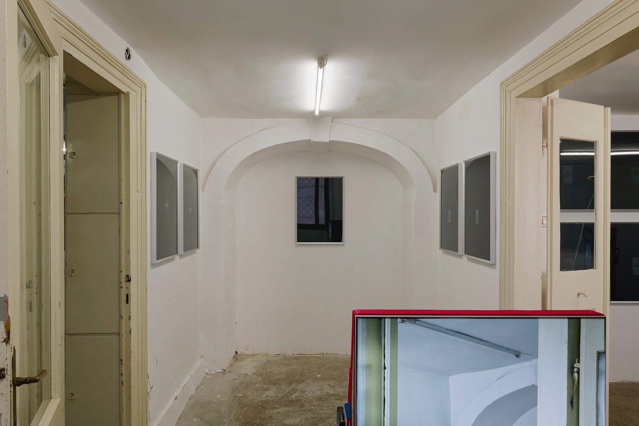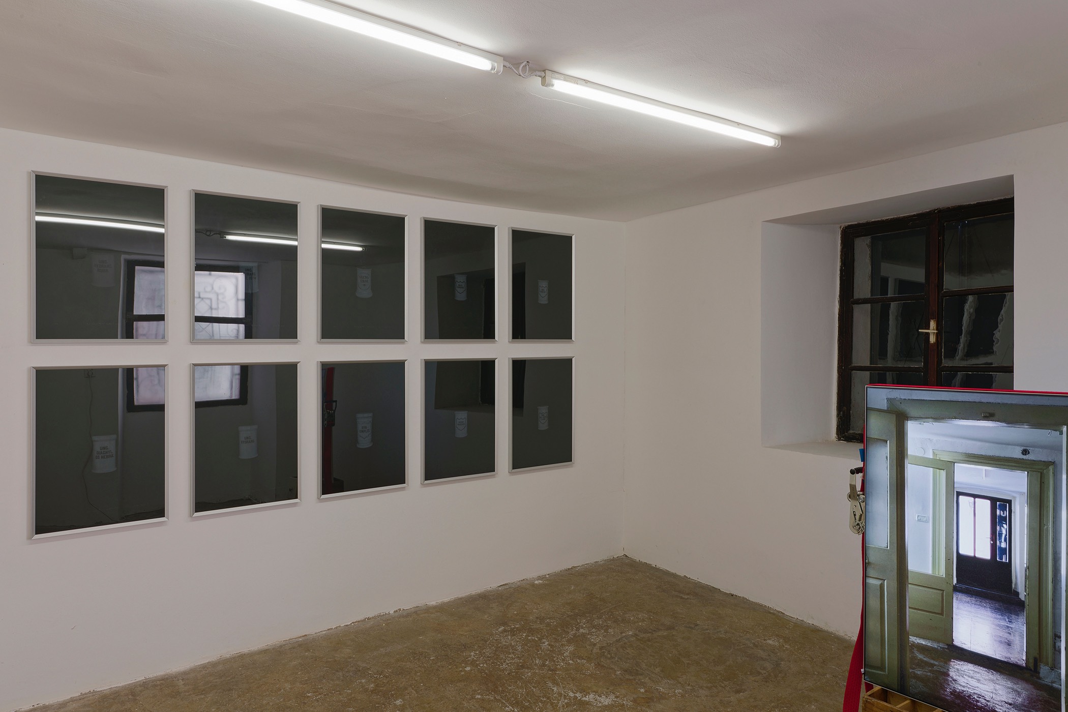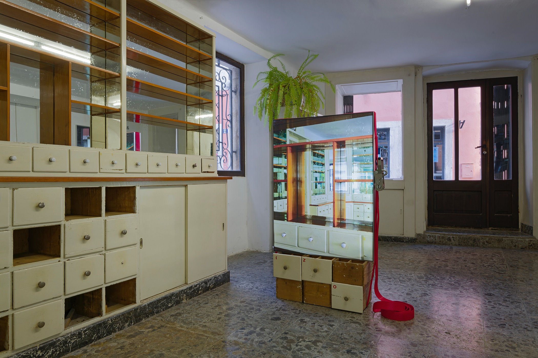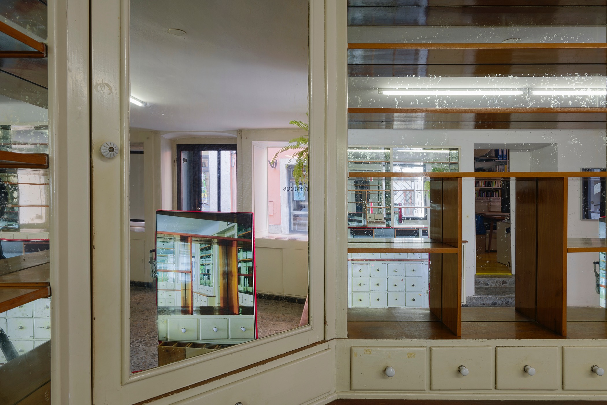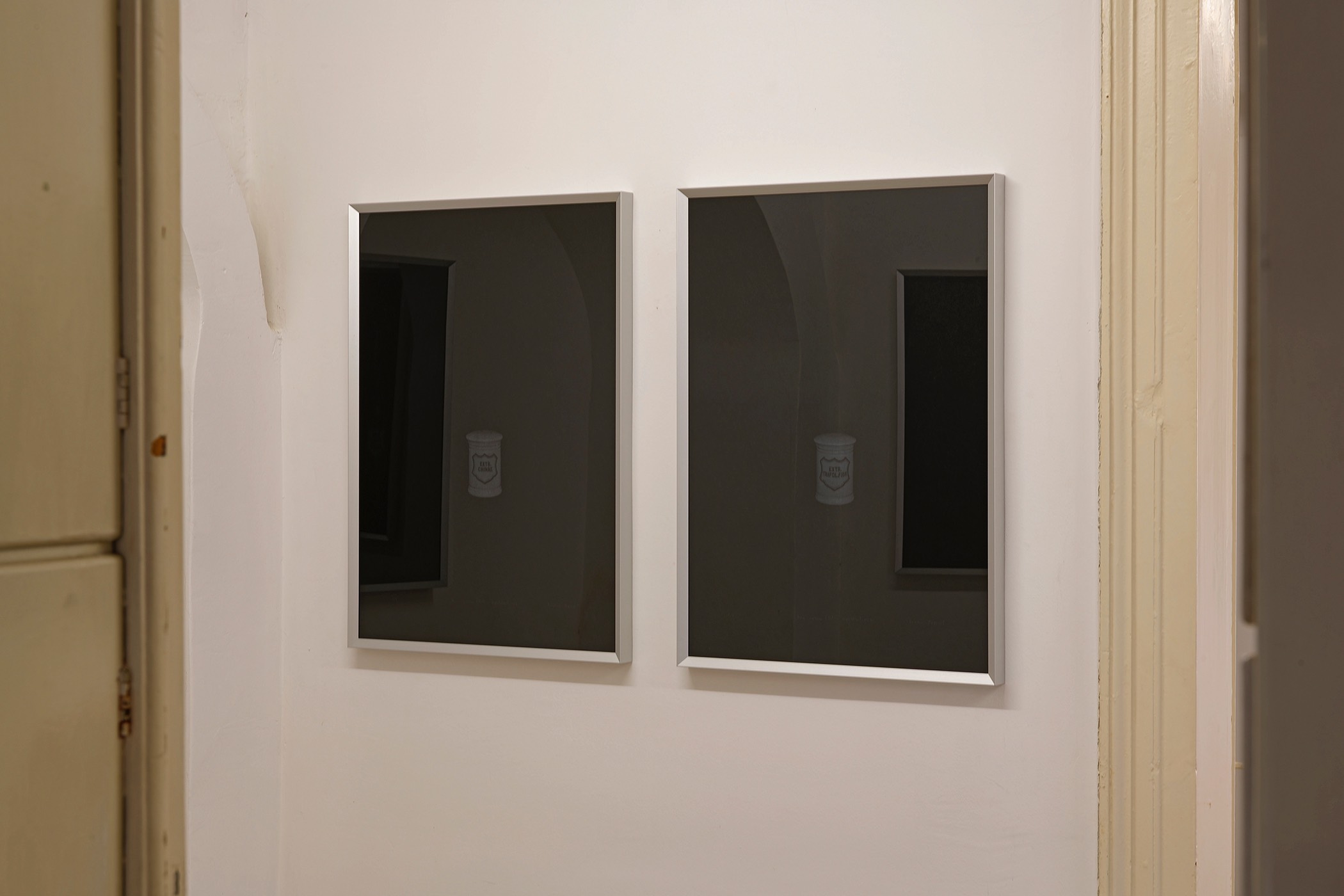 Furthermore, Viktor uses a series of his own photographs displayed in lightboxes to interpret the layered intricacies of the pharmacy space. These images primarily showcase fragments of the artist’s gaze, sometimes further complexified by multiple reflections. By focusing on emptiness and the passage of time, the artist shrouds the old pharmacy space in an aura of metaphysicality, using his meticulously refined aesthetic to convey what exists beyond sensory perception. This effect is evident both in the clear silhouettes of the photographs displayed in lightboxes and in the ethereal texture of the prints depicting the phantom apothecary vessels.