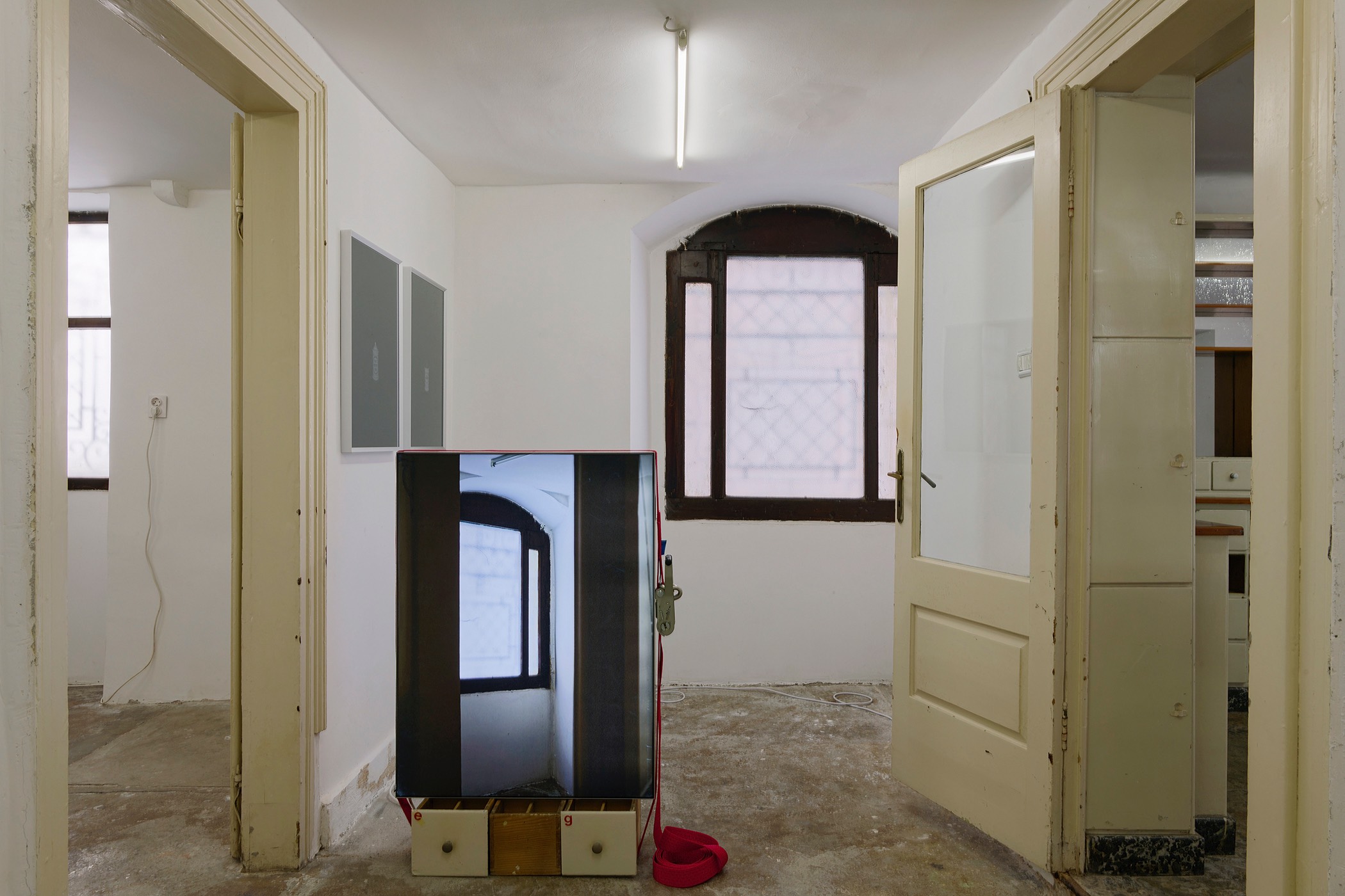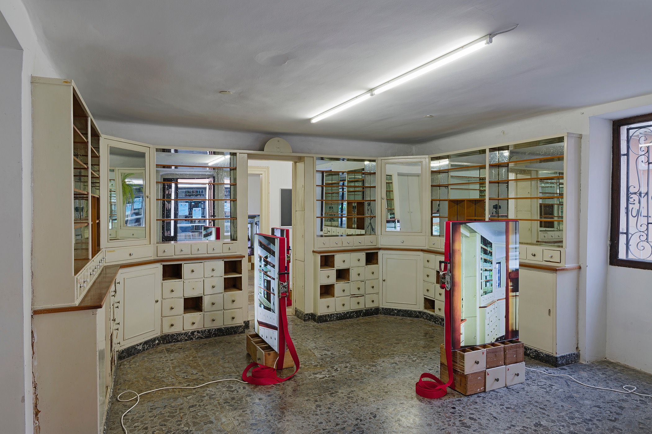 The abandoned pharmacy in the historic centre of Vodnjan – now the Space for Contemporary Art known as Apoteka – serves as the starting coordinate for Viktor Popović’s artistic intervention. While it is crucial to acknowledge the physical characteristics of this venue, the artist minimally engages with them in his work. Instead, he focuses on constructing a vivid interpretation of his own experience of the space, enriched by a complementary exploration of its lost content. The space itself bears a physical reminder of its former function, with its striking white pharmaceutical furnishings now devoid of their original contents. Indeed, the glazed sections of the cabinets and their closed drawers no longer hold the distinctive ceramic or glass apothecary jars, measuring instruments, specialist books, or other items. Nevertheless, the space unmistakably retains a memory of these objects. It appears that the emphasis on this phantom presence is a key element of the artist’s work in Vodnjan. The exploration of archives and the personal interpretation of their contents has long been integral to Viktor Popović’s artistic research methodology. In this approach, the artist examines the presence and meaning of historical sites or documents within the context of contemporary concerns. Popović views the archive as a dynamic material that prompts investigation into various topics, which, in a broad sense, could encompass concepts such as health and hygiene in the modern era.