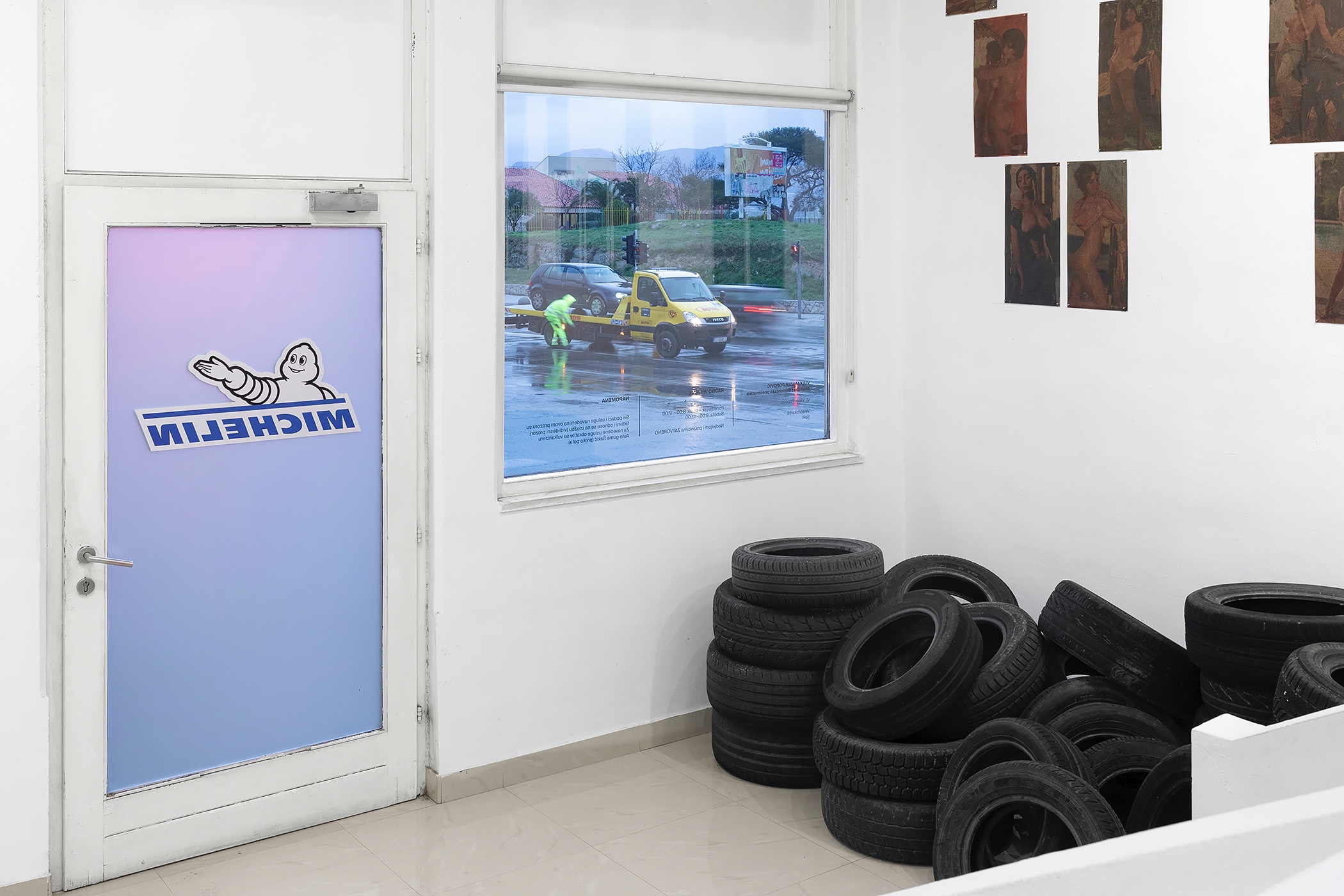 Studio 21 Gallery occupies a particular and somewhat amorphous urban context on the outskirts of Split, an area characterised primarily by family houses with ground floors given over to small-scale commercial and service activities. Despite having operated at this address since 2014, the gallery is frequently located, even by its regular visitors, by reference to the well-known tyre repair shop next door. Conversely, it is unclear to what extent the workshop’s clientele register that exhibitions of contemporary art and an active educational programme take place directly opposite. Attentive to this specific social interplay, Popović enacts a calculated inversion (or diversion), effectively recasting the gallery space as a tyre repair workshop.