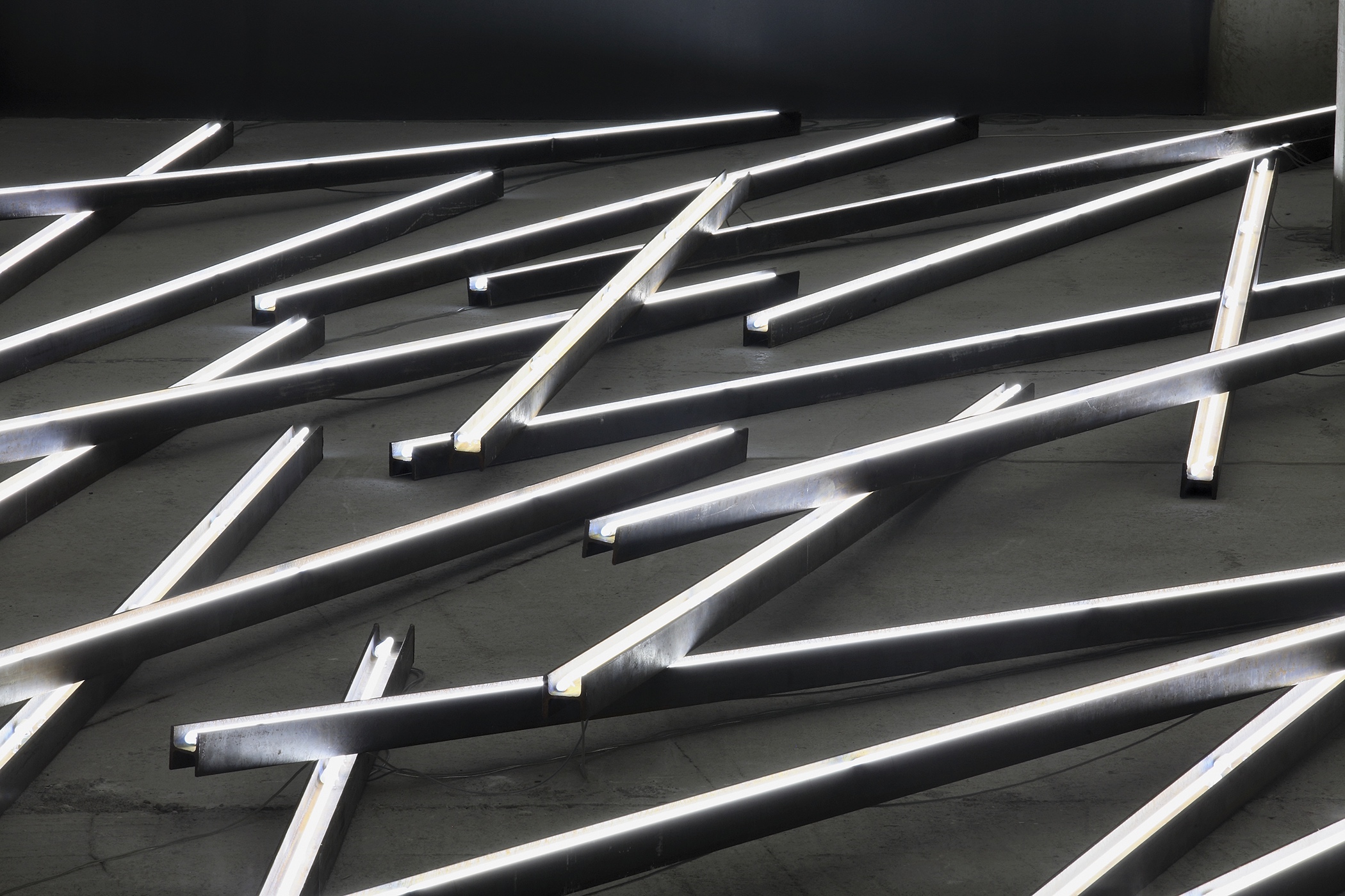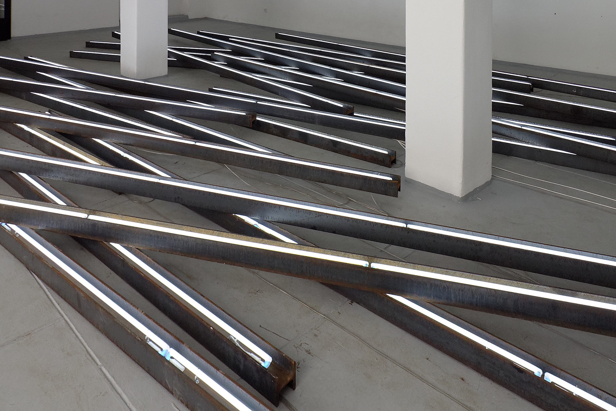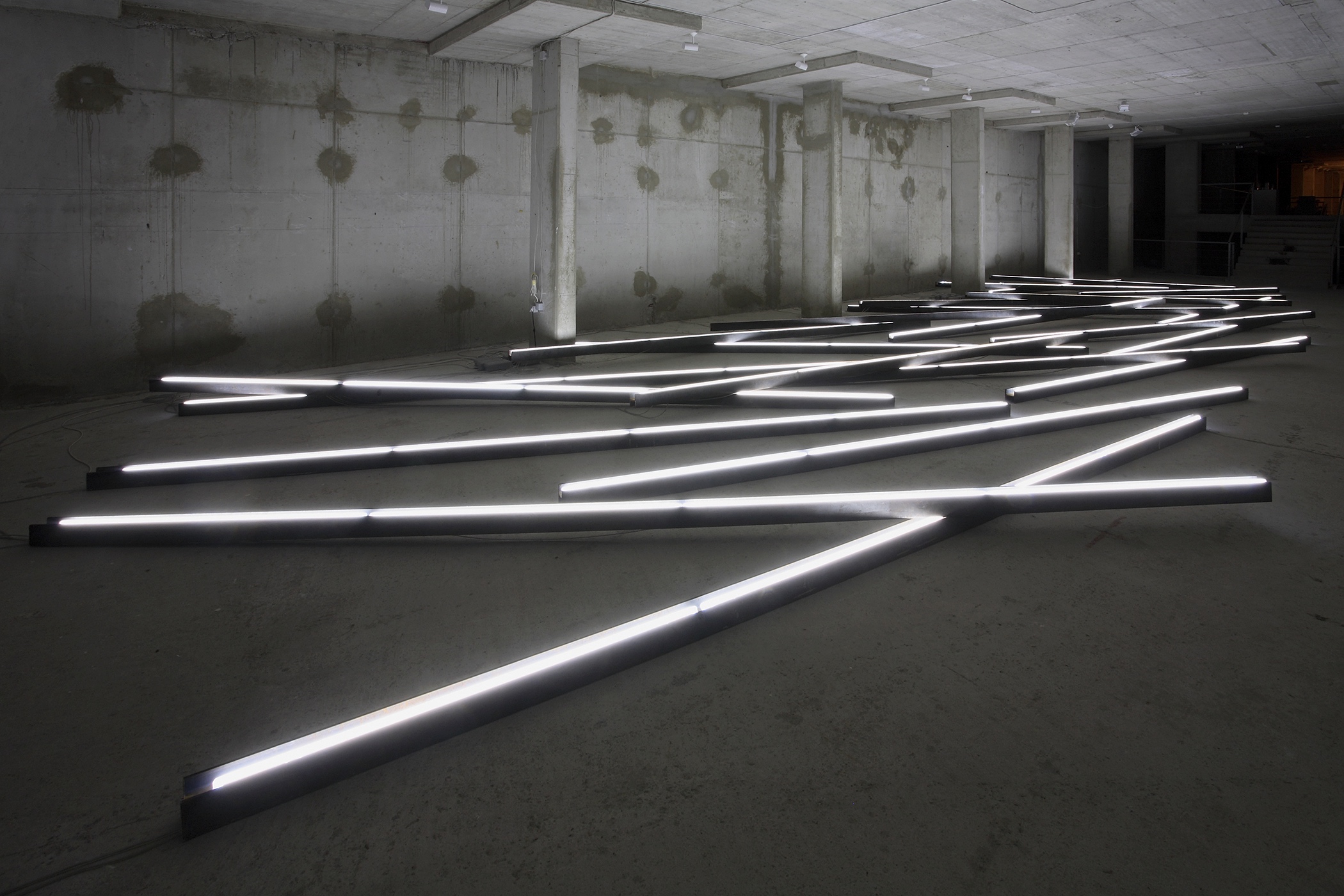 Spatial installation consisting of 24 pieces of 6-meter steel beams with associated argon light tubes. The dynamics of the work is achieved by superimposing and different orientation of linear elements.