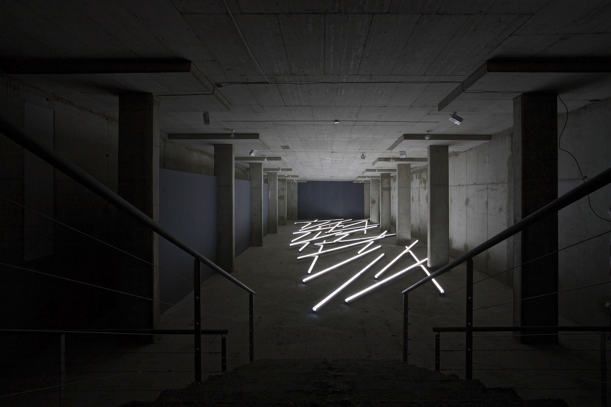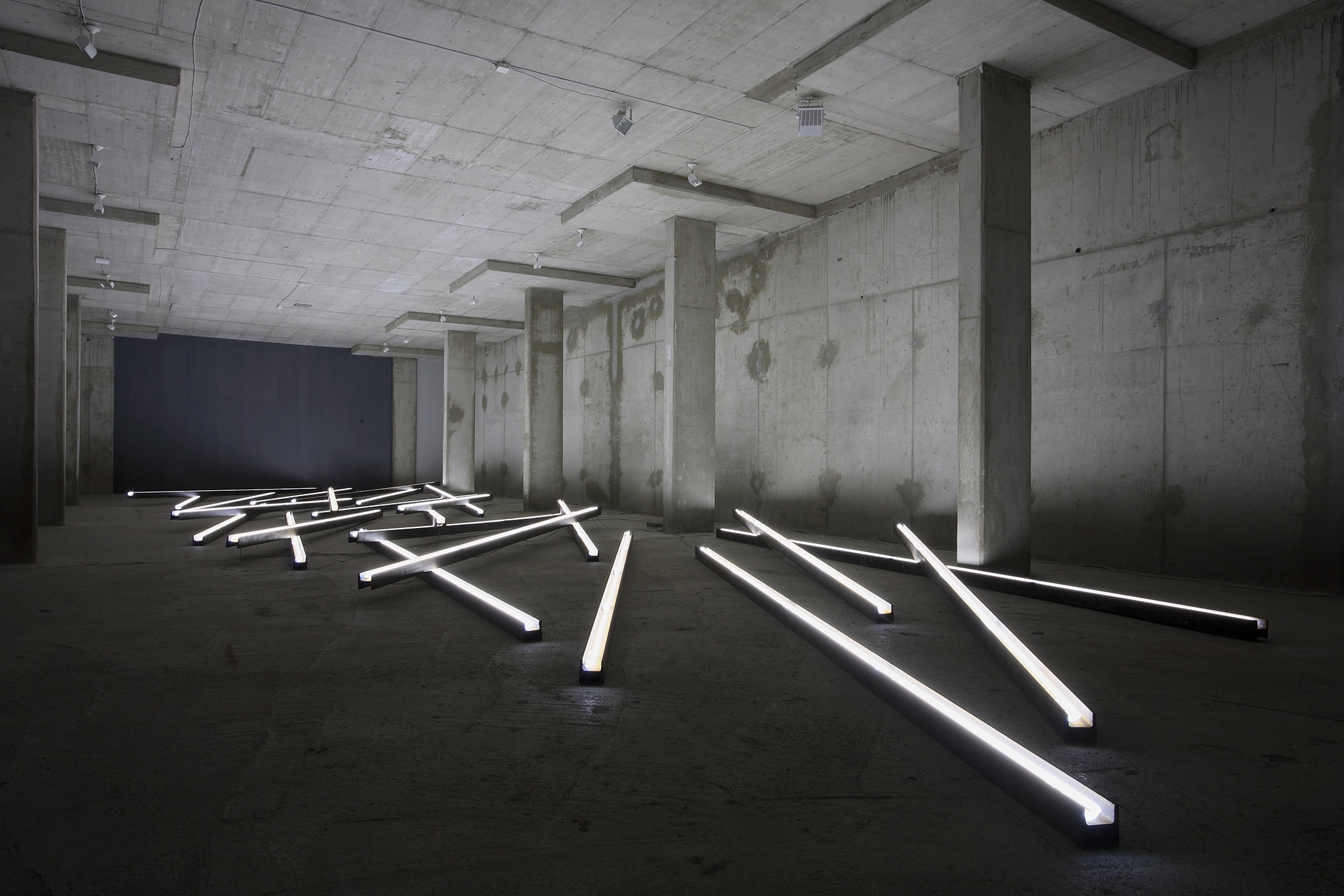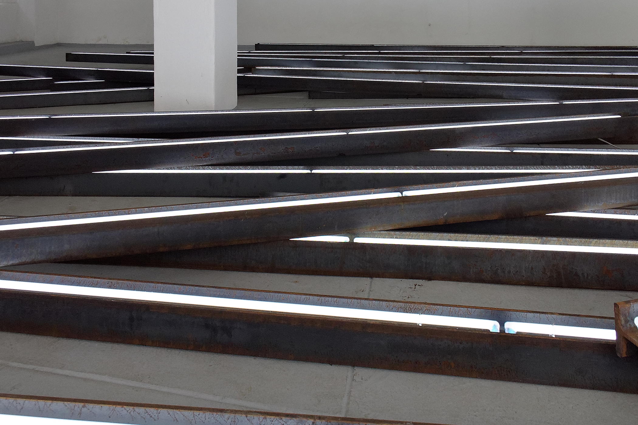 Spatial installation consisting of 24 pieces of 6-meter steel beams with associated argon light tubes. The dynamics of the work is achieved by superimposing and different orientation of linear elements.