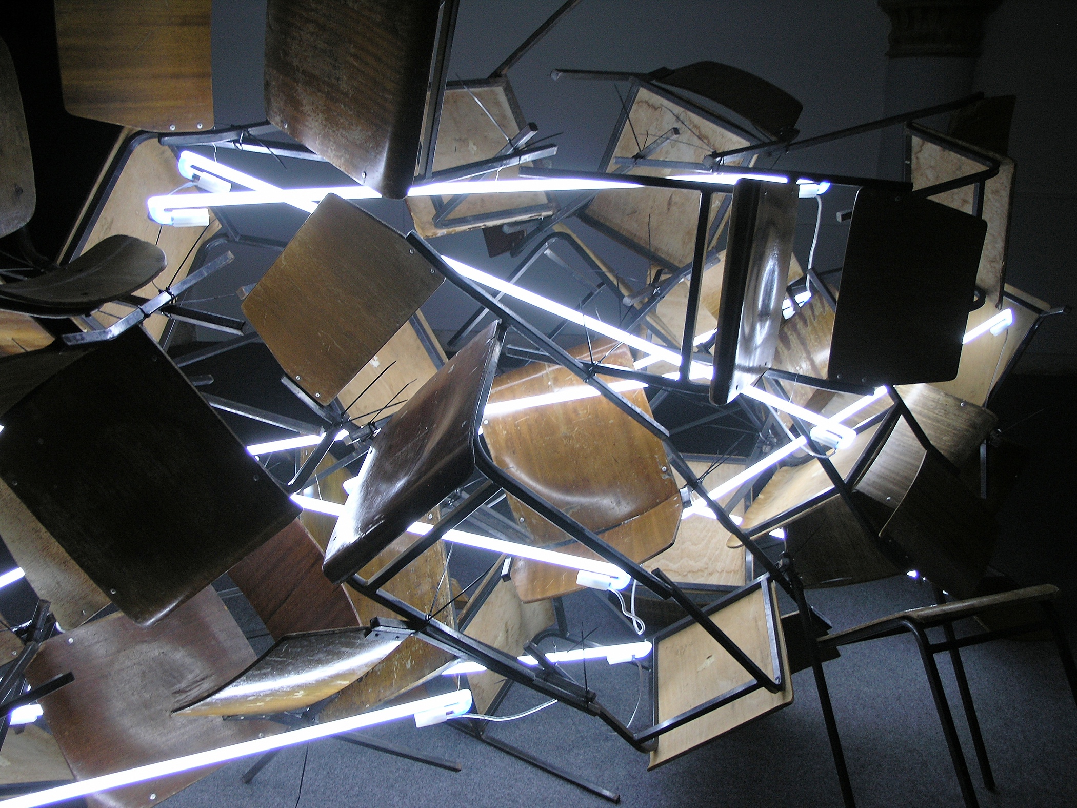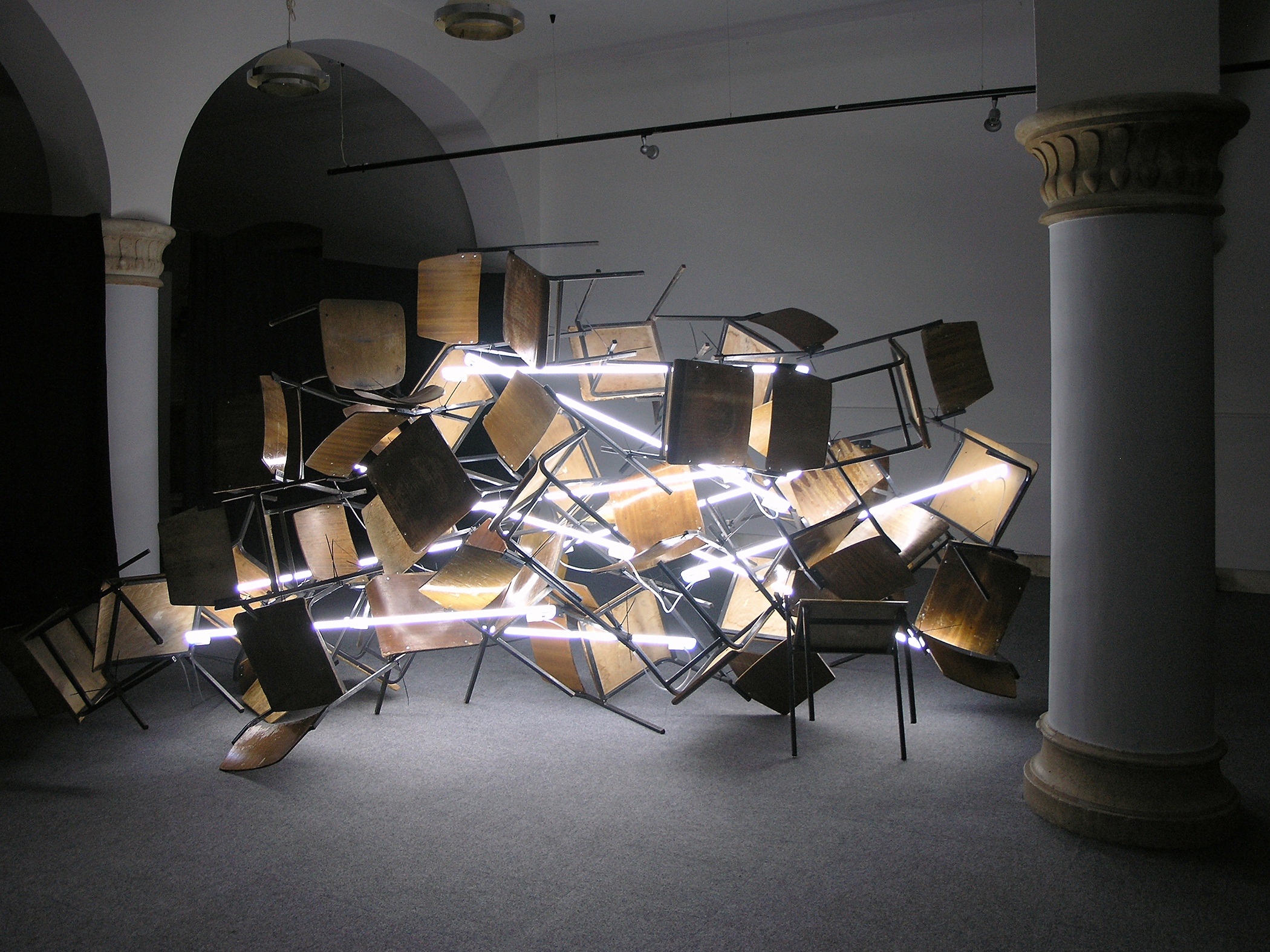 Site-specific installation made from used chairs in different locations. In the City Reading Room of Komiža in 2006, the chaoticness of structure of chairs from Komiža Elementary School (previously used at the Reading Room), seemingly thrown together, was visually balanced and connected by argon light tubes, transforming them into an exhibit. Visible traces of use established a direct link with the context, so the change in the role of the objects was multiply encoded. For the 2006 exhibition at the Portland Art Center in Portland, Oregon, people were invited to lend their chairs for the installation. From one reality, in which they served their original function, the chairs were moved to the reality of the exhibition space with all the connotations that this space entailed. Following the return of the objects to their everyday life, they kept the “invisible” layer of meaning. In the installation which was created for the exhibition T-HT nagrada@msu.hr at the Museum of Contemporary Art (