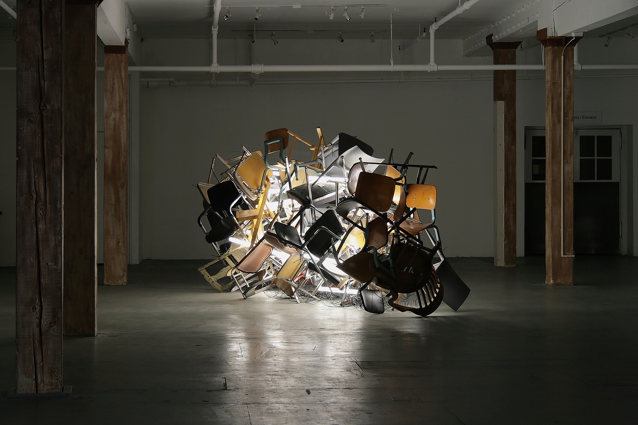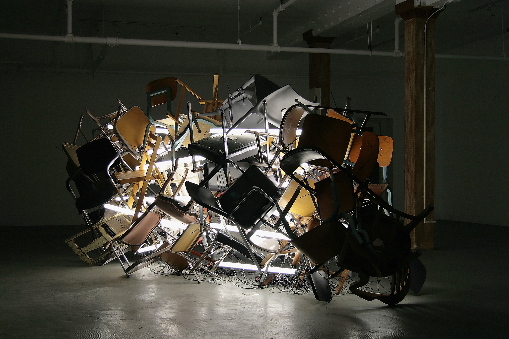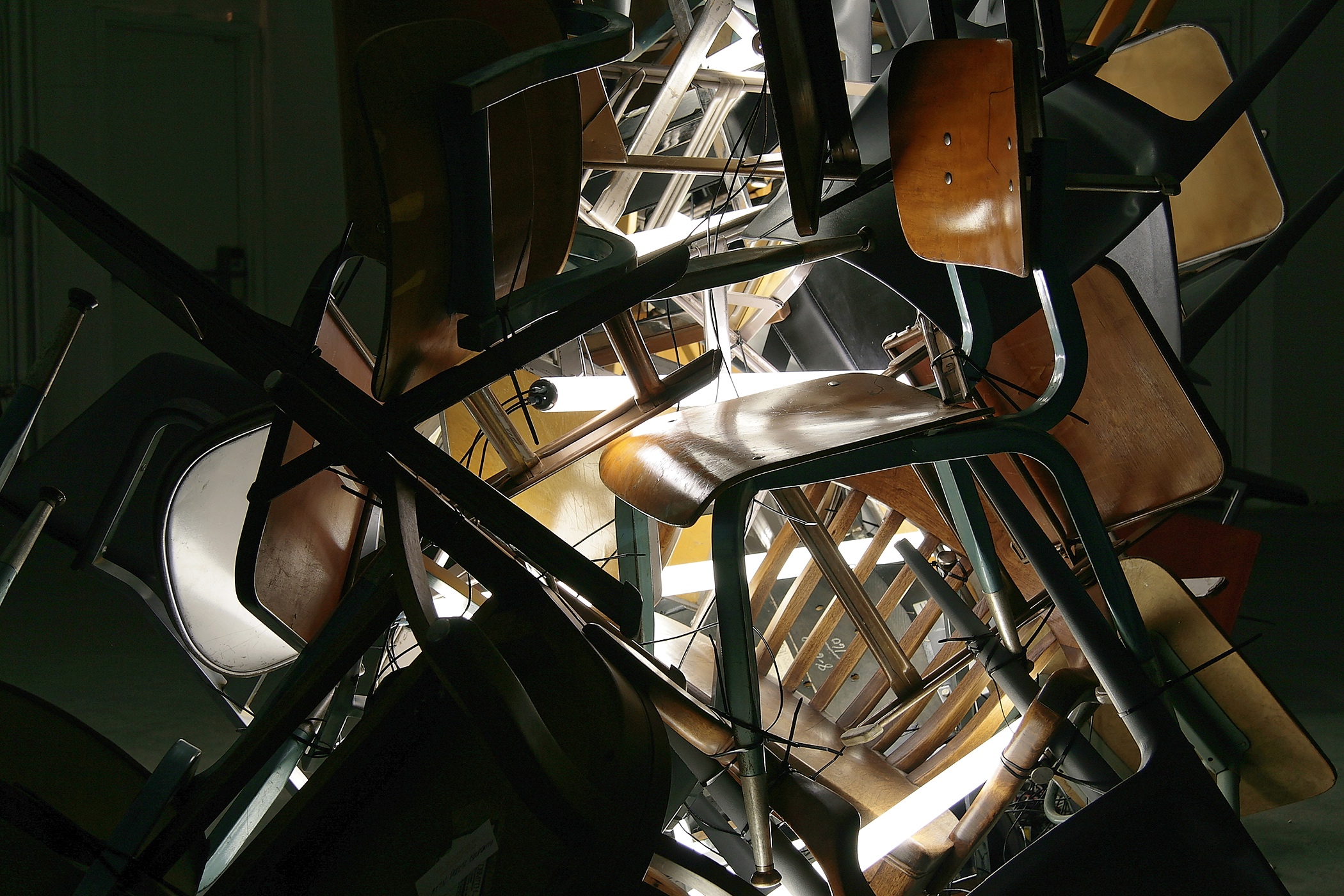 The installation was made from chairs borrowed from acquaintances during a residency in Portland, Oregon, USA. Items were removed from their original context, preventing their use as functional objects and thus gaining a new artistic context. The procedure is very straightforward, there is no simulation – the chairs are attached to a seemingly chaotic pile. Now come to the fore their shape, their ability to create a visually interesting whole. Chairs each carrying its own story indicated traces of wear, as opposed to glowing neon tubes placed within the installation. On one side are worn everyday use items, the other cold, the light that defines them almost symbolically transformed into the exhibition display. The process ends when after the closing of the exhibition, each chair returns to the owner in its original context. No penetration of art and real life does not stop there, because when the item again becomes a mere object, is enriched by the memory of his artistic existence.