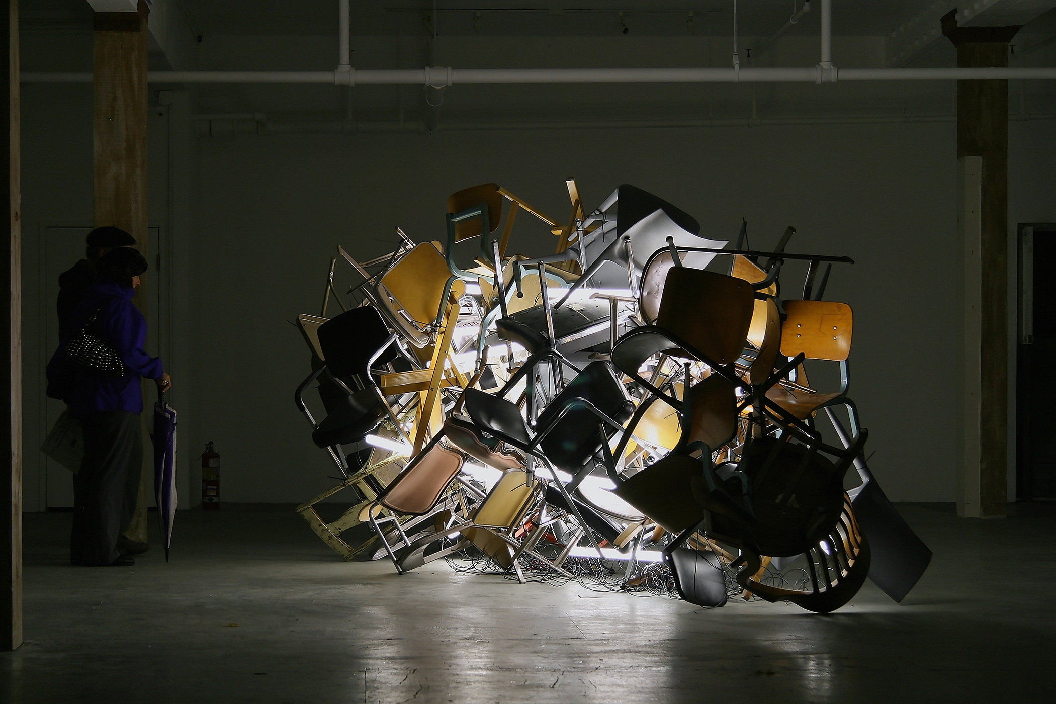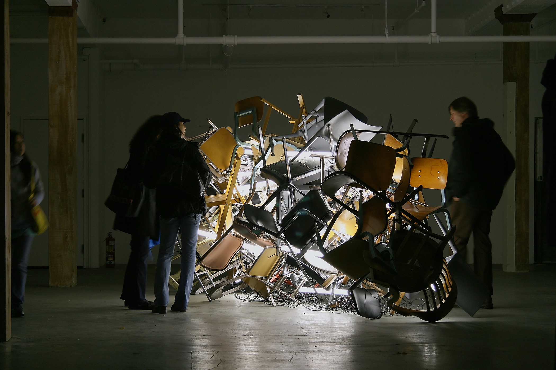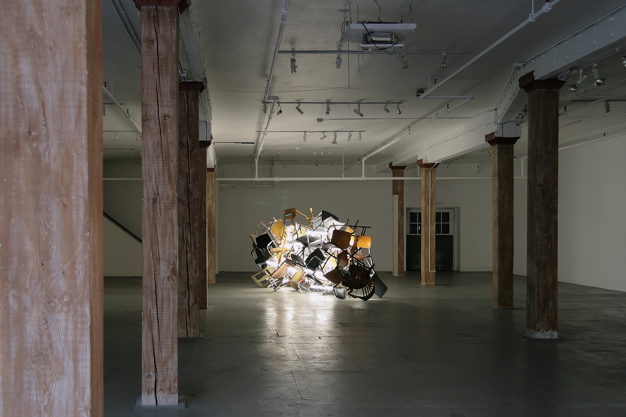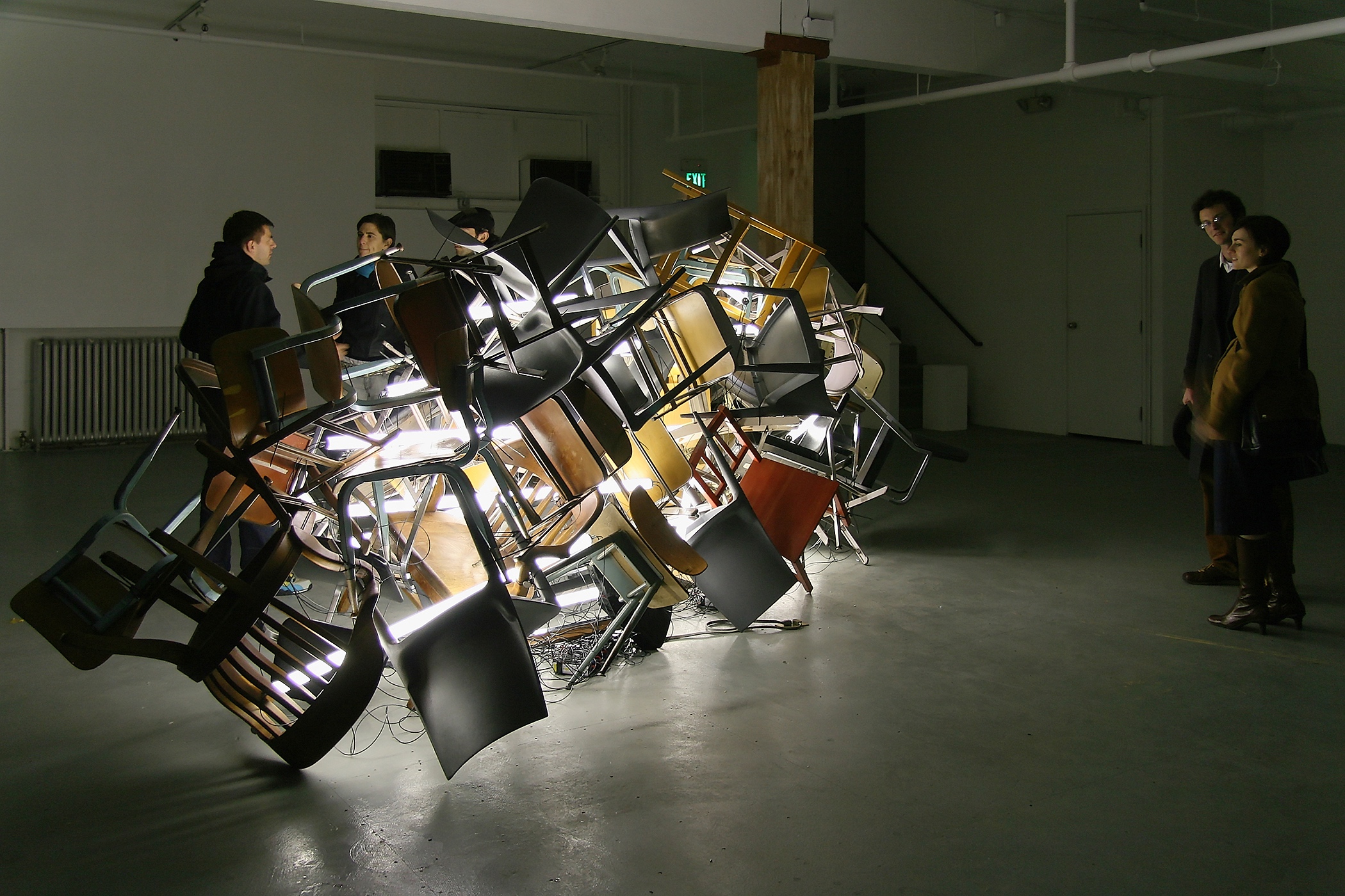 The installation was made from chairs borrowed from acquaintances during a residency in Portland, Oregon, USA. Items were removed from their original context, preventing their use as functional objects and thus gaining a new artistic context. The procedure is very straightforward, there is no simulation – the chairs are attached to a seemingly chaotic pile. Now come to the fore their shape, their ability to create a visually interesting whole. Chairs each carrying its own story indicated traces of wear, as opposed to glowing neon tubes placed within the installation. On one side are worn everyday use items, the other cold, the light that defines them almost symbolically transformed into the exhibition display. The process ends when after the closing of the exhibition, each chair returns to the owner in its original context. No penetration of art and real life does not stop there, because when the item again becomes a mere object, is enriched by the memory of his artistic existence.