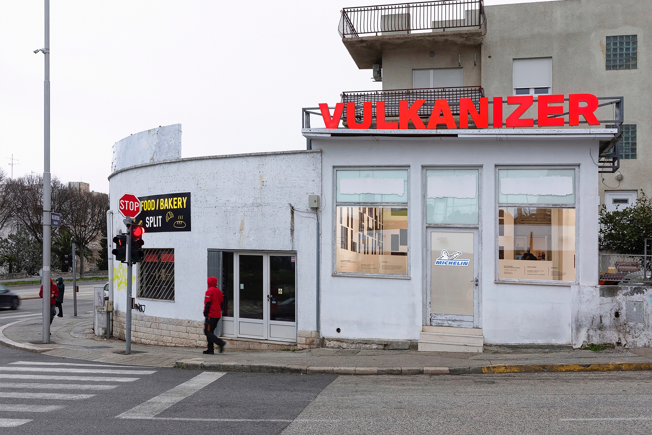 Untitled (Vulcanizer Popović) is a site-specific installation developed for Studio 21 Gallery in Split, located in a part of the city characterised by small service workshops and automotive repair businesses. Taking this immediate urban context as its starting point, the project temporarily transforms the gallery into a simulated tyre repair shop.
