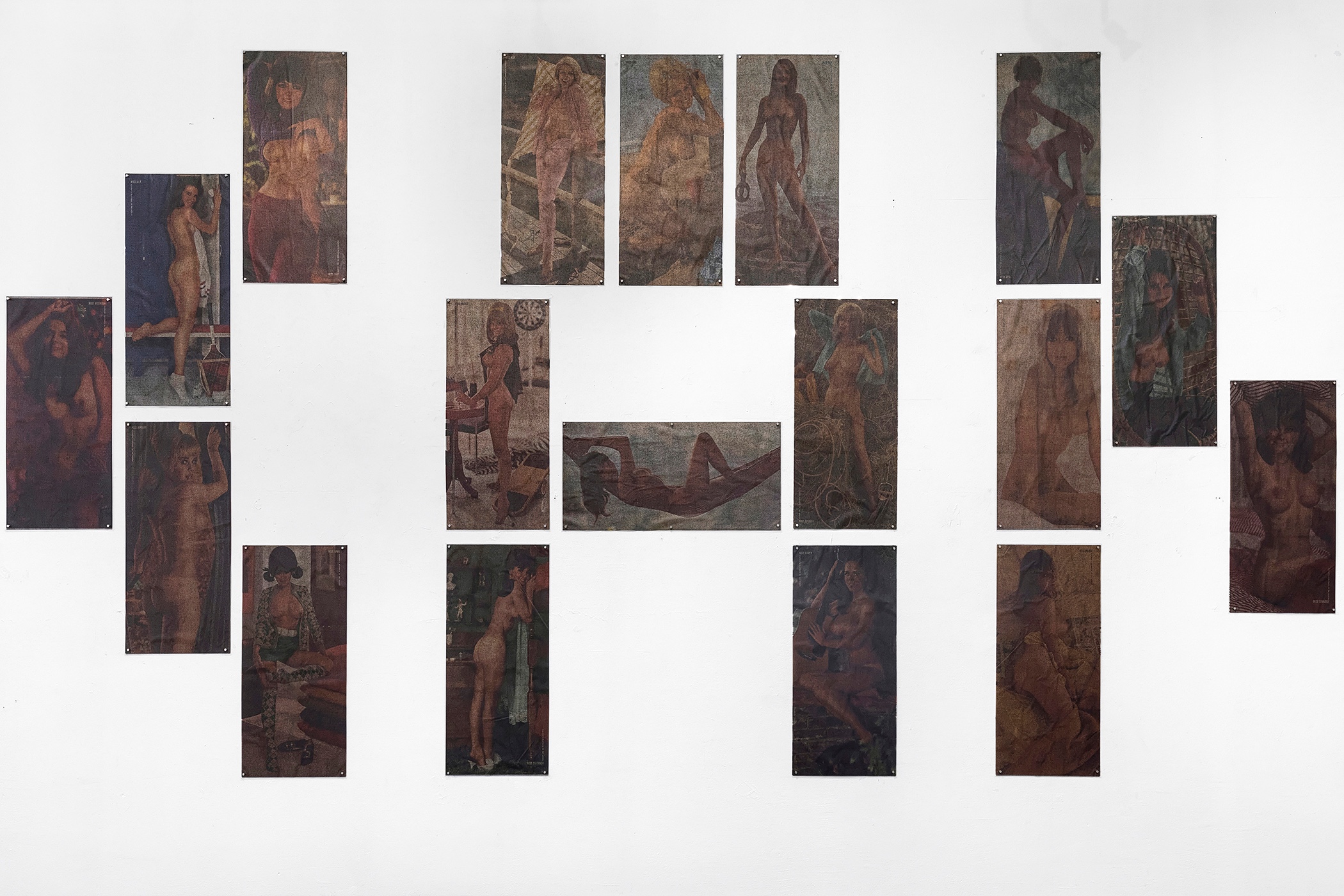 A large illuminated sign reading VULCANIZER is installed on the roof of the building, while the gallery interior is filled with used car tyres borrowed from a neighbouring workshop. The walls are covered with archival centerfolds from the American edition of Playboy from the 1960s and 1970s, arranged to spell the same word. Each centerfold is covered with a thin sheet of paper soaked in used motor oil, creating a translucent filter that both softens and “de-vulgarises” the imagery while simultaneously introducing the material and olfactory traces of the workshop environment.