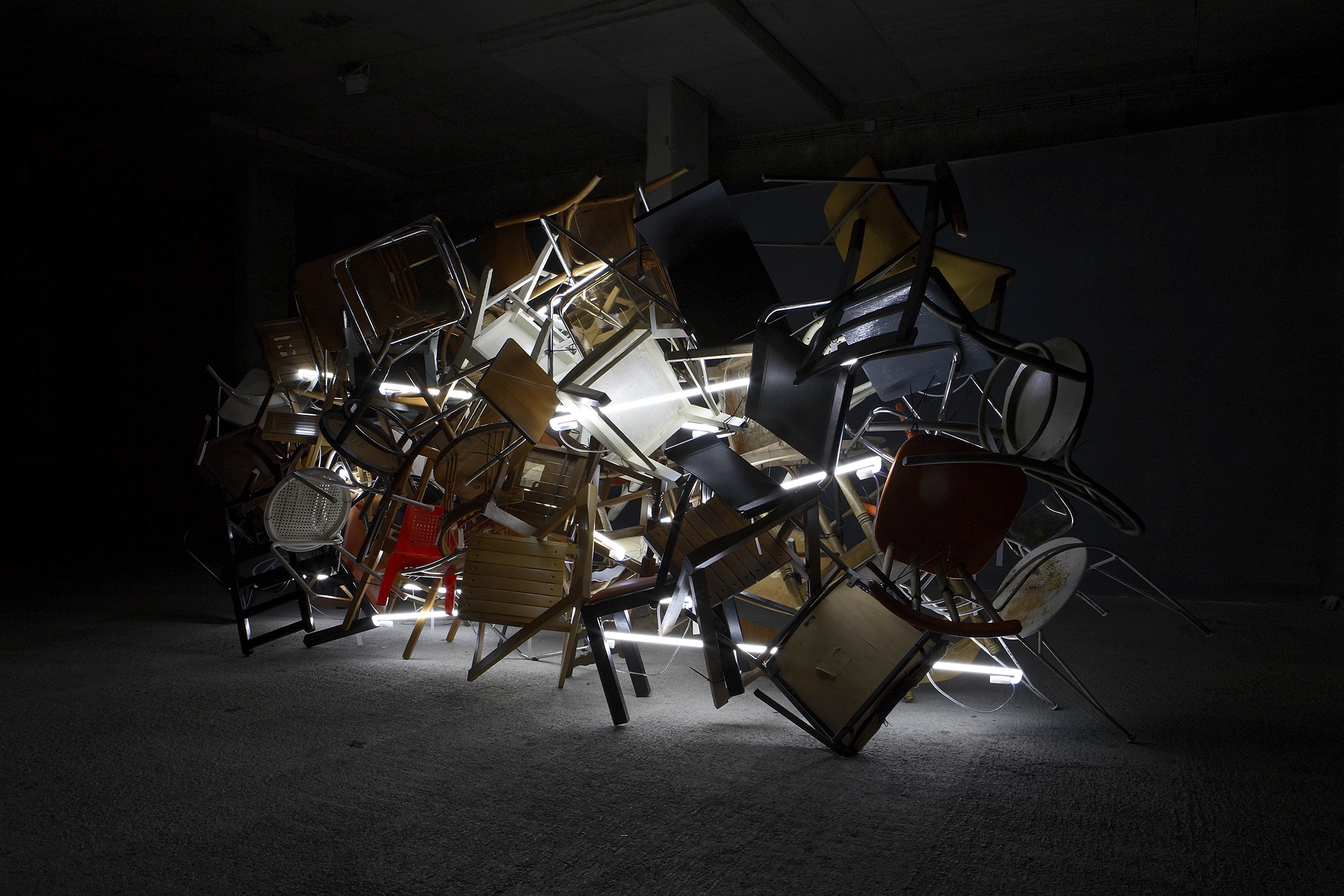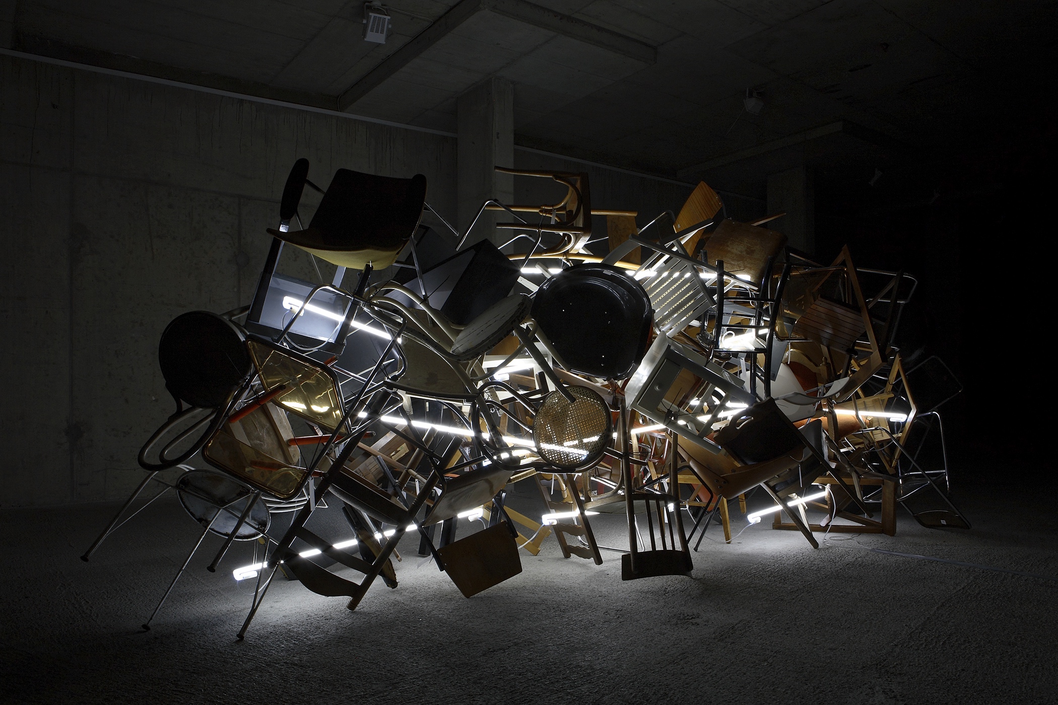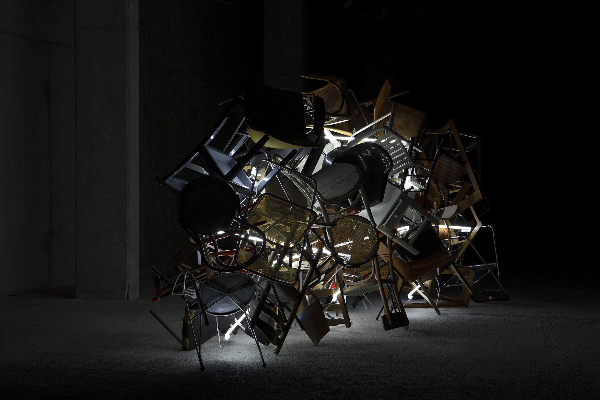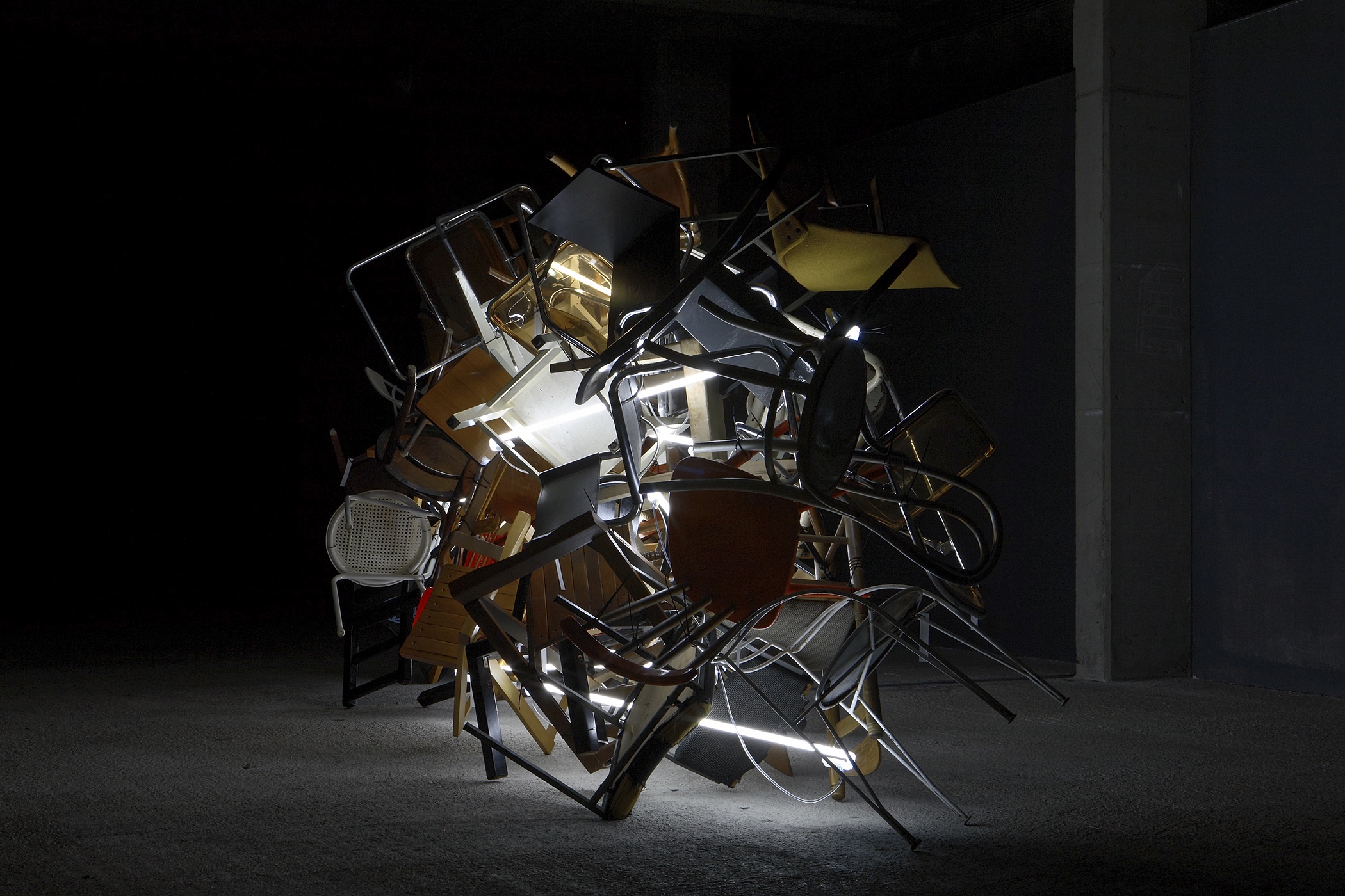 The installation was made from borrowed chairs via invitations sent to potential visitors to the exhibition in Split, Croatia. Items were removed from their original context, preventing their use as functional objects and thus gaining a new artistic context. The procedure is very straightforward, there is no simulation – the chairs are attached to a seemingly chaotic pile. Now come to the fore their shape, their ability to create a visually interesting whole. The chairs, each carrying their own story, indicate traces of wear, in contrast to the luminous fluorescent tubes placed within the installation. On one side are worn objects of daily use, on the other cold, the light that defines them is almost symbolically transformed into the exhibition display. The process ends when, after the closing of the exhibition, each chair is returned to the owners in its original context. No penetration of art and real life does not stop there, because when the items become mere objects again, are enriched by the memory of their artistic existence.