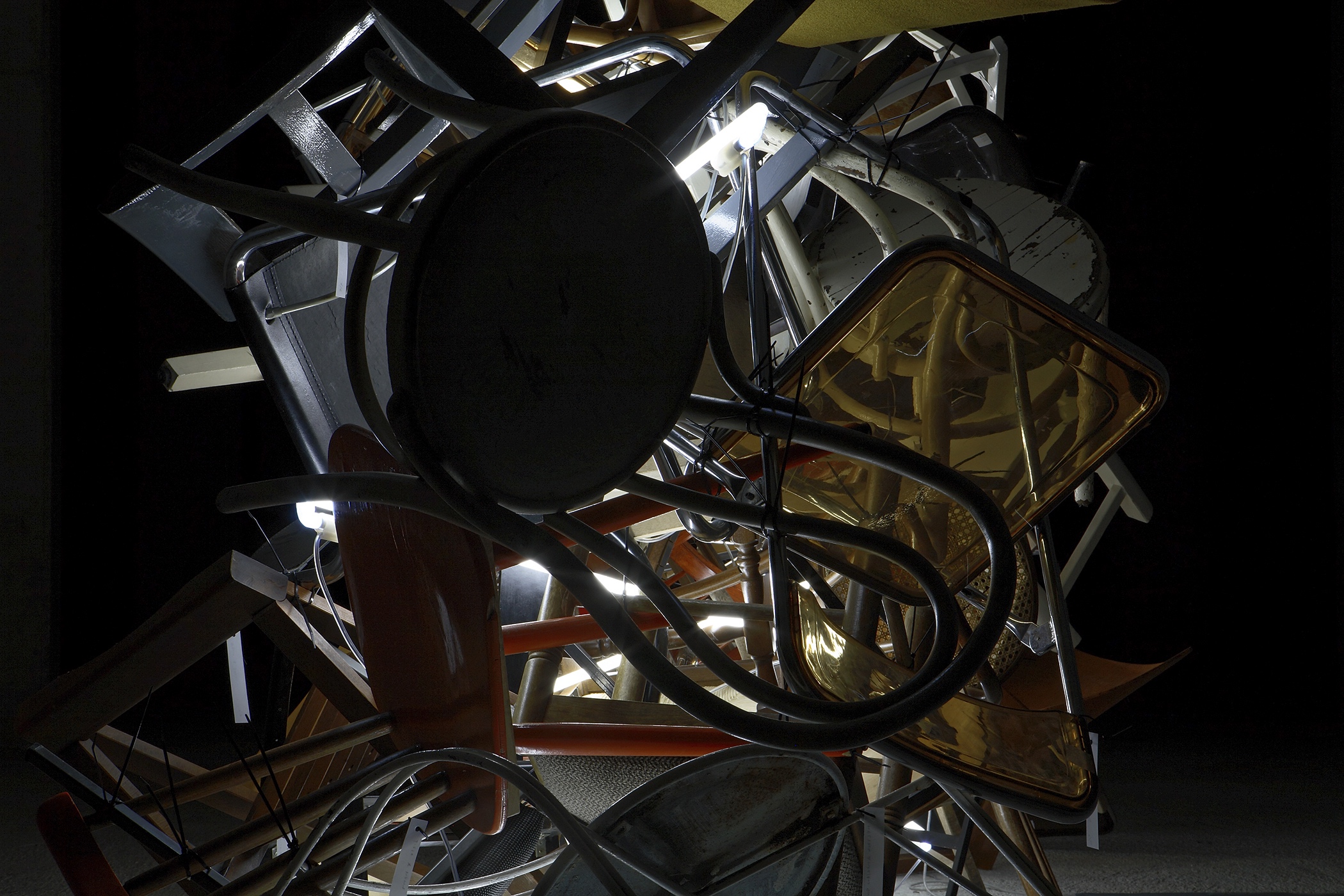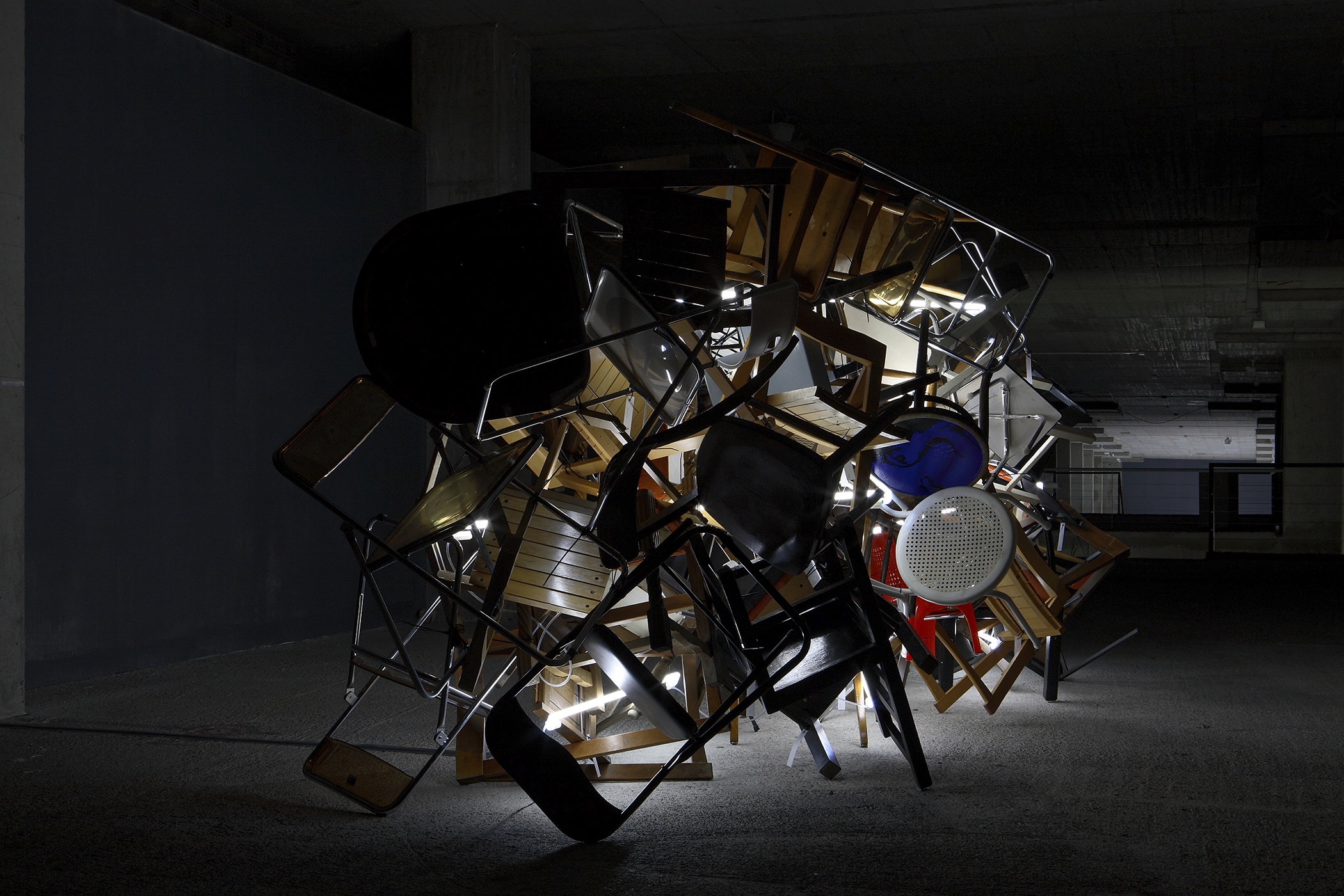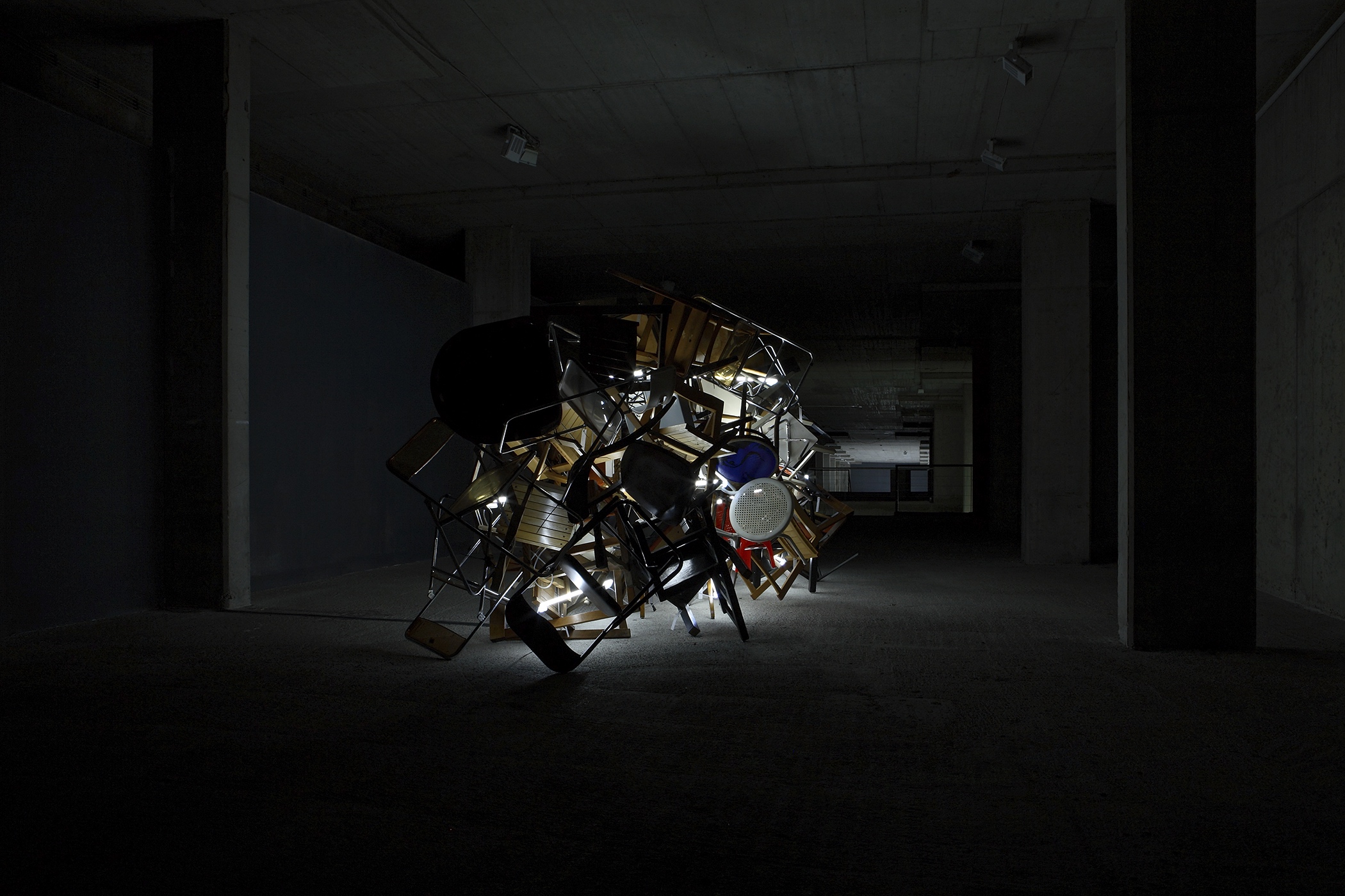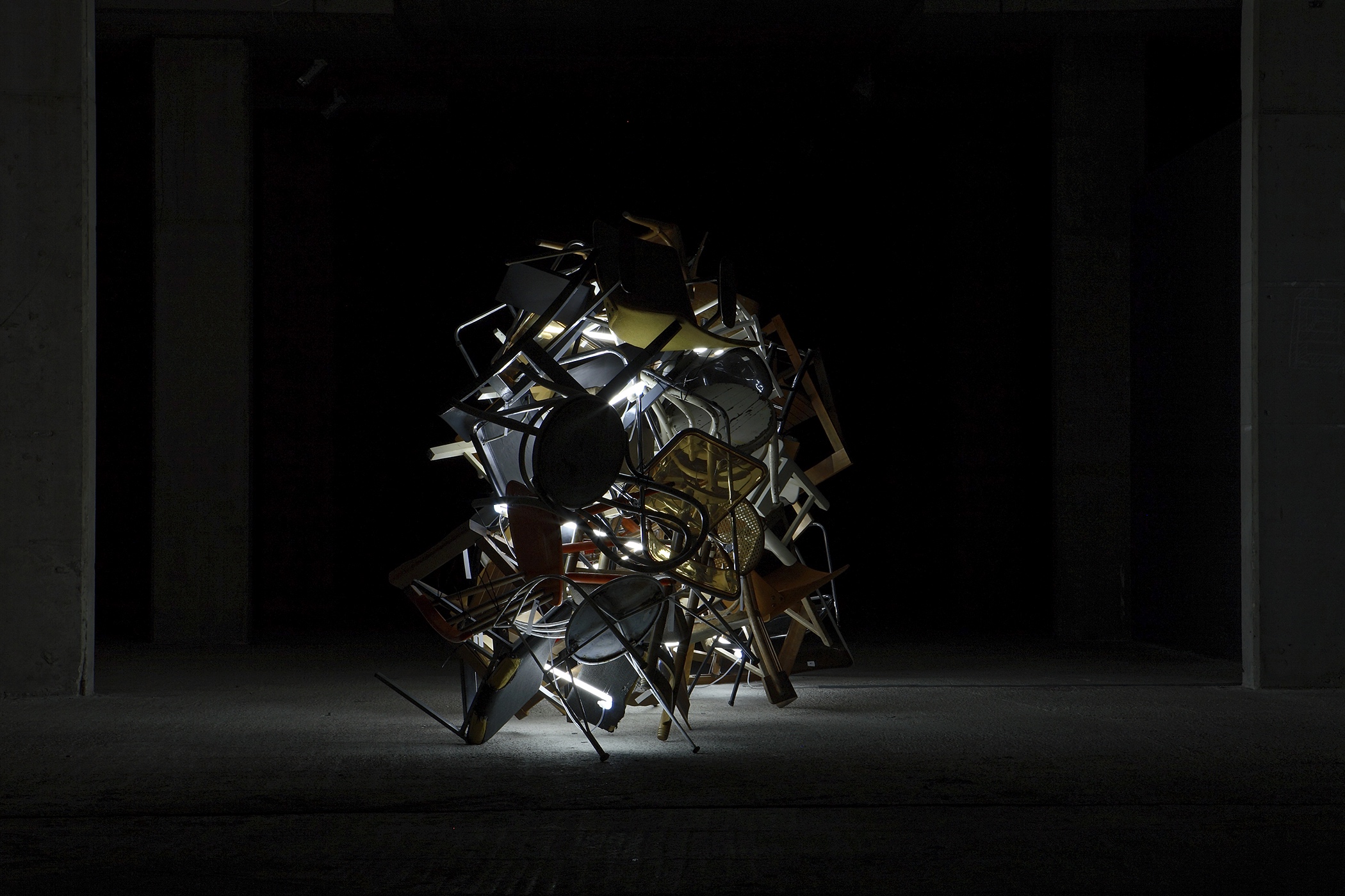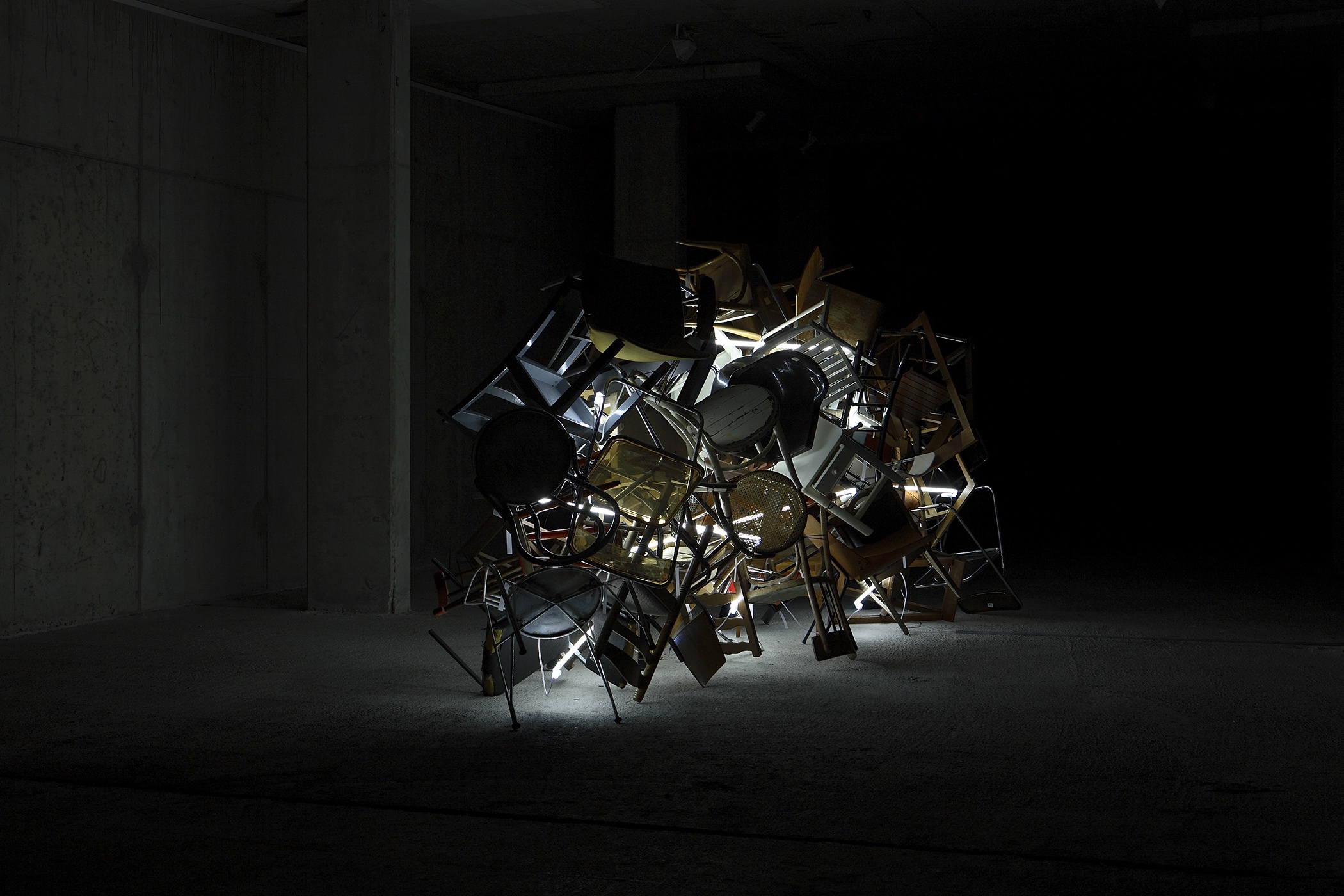 The installation was made from borrowed chairs via invitations sent to potential visitors to the exhibition in Split, Croatia. Items were removed from their original context, preventing their use as functional objects and thus gaining a new artistic context. The procedure is very straightforward, there is no simulation – the chairs are attached to a seemingly chaotic pile. Now come to the fore their shape, their ability to create a visually interesting whole. The chairs, each carrying their own story, indicate traces of wear, in contrast to the luminous fluorescent tubes placed within the installation. On one side are worn objects of daily use, on the other cold, the light that defines them is almost symbolically transformed into the exhibition display. The process ends when, after the closing of the exhibition, each chair is returned to the owners in its original context. No penetration of art and real life does not stop there, because when the items become mere objects again, are enriched by the memory of their artistic existence.