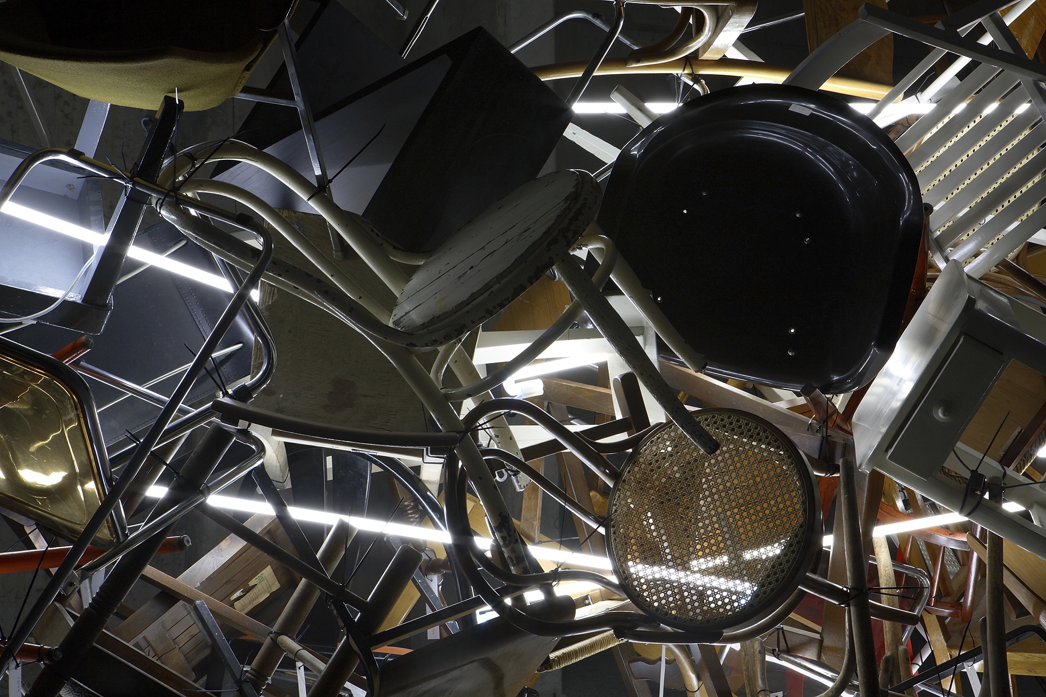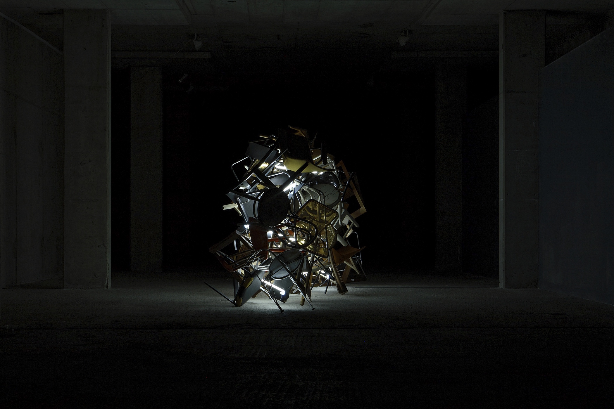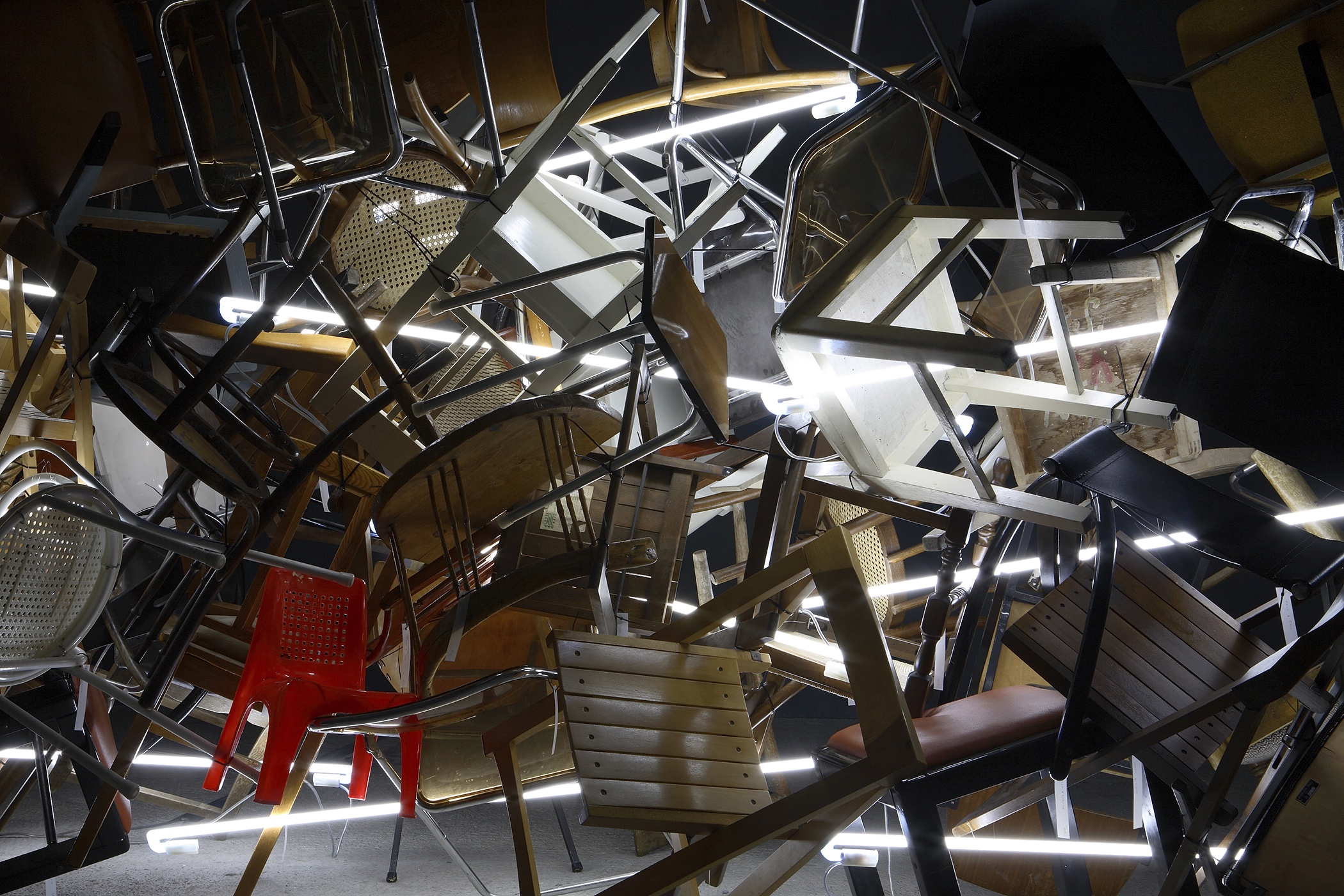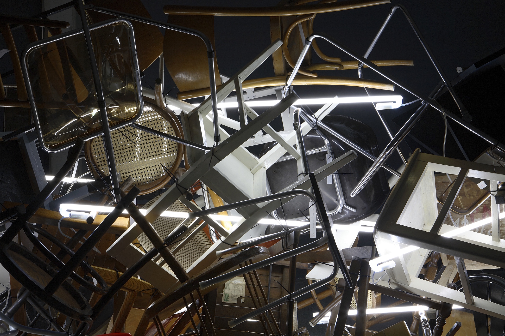 The installation was made from borrowed chairs via invitations sent to potential visitors to the exhibition in Split, Croatia. Items were removed from their original context, preventing their use as functional objects and thus gaining a new artistic context. The procedure is very straightforward, there is no simulation – the chairs are attached to a seemingly chaotic pile. Now come to the fore their shape, their ability to create a visually interesting whole. The chairs, each carrying their own story, indicate traces of wear, in contrast to the luminous fluorescent tubes placed within the installation. On one side are worn objects of daily use, on the other cold, the light that defines them is almost symbolically transformed into the exhibition display. The process ends when, after the closing of the exhibition, each chair is returned to the owners in its original context. No penetration of art and real life does not stop there, because when the items become mere objects again, are enriched by the memory of their artistic existence.